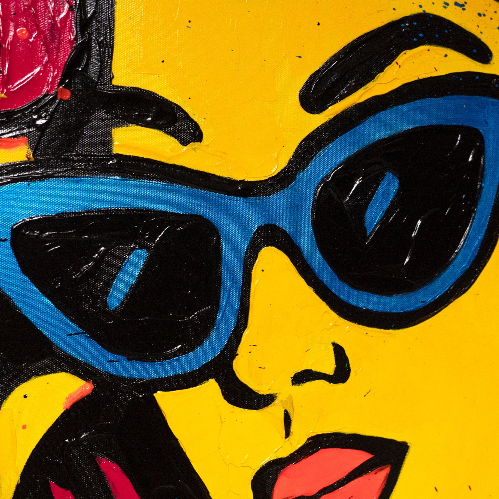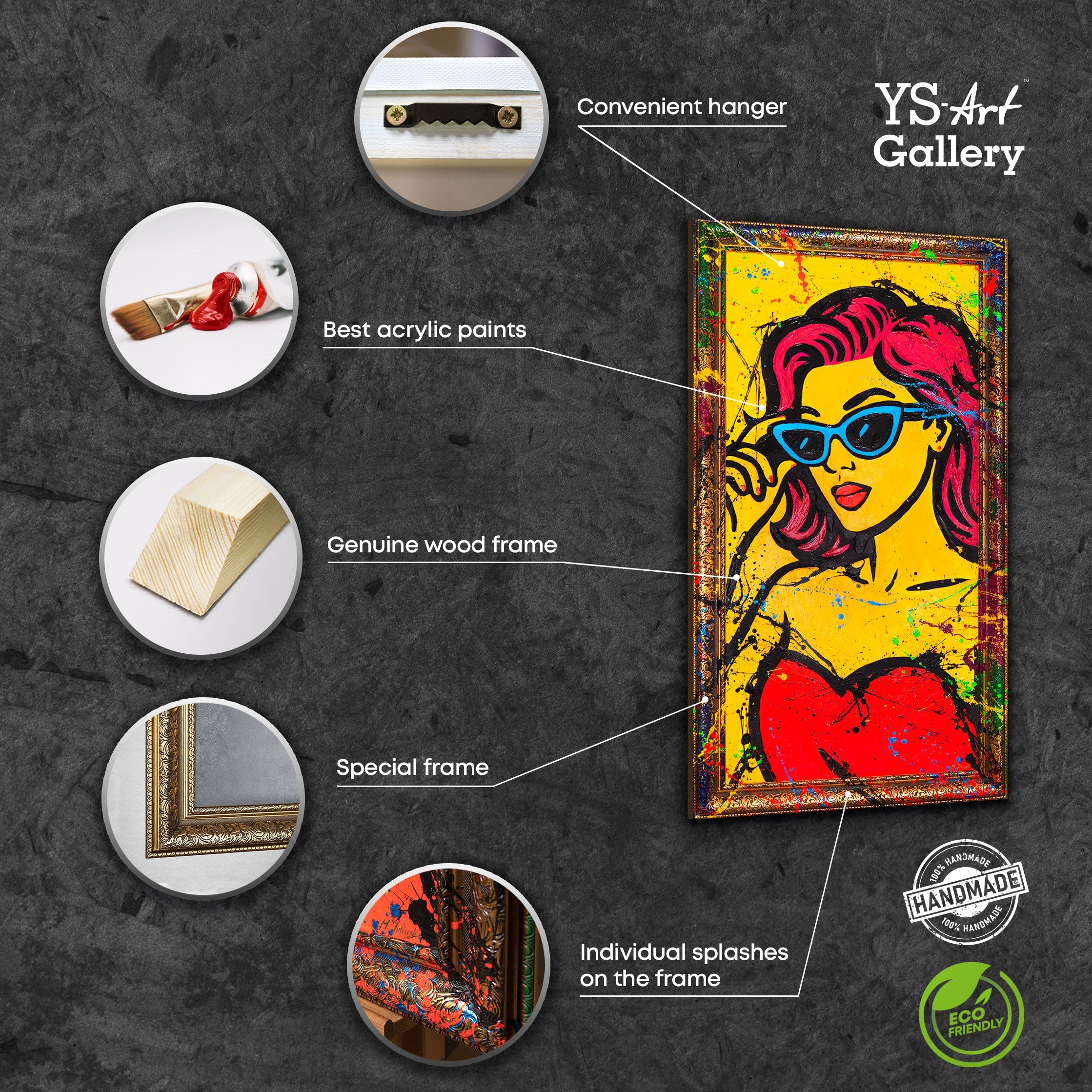 Das handgemalte Leinwandbild „Miss WOW“ ist ein echter Blickfang: Eine Frau im Pop-Art Comic-Stil mit leuchtend gelben und roten Farben, akzentuiert durch kräftige Linien und urbane Energie.