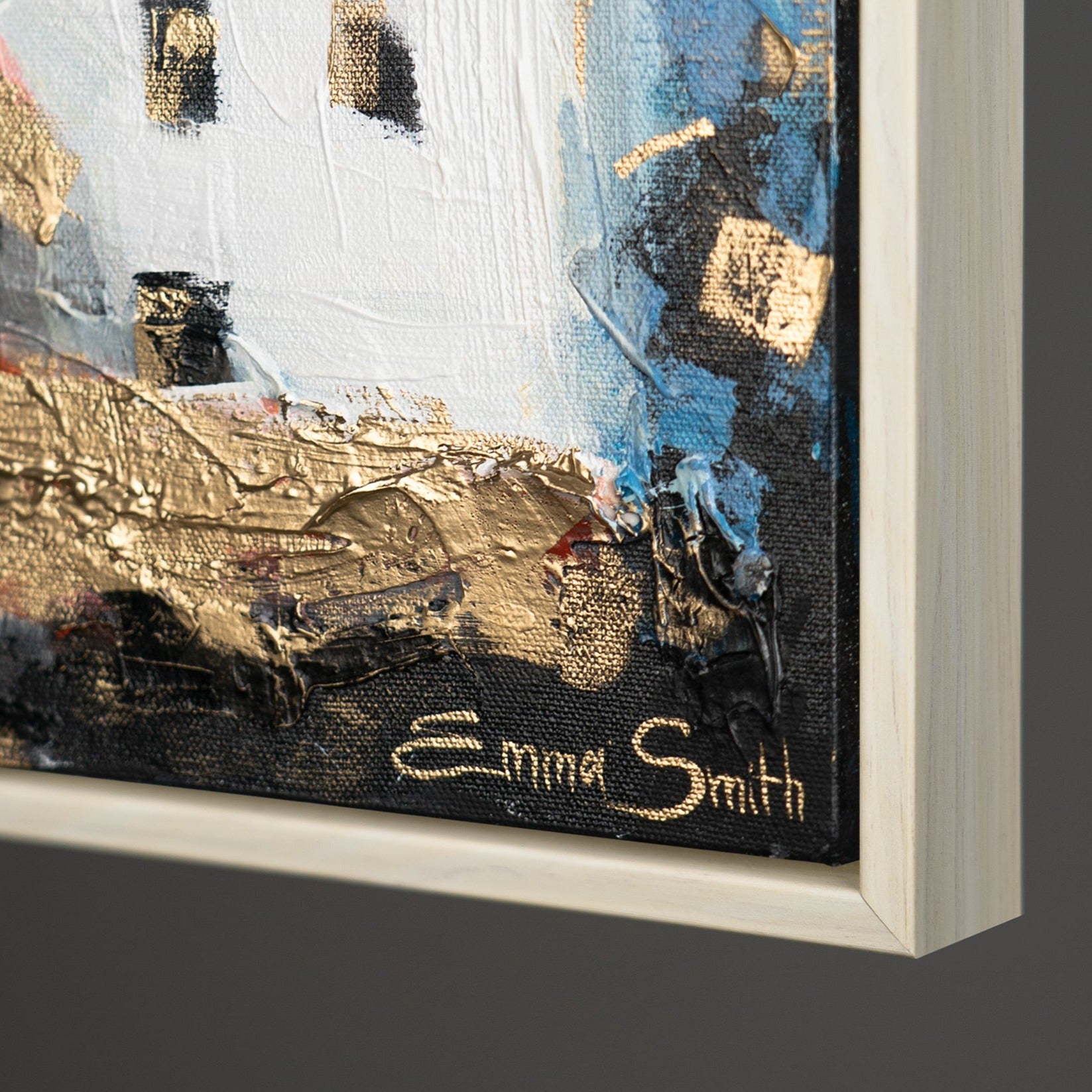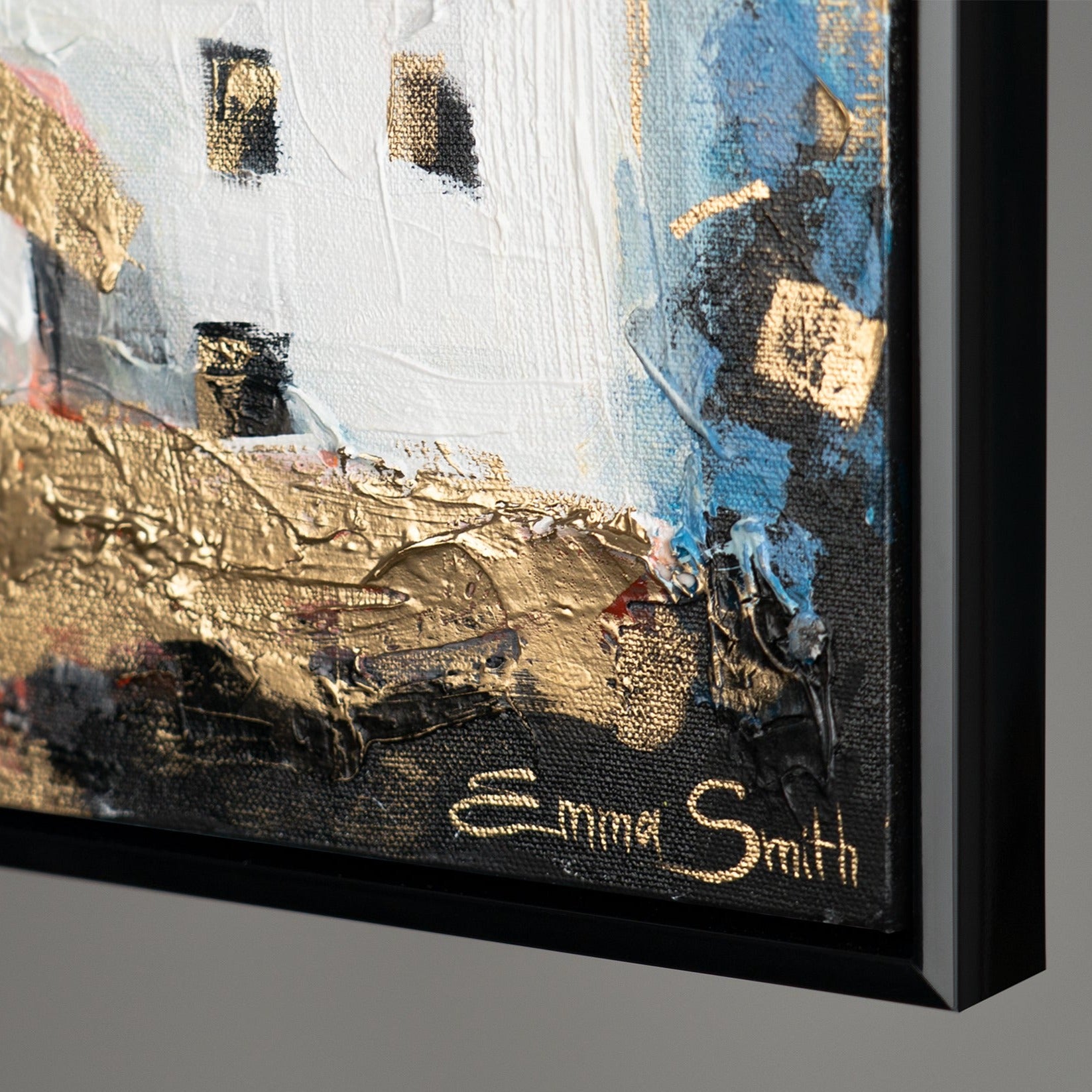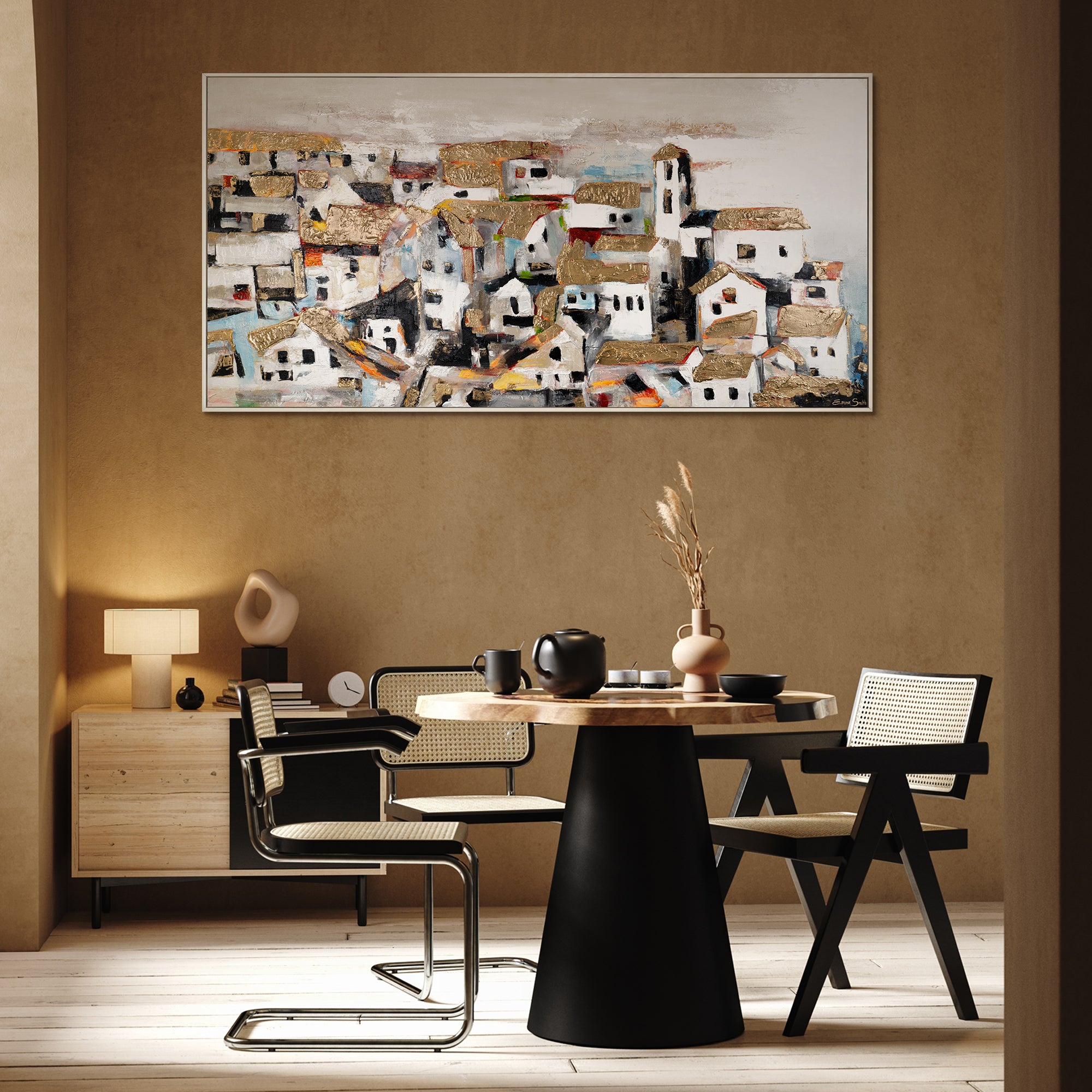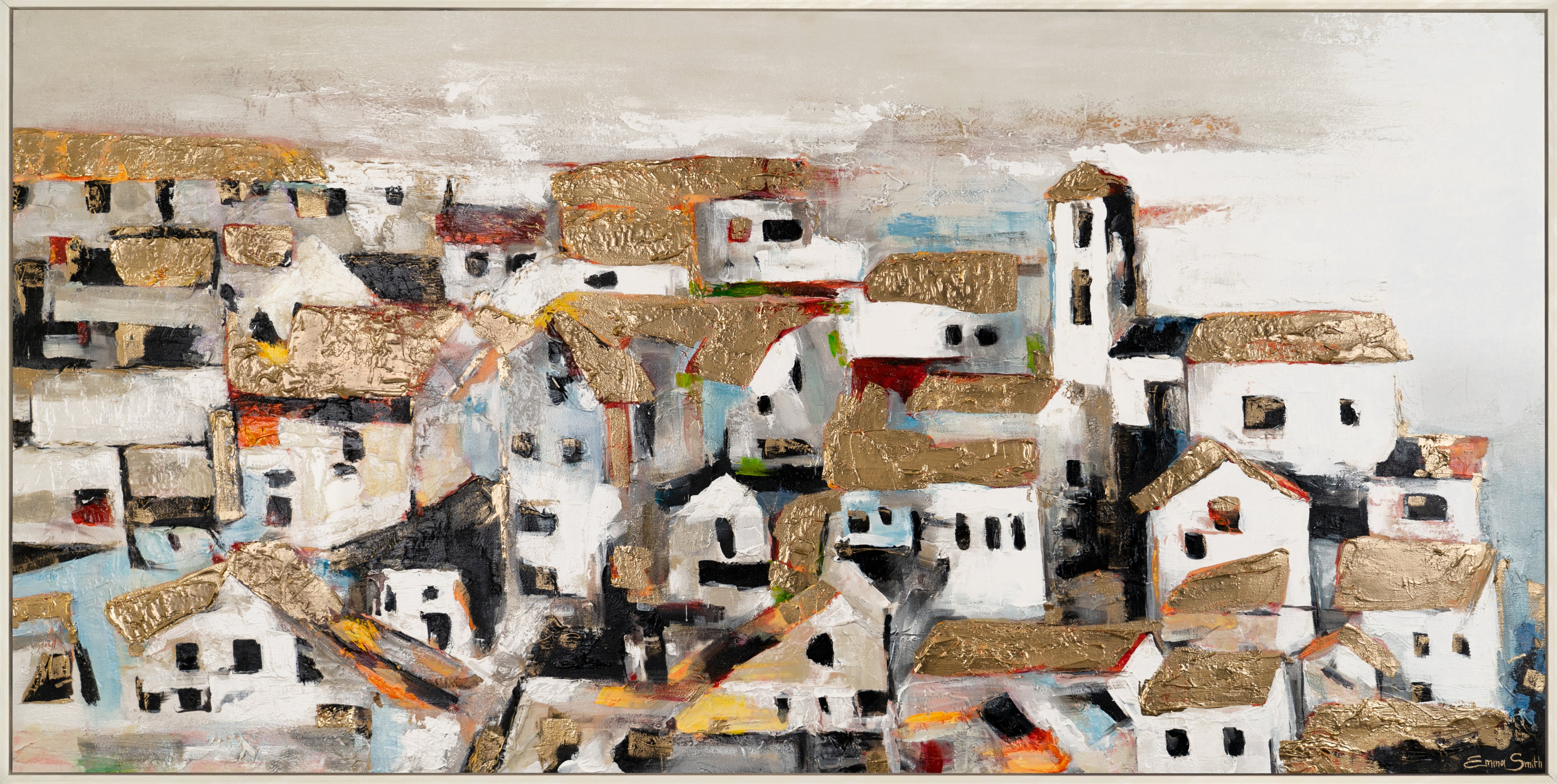 Bereichern Sie Ihr Zuhause oder Büro mit diesem farbenfrohen, abstrakten Kunstwerk, das eine malerische Stadtlandschaft in lebhaften Farben darstellt. Das Bild besticht durch kräftige Farbtöne und ausdrucksstarke Pinselstriche. Es ist 100% handgemalt und wird durch einen eleganten Rahmen hervorgehoben.