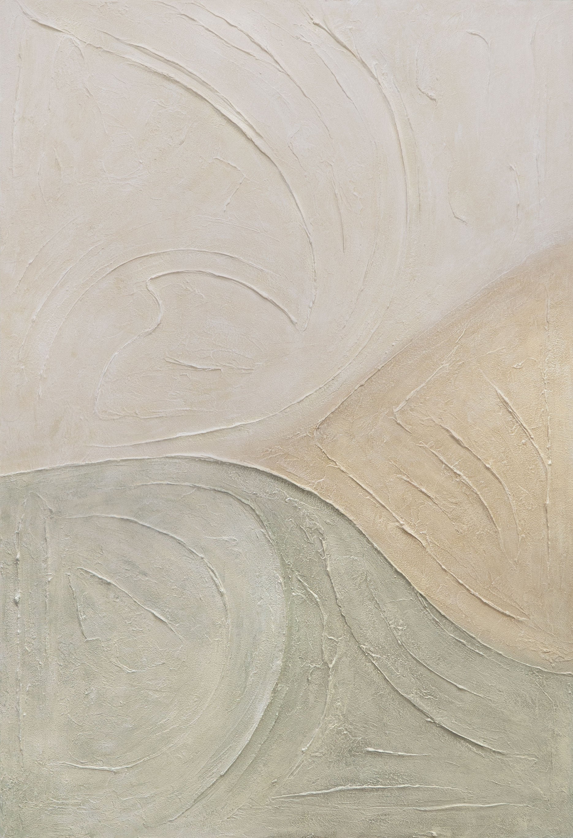 „Spuren des Regens“ bringt die stille Schönheit natürlicher Texturen auf die Leinwand. Zarte Linien und sanfte Farbflächen in Beige und Grün verschmelzen zu einer harmonischen Komposition, die an Wasserläufe und Windspuren erinnert. Die feine Struktur schafft Tiefe und lädt zum Innehalten ein.