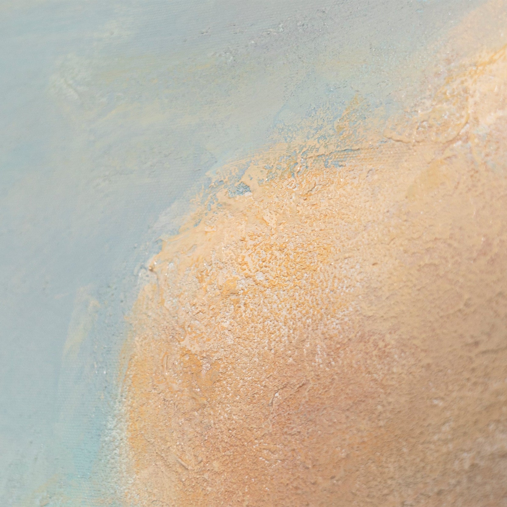 „Leichtigkeit des Seins“ verkörpert den Moment der vollkommenen Ruhe. Eine weiche Wolkenformation schwebt über dem zarten Blau des Meeres, während feine Strukturen und Pastelltöne von Beige und Creme das Licht sanft reflektieren. Die handgemalte Oberfläche lässt das Bild lebendig wirken und füllt den Raum mit friedlicher Energie.