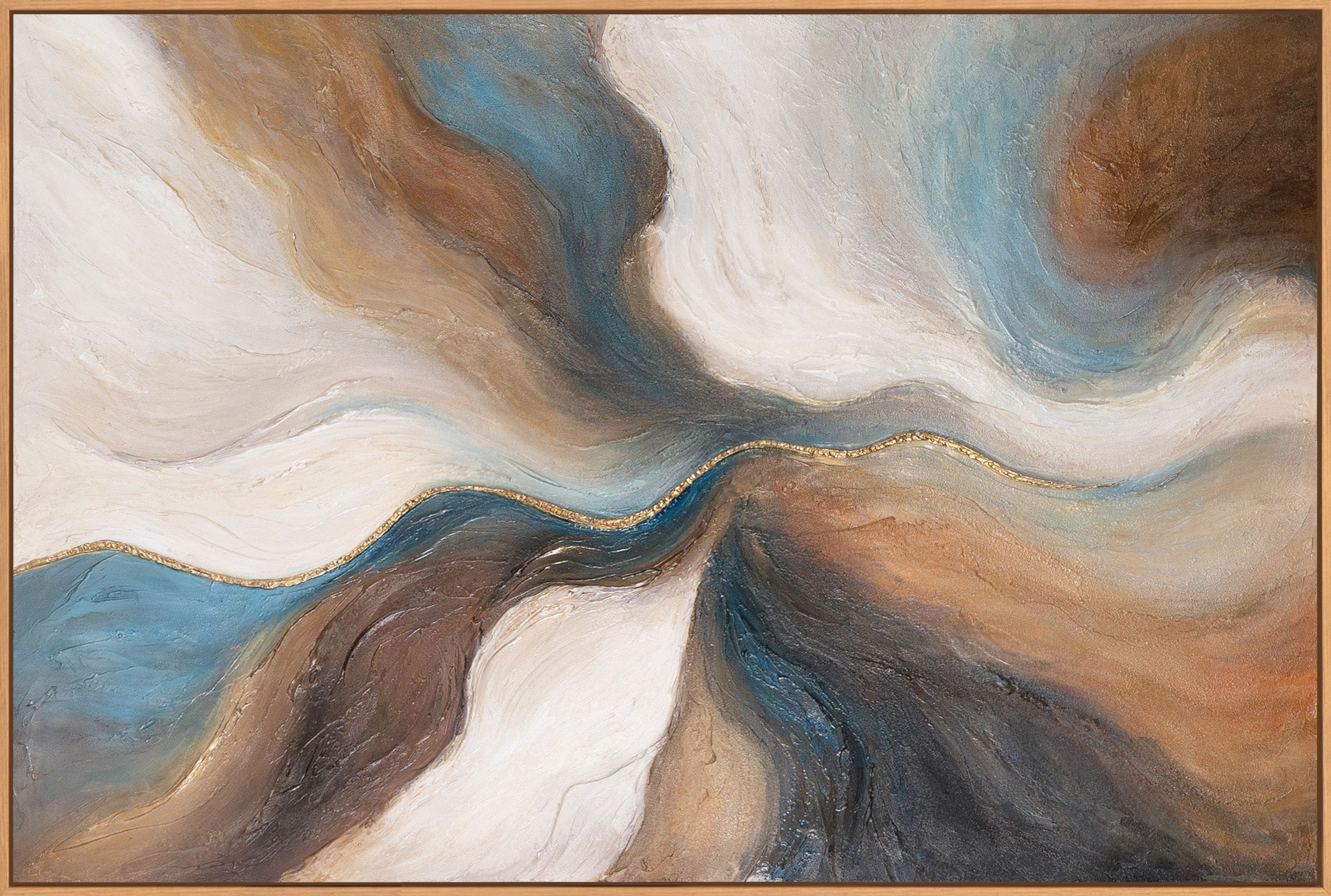 „Vergehen der Zeit“ zeigt ein fließendes Zusammenspiel aus warmen Erdtönen, zarten Cremeflächen und kühlen Blauakzenten. Die organischen Bewegungen erinnern an Wellen, Sedimente oder an Landschaftsformen, die sich im Lauf der Zeit verändern. Eine feine goldene Linie durchzieht das Gemälde und verleiht dem Werk Eleganz und subtile Raffinesse. Die pastose Struktur lässt die Oberfläche lebendig wirken und bringt Tiefe in jede Raumwirkung.