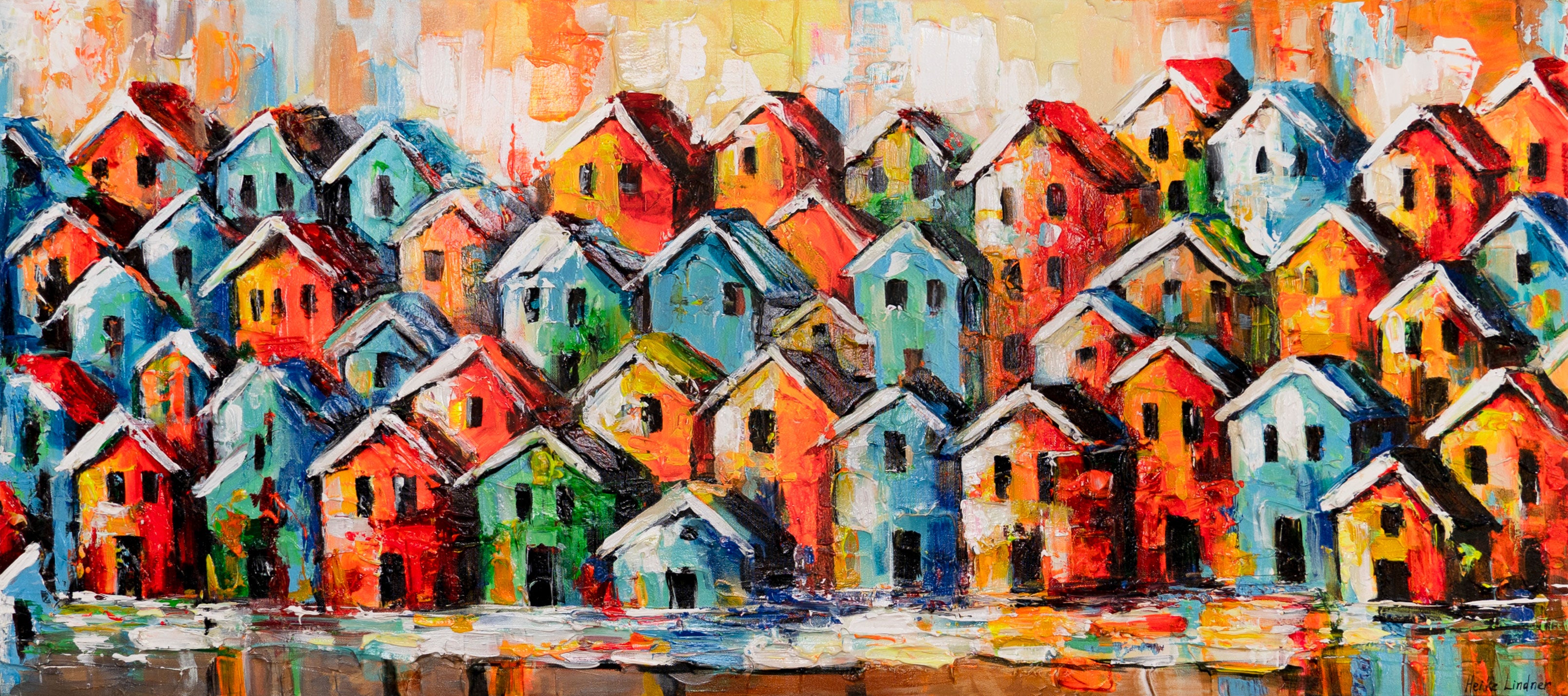 „Farbenfrohe Stadt“ ist ein lebendiges Acrylgemälde, das mit einer Vielzahl bunter Häuschen in versetzten Reihen spielt. Die satten Farbtöne und dynamischen Pinselstriche bringen Bewegung und Fröhlichkeit in jeden Raum. Ideal für moderne Wohnräume, Flure oder kreative Arbeitsbereiche. Jedes Bild ist ein handgemaltes Unikat mit liebevoller Struktur und strahlender Farbwirkung.