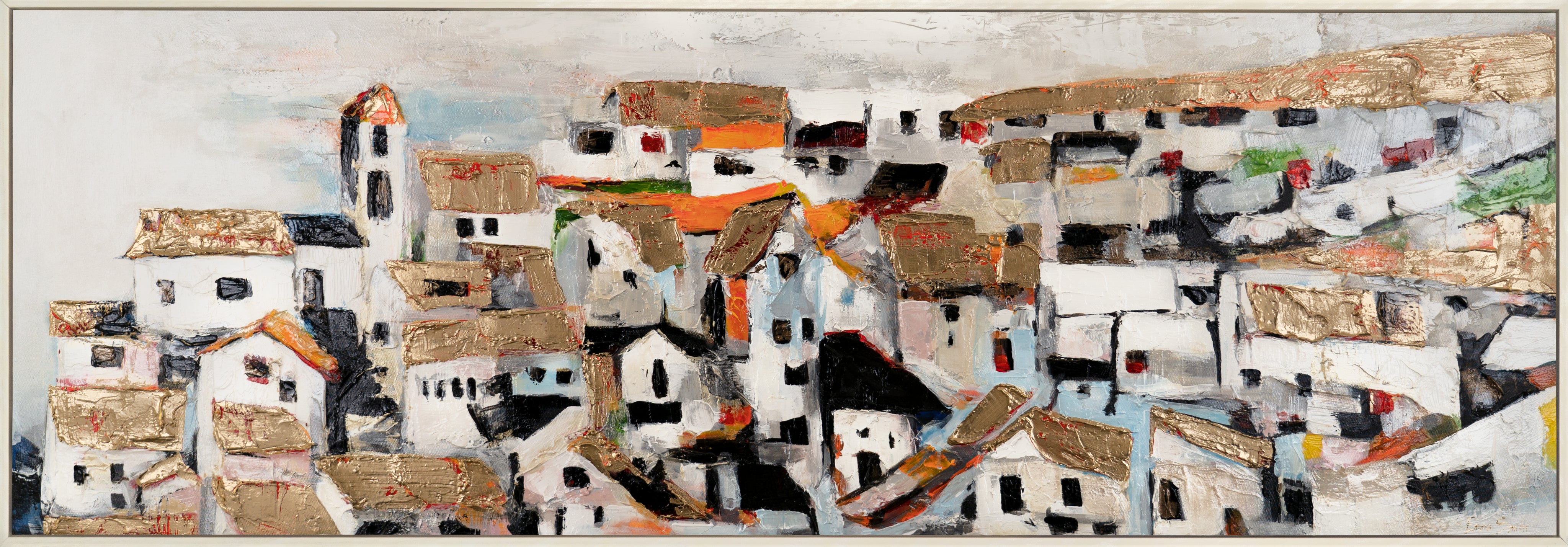 Dieses handgemalte Leinwandbild „Sonnenhäuser“ fängt mit seiner abstrakten Darstellung eine bezaubernde Stadtszene ein. Warme Weiß- und Goldtöne verschmelzen zu einer lebendigen Komposition, die durch ihre reich strukturierte Oberfläche eine besondere Tiefe erhält. Die goldenen Akzente verleihen dem Kunstwerk eine edle Ausstrahlung, die dem Raum Wärme und Eleganz schenkt.
