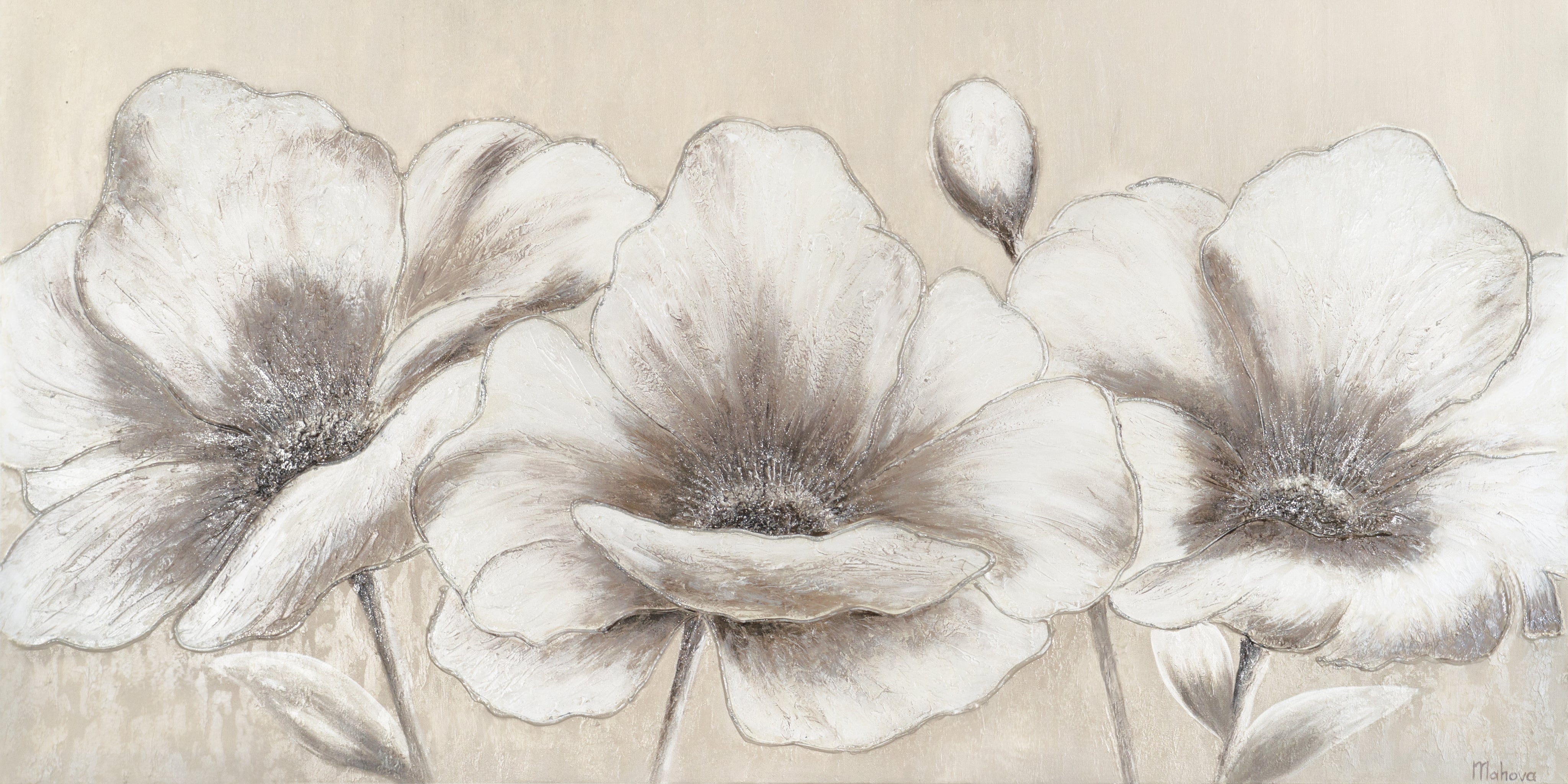 Das handgemalte Acrylbild „Blumen II“ zeigt eine zarte Komposition aus großen Blüten in sanften Beige- und Weißtönen. Die strukturierte Oberfläche aus dicken Farbschichten verleiht der floralen Darstellung eine lebendige Dreidimensionalität und eine angenehme Tiefenwirkung. Diese stilvolle Blumenmalerei verbindet Ruhe und Eleganz, die jeden Raum mit natürlicher Schönheit bereichert.