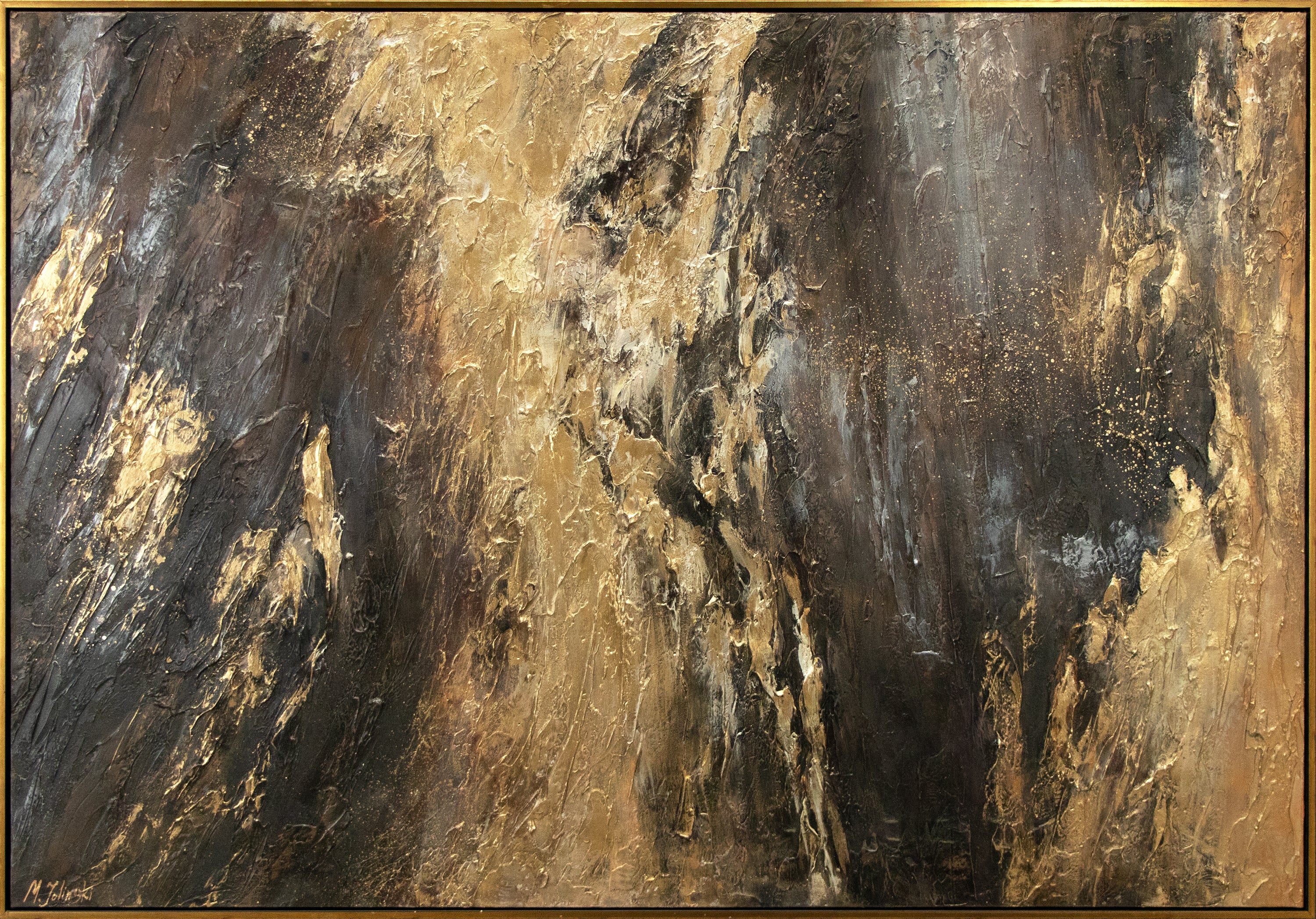 „Spiegelungen III“ ist ein handgemaltes Acrylgemälde mit ausdrucksstarker Struktur in Gold, Schwarz und warmen Erdtönen. Die Komposition lebt von dramatischen Kontrasten, intensiven Texturen und der eleganten Tiefe der Farbschichten. Die abstrahierte Dynamik erinnert an eine kraftvolle Bewegung, eingefroren im Moment – ein Kunstwerk, das Emotionen weckt und Interpretationen offenlässt.