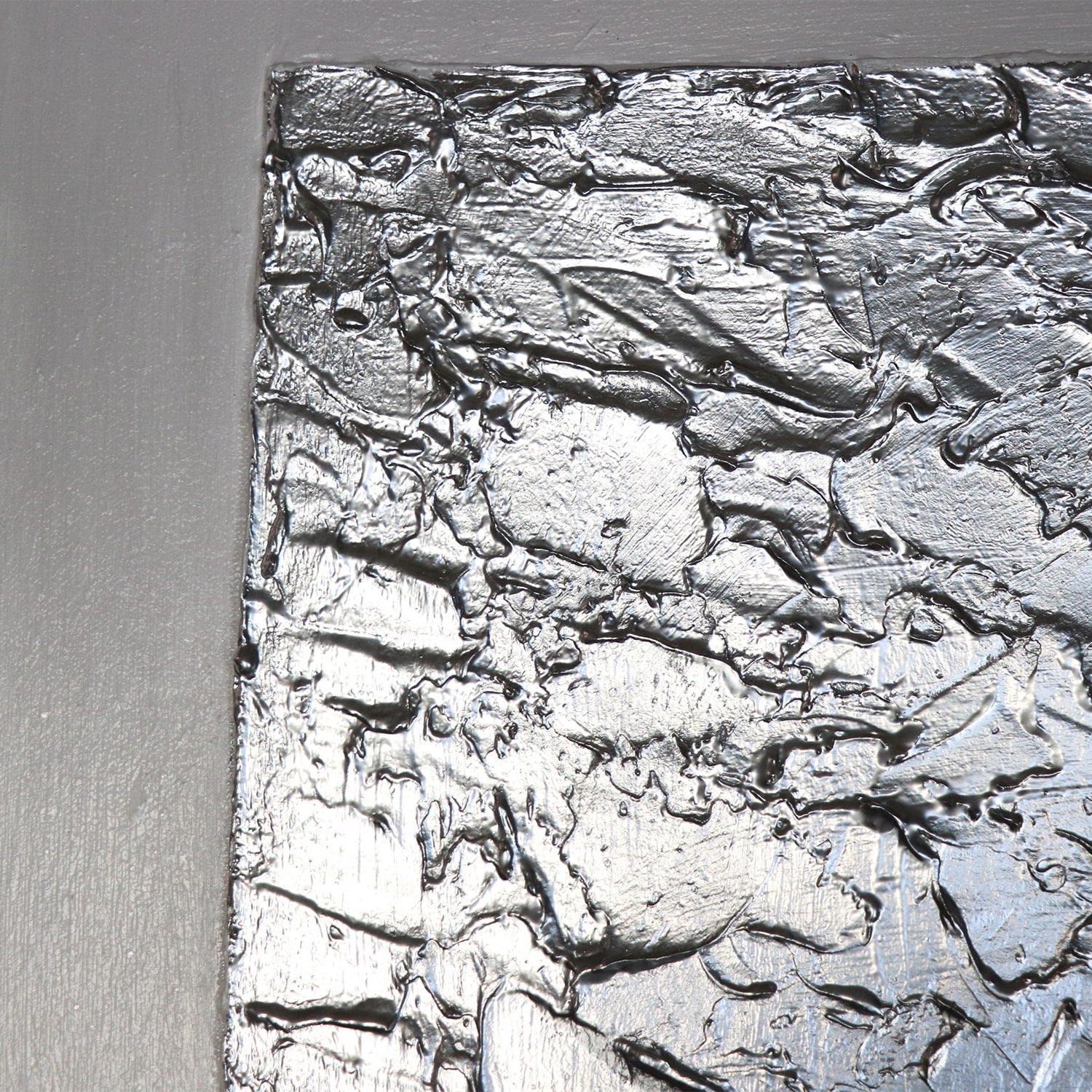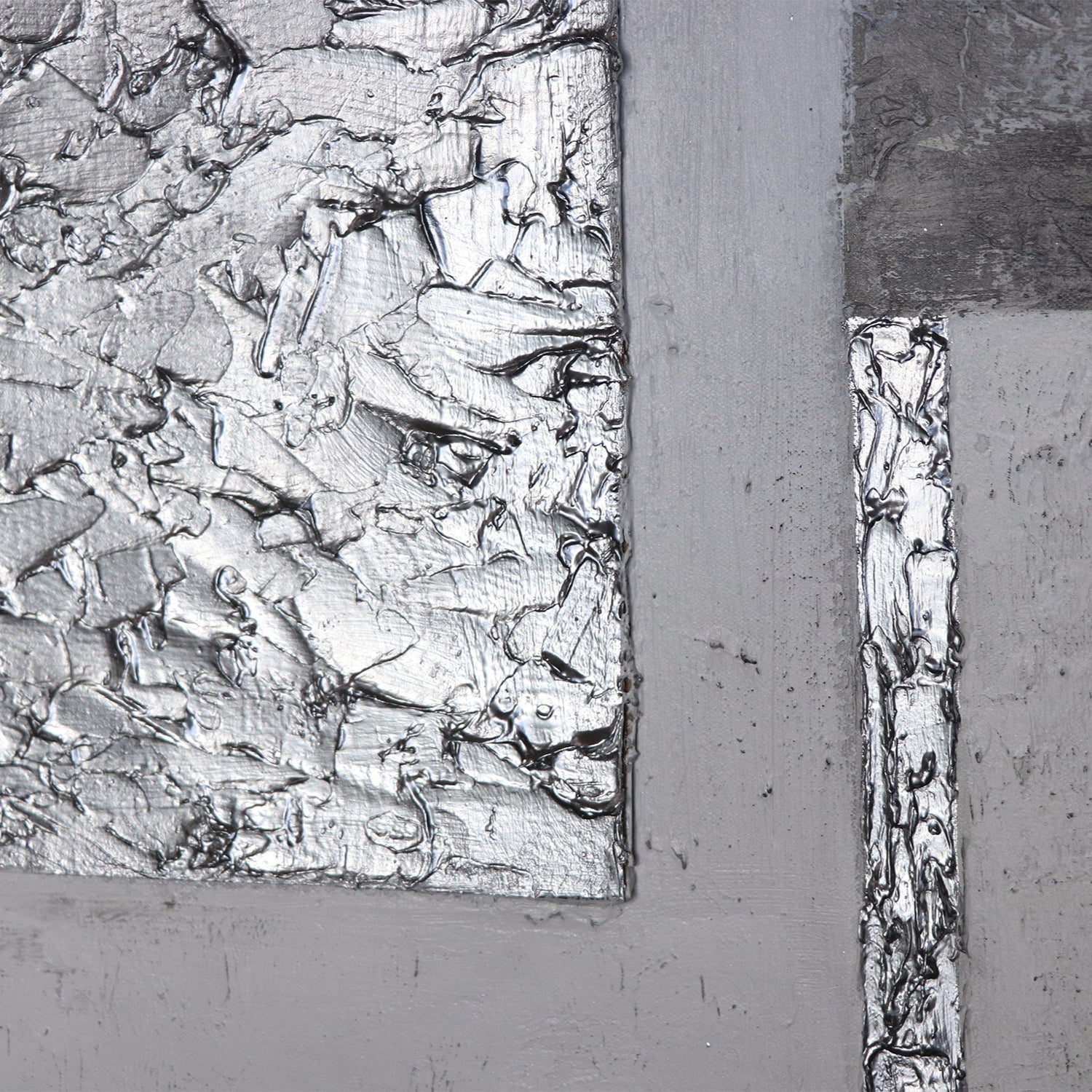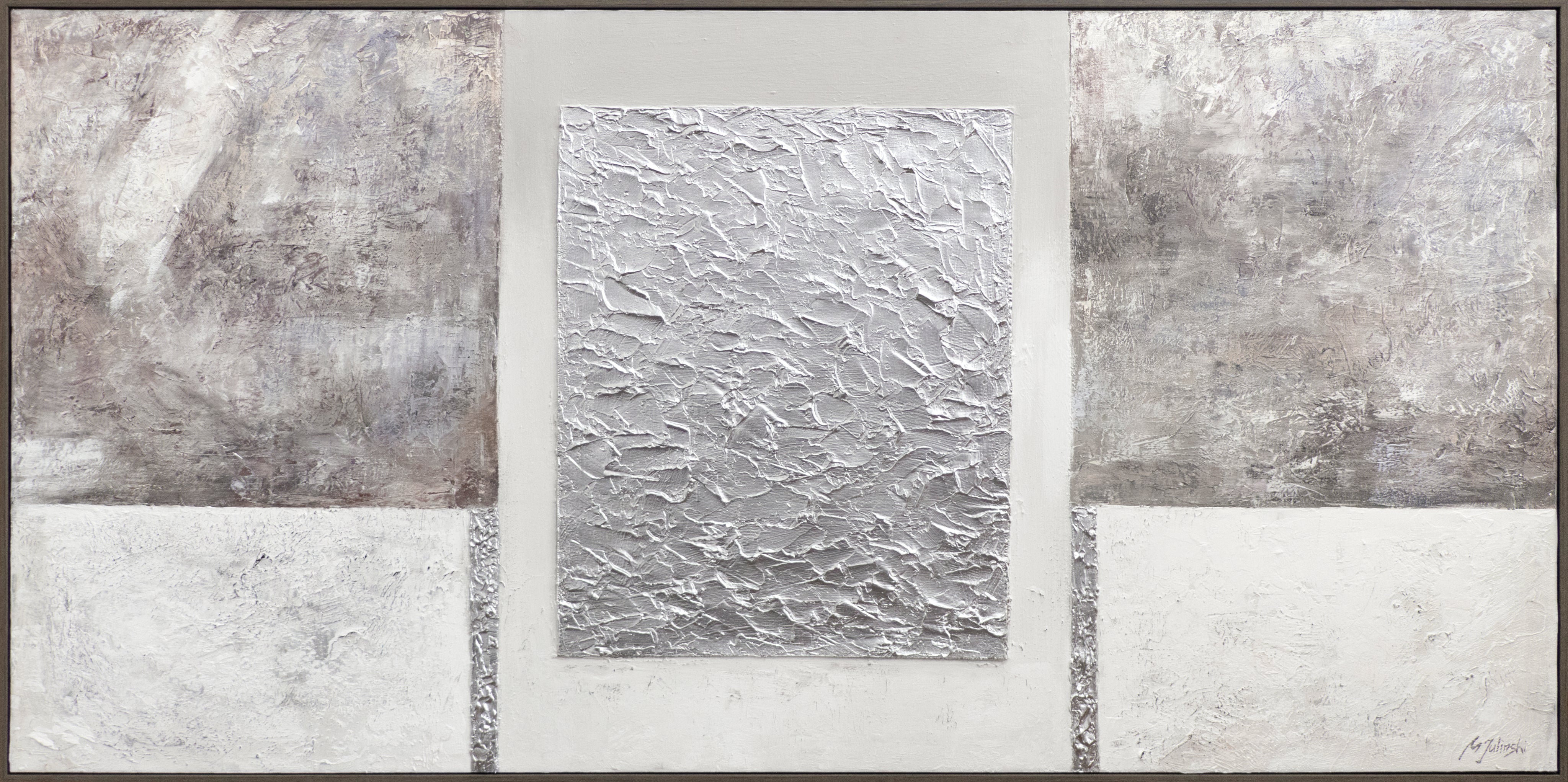 „Perfekte Stabilität“ ist ein modernes Acrylgemälde mit strukturierter Oberfläche, das durch seine präzise Komposition und reduzierte Farbgebung besticht. Im Zentrum steht ein silbernes Rechteck mit starker Textur, das sich wirkungsvoll von den glatten, grauen und weißen Bereichen abhebt. Die feinen, metallischen Akzente sorgen für Tiefe und Eleganz, während die harmonische Aufteilung dem Werk Stabilität und Ausgewogenheit verleiht.