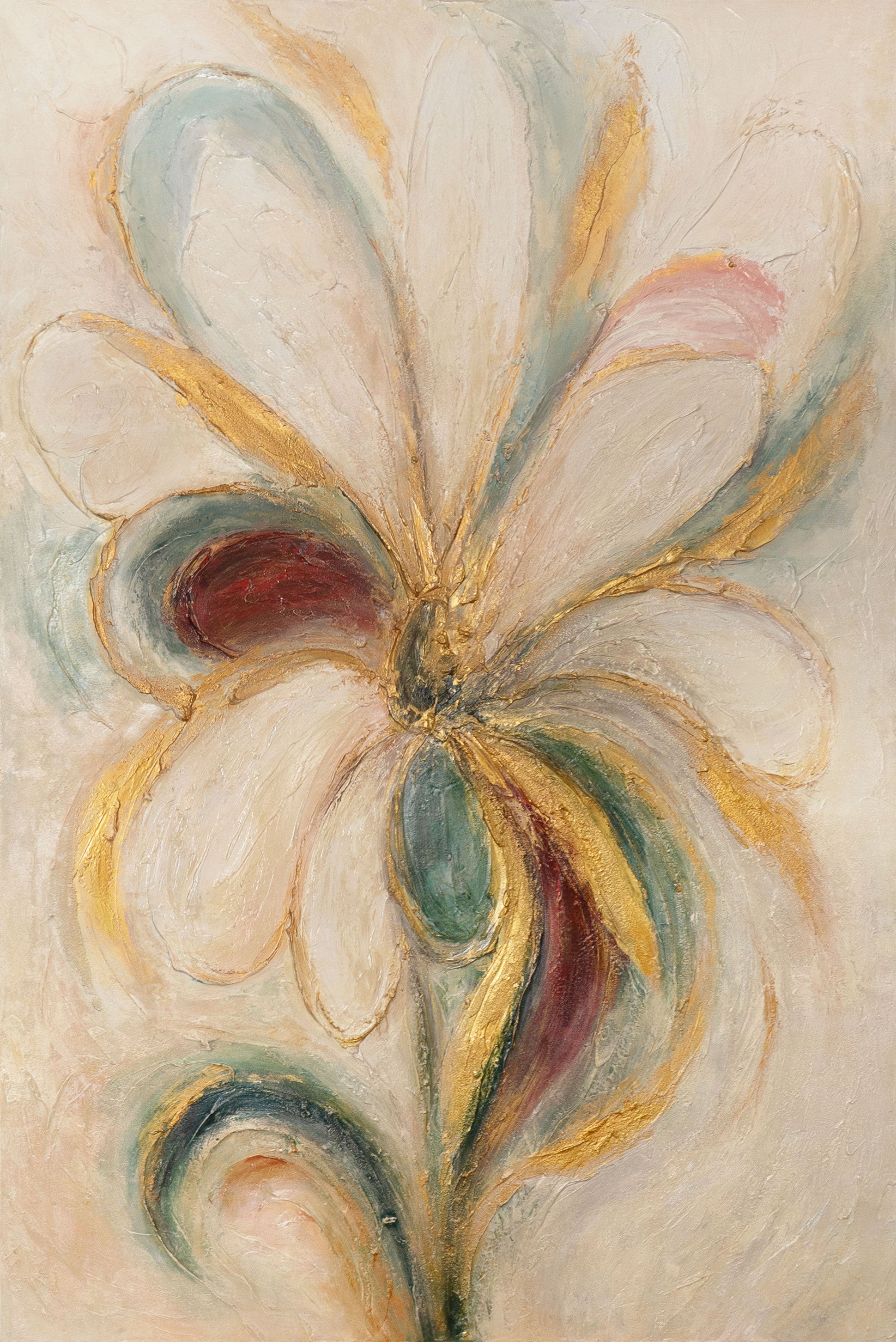 „Blumige Energie“ ist ein handgemaltes Acrylgemälde auf Leinwand, das mit seiner intensiven Farbkraft und geschwungenen Linien eine florale Dynamik entfaltet. Leuchtende Akzente in Gold, Grün und Rot treffen auf weiche Creme- und Beigetöne, wodurch ein harmonisches und zugleich lebendiges Bild entsteht. Die plastische Struktur verleiht dem Kunstwerk Tiefe und Bewegung, die an eine stilisierte Blüte im Wind erinnern.