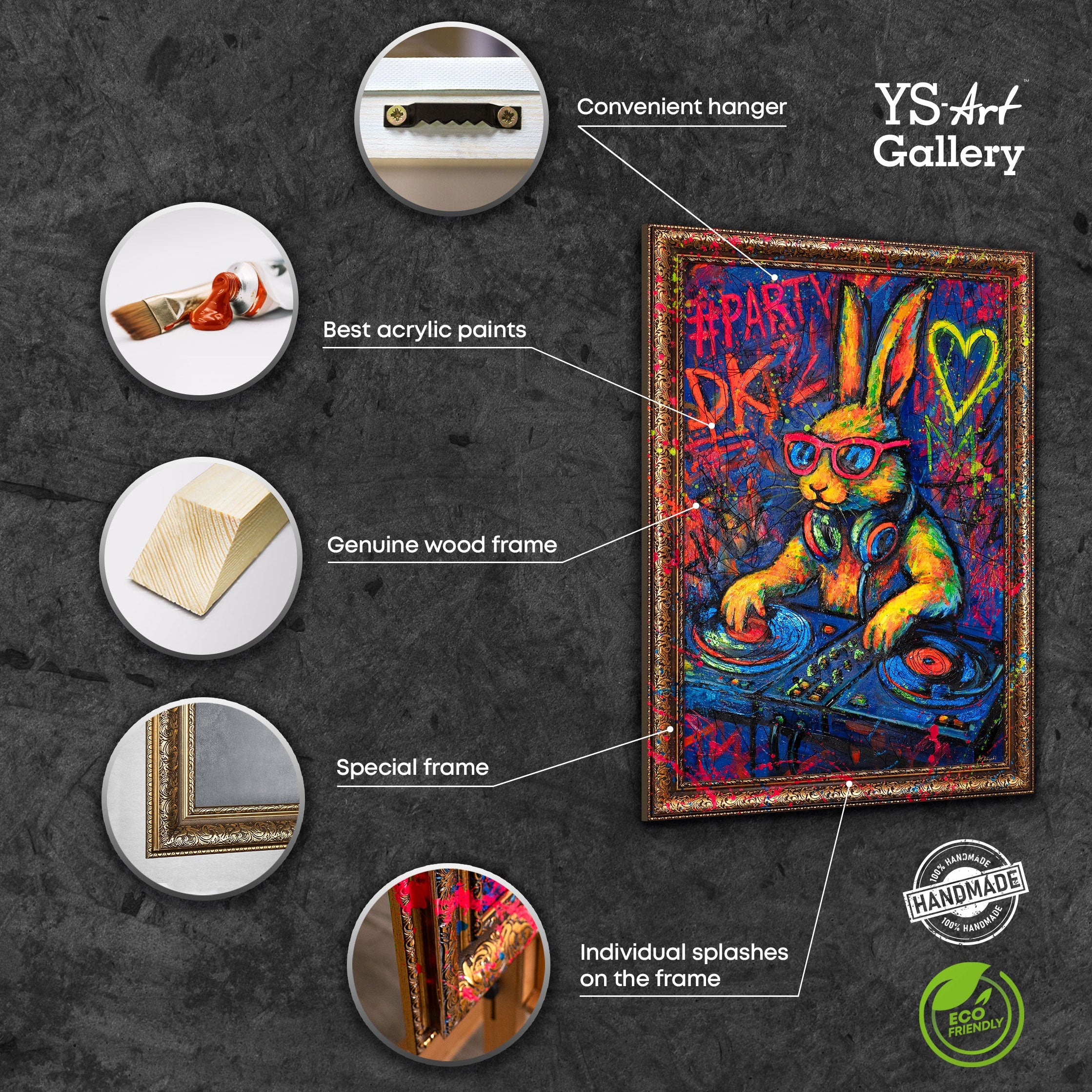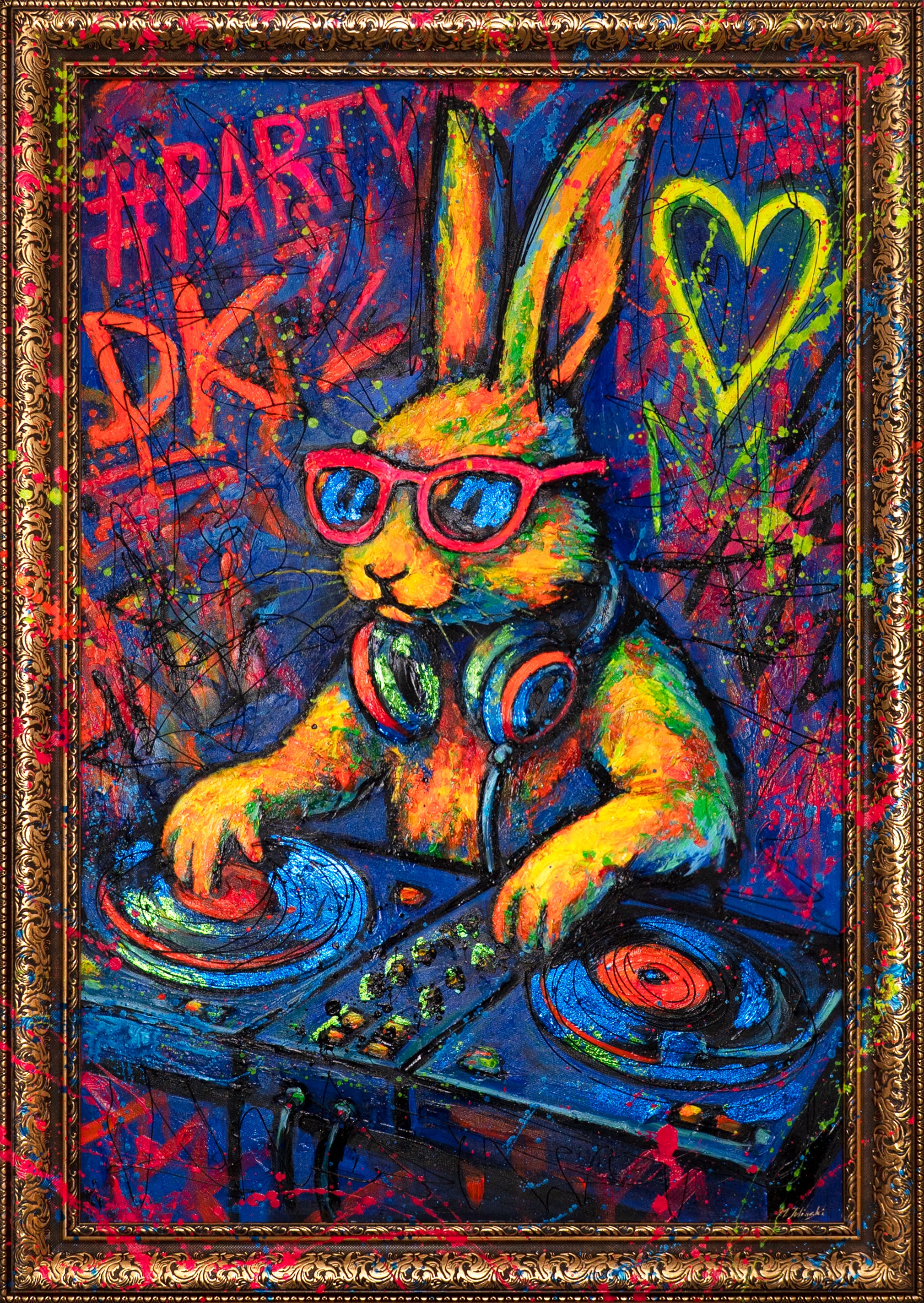 Moderne Wandkunst mit Rahmen – Abstraktes Gemälde "Party-Hase" auf Leinwand
