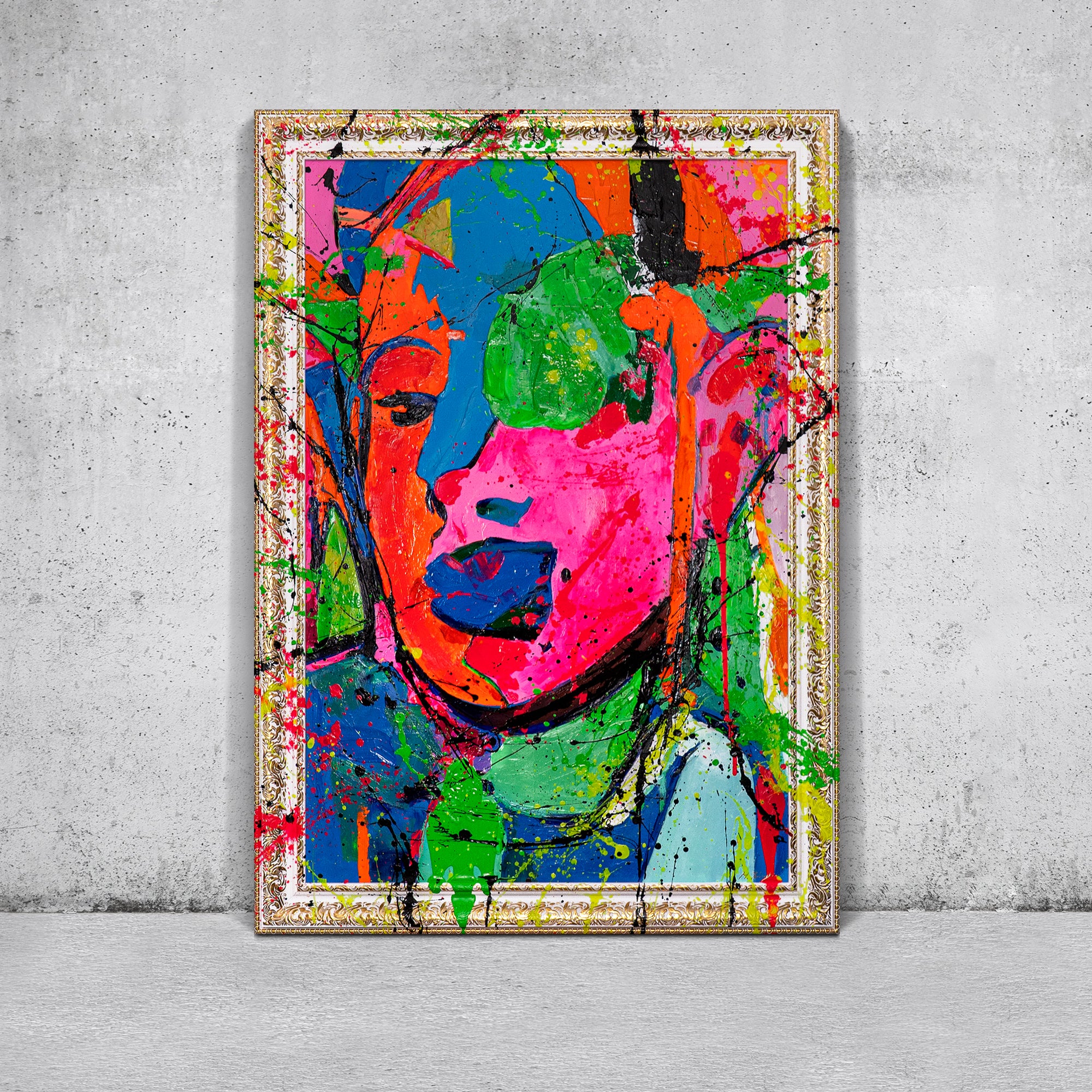 Mit seinen starken Kontrasten und dynamischen Pinselstrichen ist dieses Werk die perfekte Wahl für alle, die wandbilder modern oder besondere gesicht gemälde für ihr Zuhause suchen.