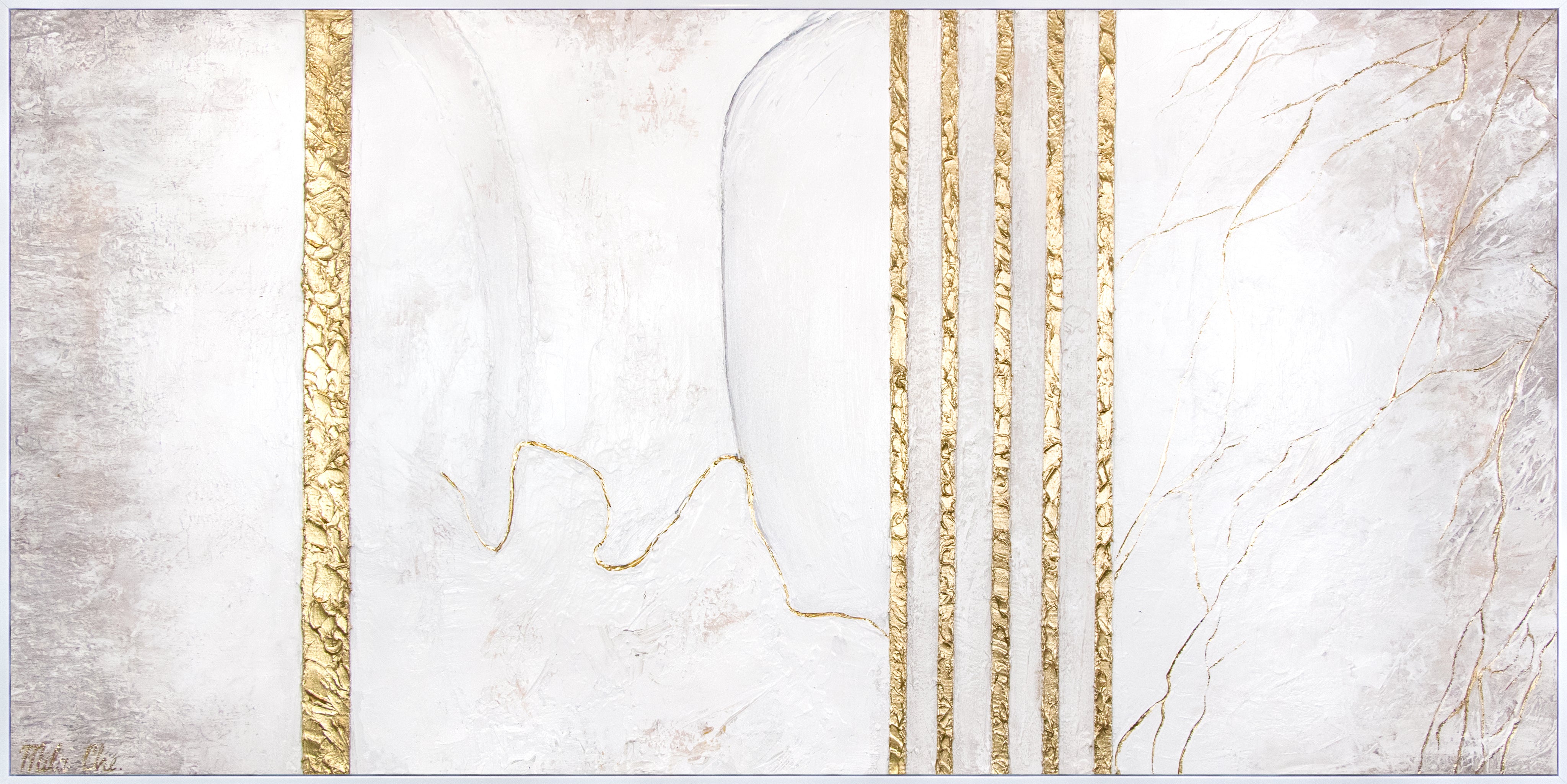 This XXL canvas artwork captivates with its elegant combination of white and gold. The clean lines and subtle color accents give the painting a modern and stylish aura. Perfect for large living spaces, where it serves as a central piece, adding a touch of luxury and sophistication.