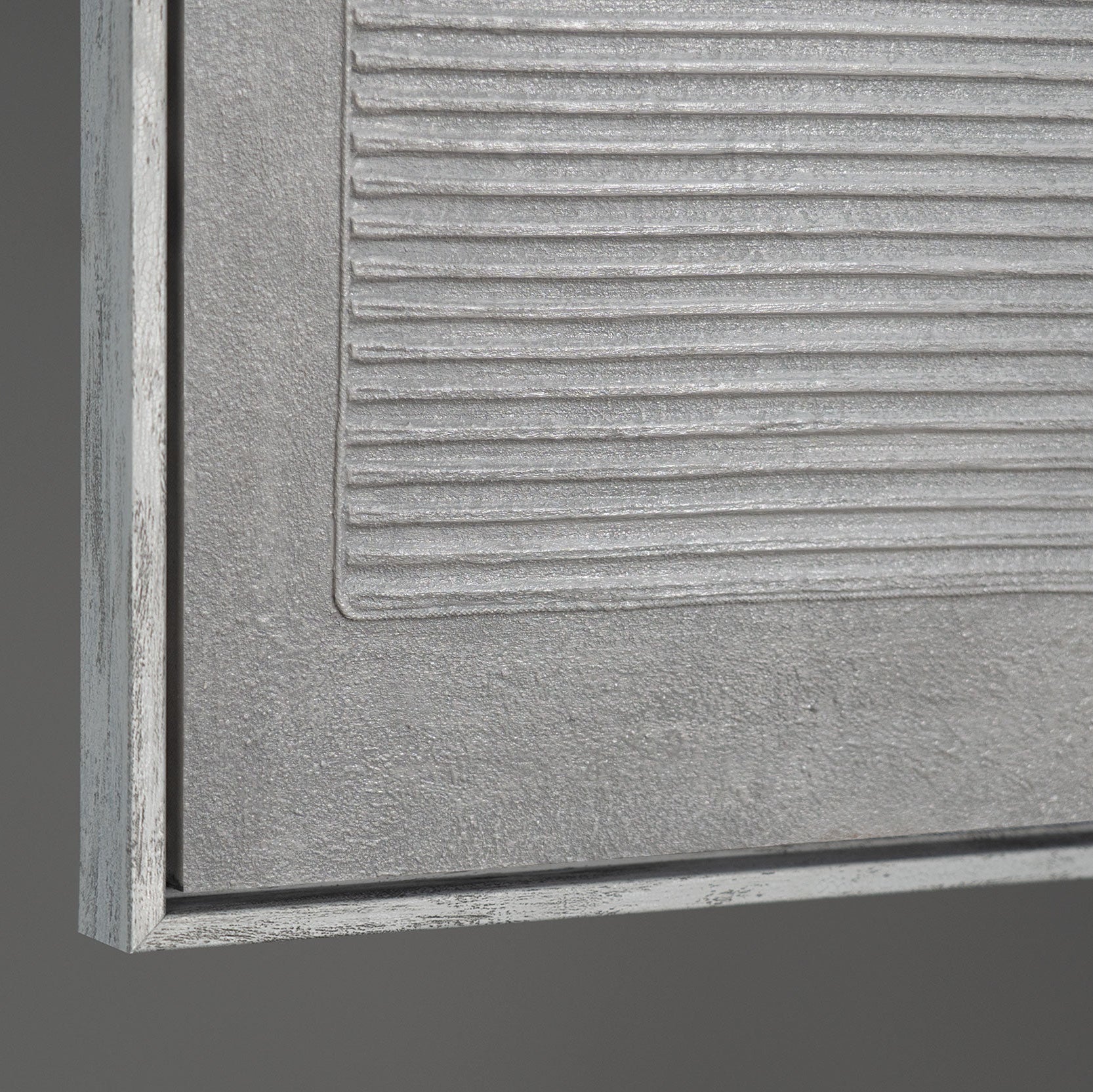 "Gray Chord" unites architectural clarity with artistic depth. Geometric forms, concentric circles, and textured surfaces in various shades of gray create a harmonious balance between precision and emotion. The finely crafted surface is reminiscent of concrete, lending the work a sculptural quality.