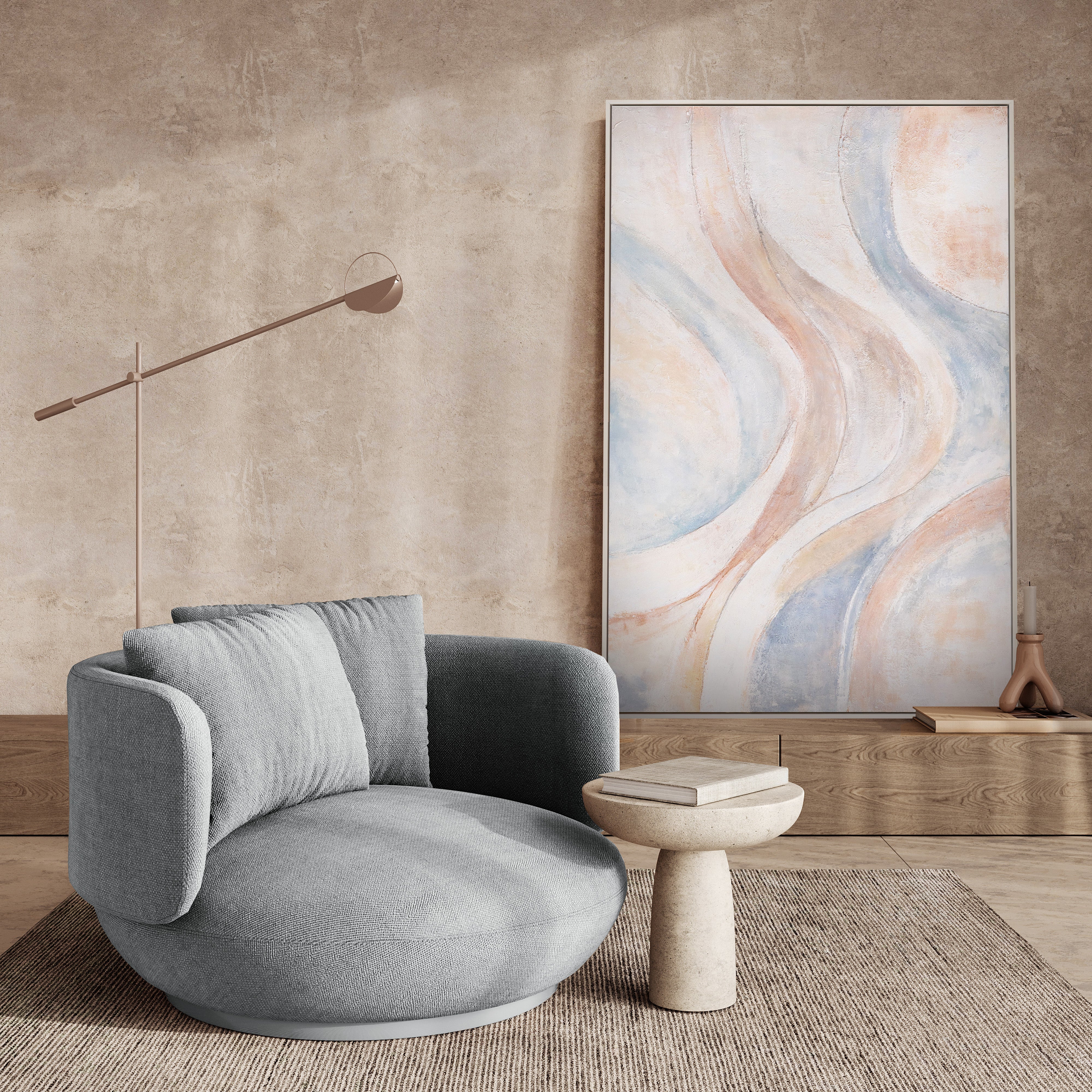 This painting is ideal for modern, bright, and natural interiors. It appears airy, serene, and sophisticated, blending harmoniously into living rooms, bedrooms, offices, or stylish reception areas. "Wind Lines" adds a soft, timeless touch without any visual heaviness.