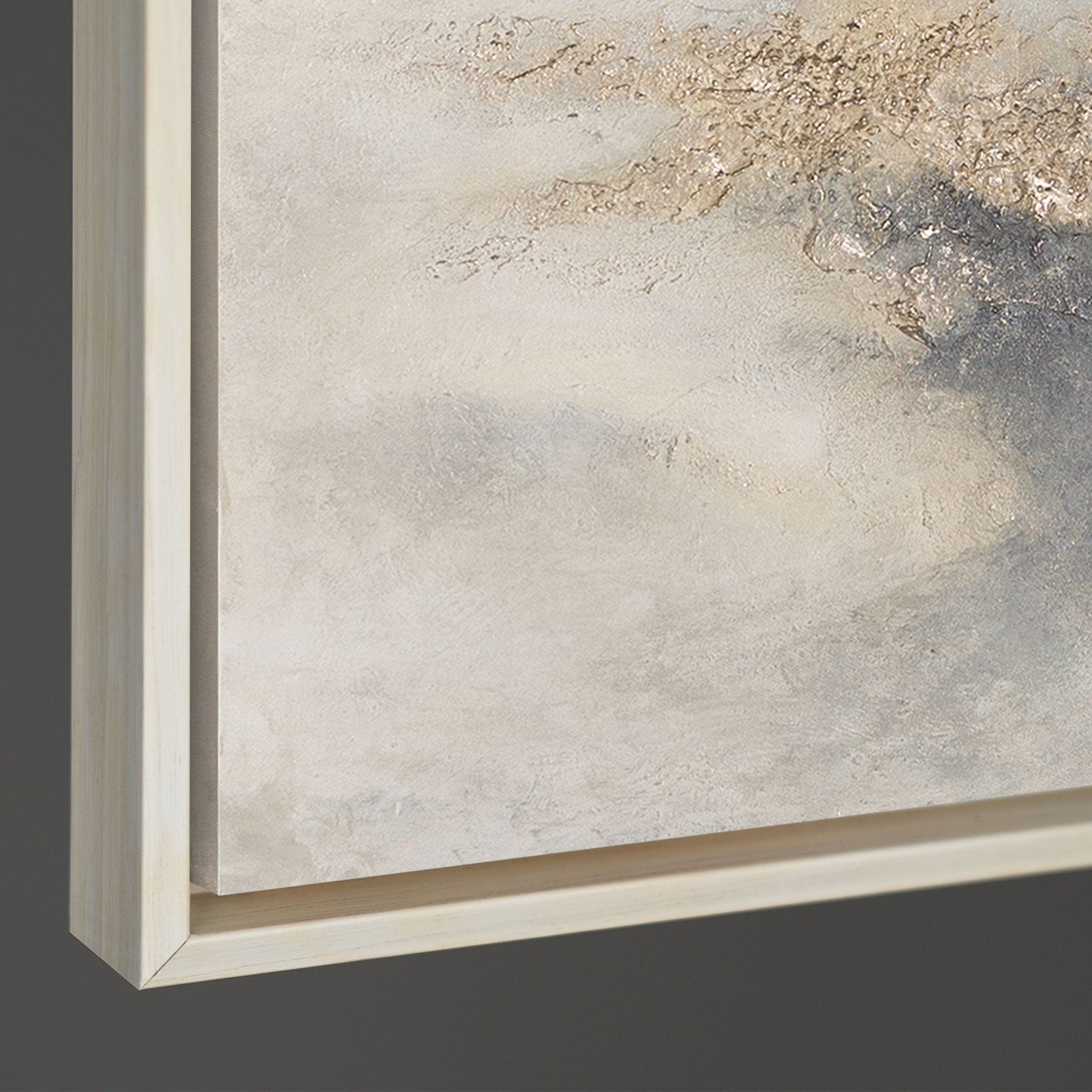 "Cloud Melody" blends soft, cloud-like color gradients in beige, gray, and cream with bold, golden textured areas. The relief-like accents resemble natural rock or mineral layers emerging from the tranquil mist. The transitions between delicate wisps of fog and striking structures lend the painting depth, luminosity, and a dynamic yet gentle presence in the room.