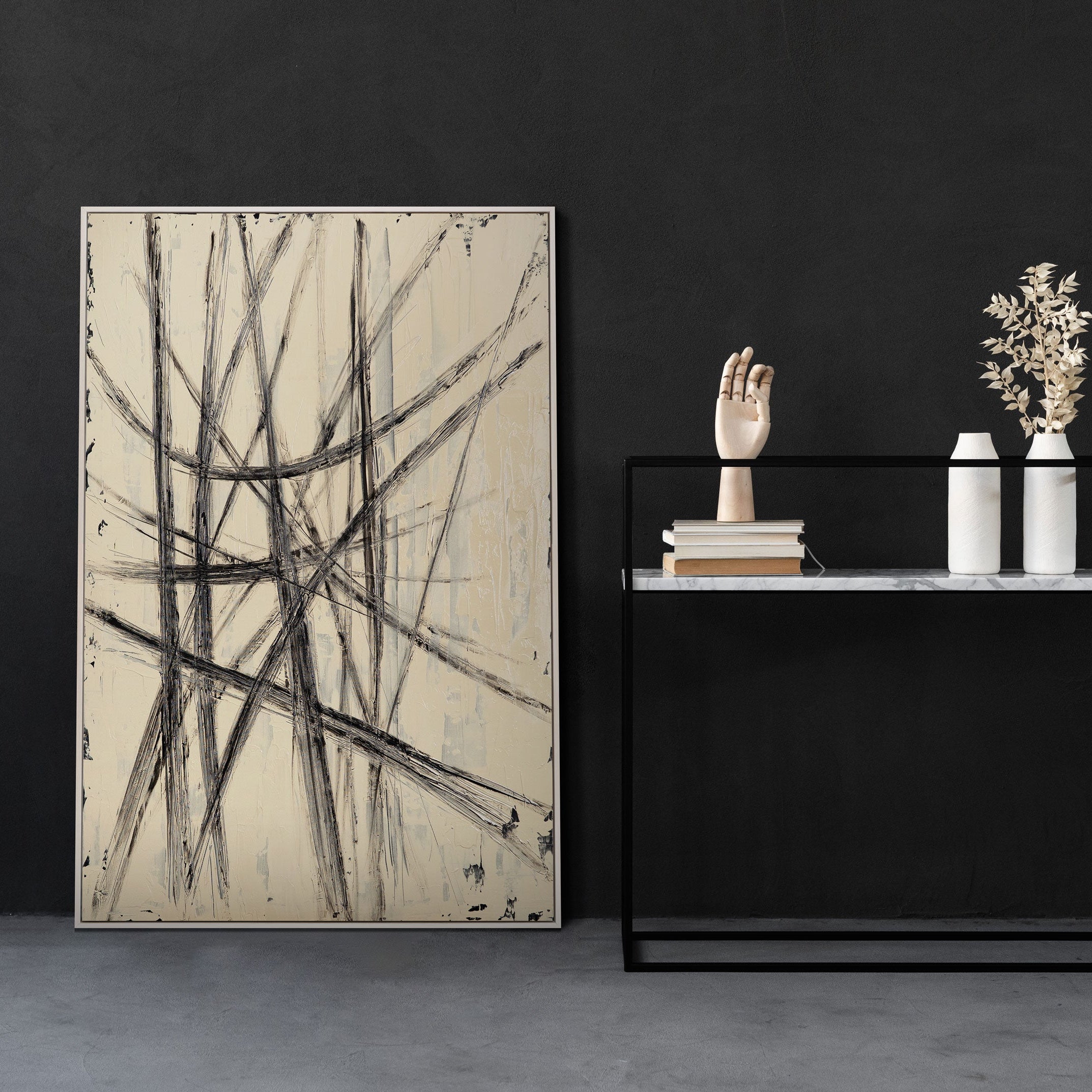 "Parallels and Intersections" unites movement and structure in a single expression. Black lines crisscross the soft beige surface, creating rhythm, energy, and visual depth. The interplay of contrast and texture conveys both tension and balance—an image that enlivens and simultaneously orders the space.