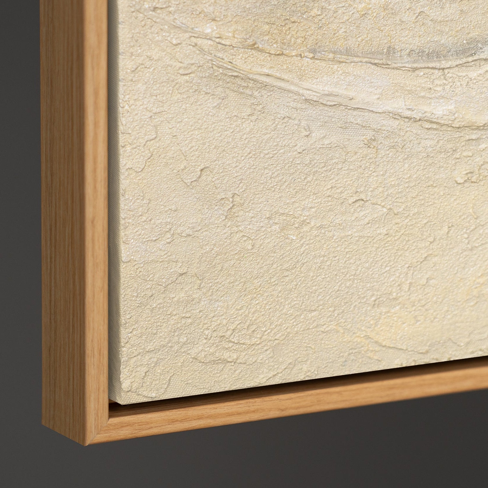 "Shadows and Sand" features a soft, flowing line structure in harmonious natural, beige, and sand tones. The relief-like surface creates gentle waves, reminiscent of wind-sculpted dunes, lending the artwork a calm, warm radiance. The varied texture, with its subtle highs and lows, naturally captures the light, making the image appear vibrant yet always understated, depending on the time of day.