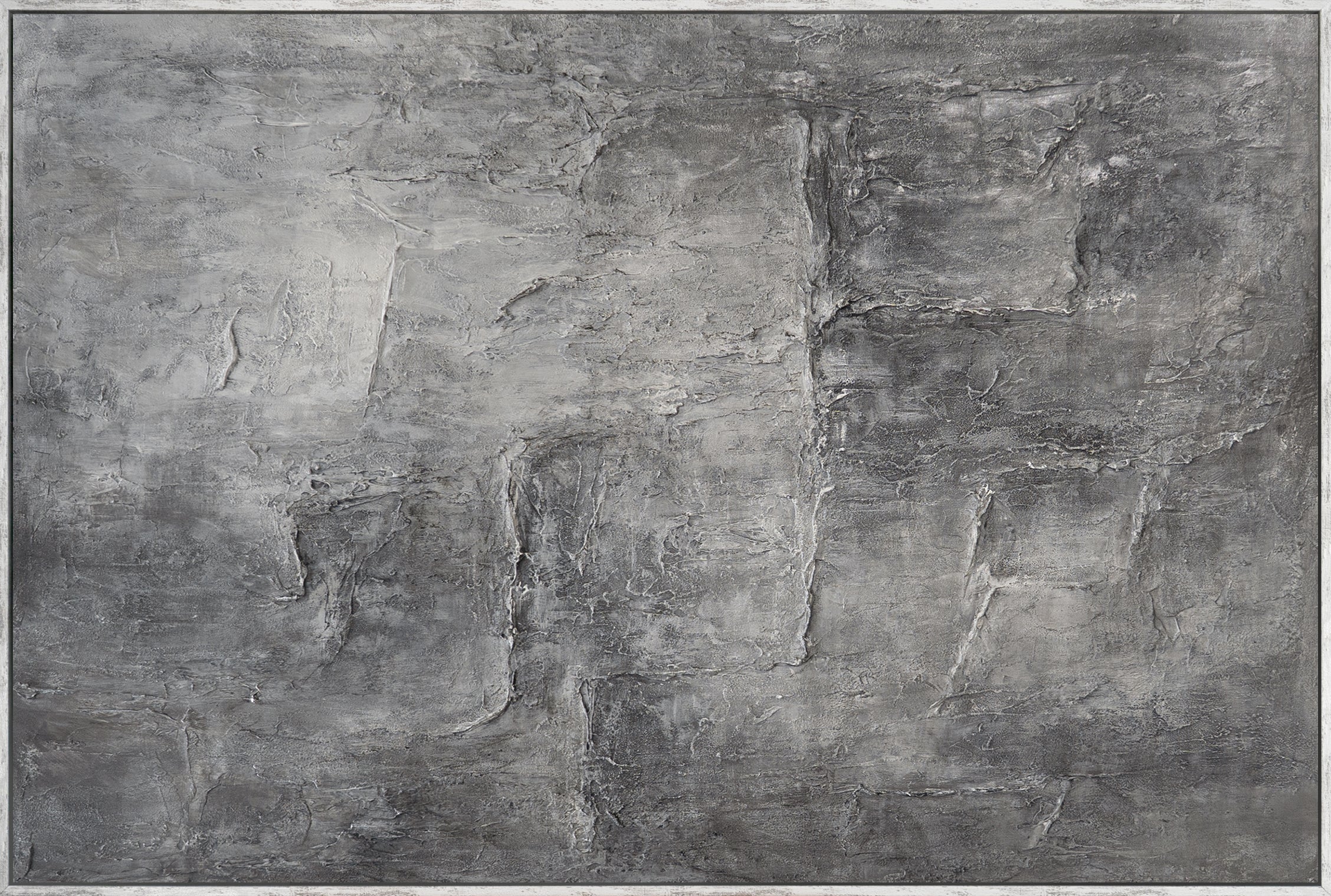 This abstract painting utilizes a multi-layered gray palette and a pronounced, stone-like texture. Irregular surfaces, subtle transitions, and deliberately visible structures create depth and a calm, material effect. The surface is reminiscent of natural rock formations, lending the work a restrained, timeless presence.