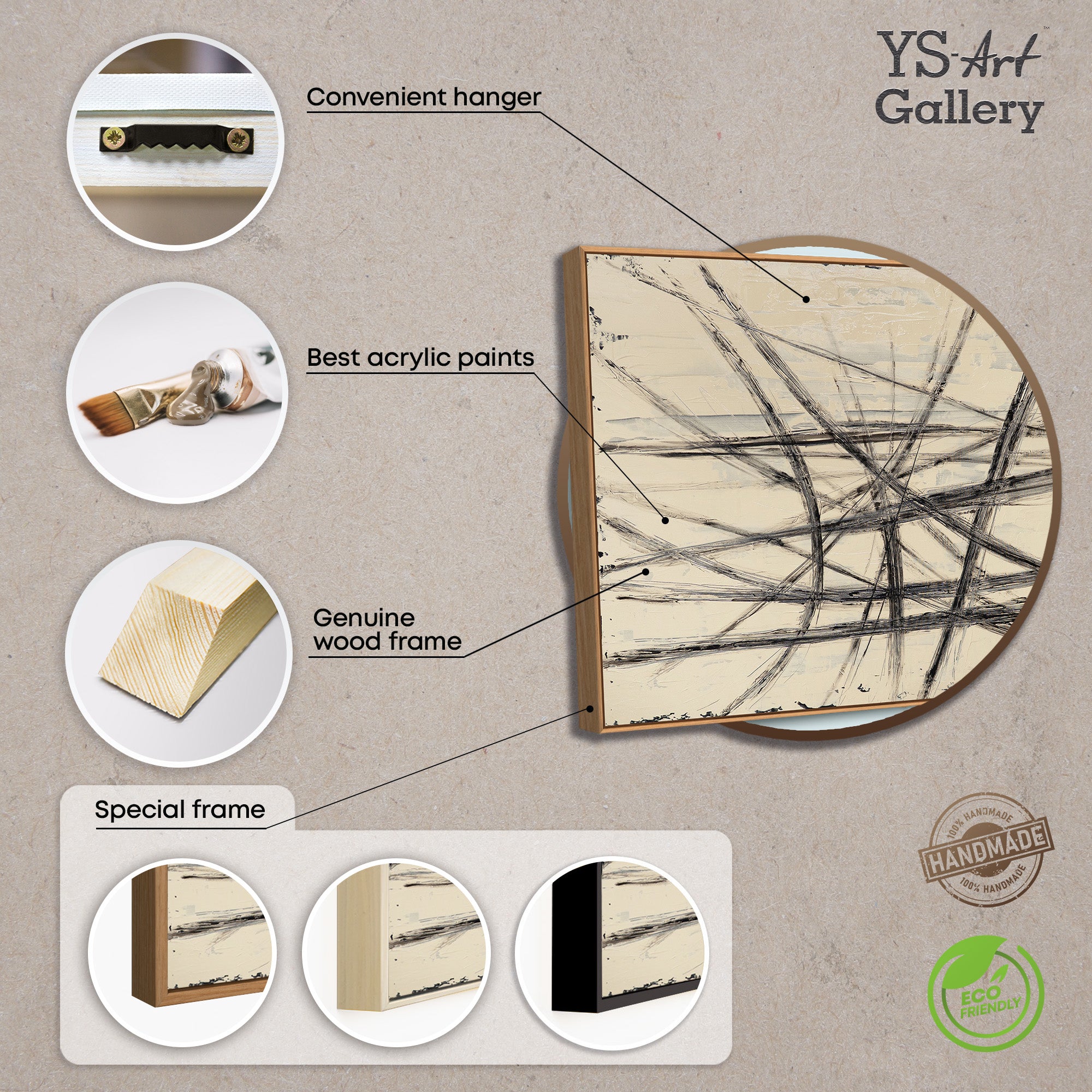 "Parallels and Intersections" is a powerful abstract acrylic painting that thrives on dynamic lines, deliberate layering, and intriguing intersections. Black, graphic brushstrokes traverse the light, textured surface, creating a strong sense of visual depth. The combination of beige, cream, and black lends the work a modern, architectural character with a clear message.