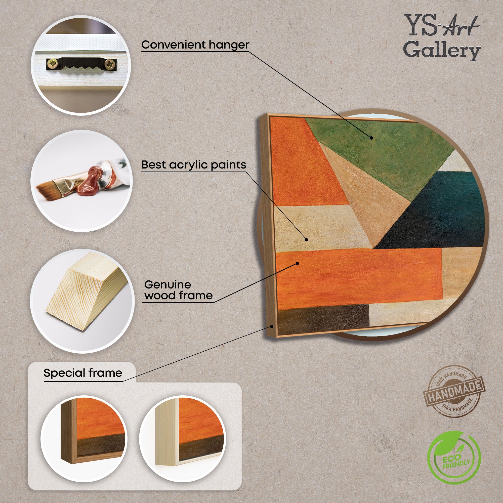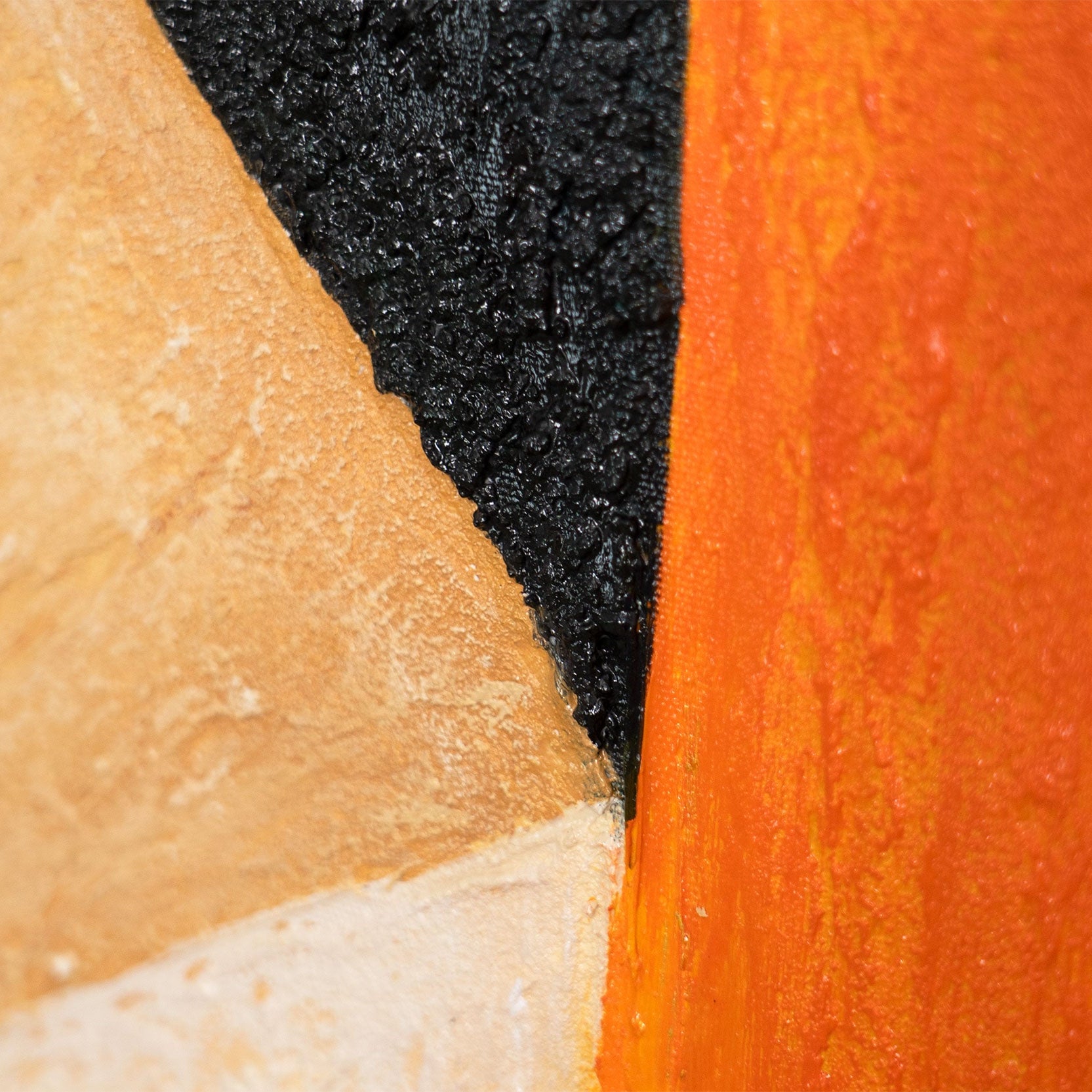 "Order and Movement" showcases a clear geometric composition of contrasting shapes and lines. Warm orange and beige tones meet deep blue and green, creating a dynamic yet balanced overall impression. The visible brushstrokes lend the work depth and a vibrant surface.