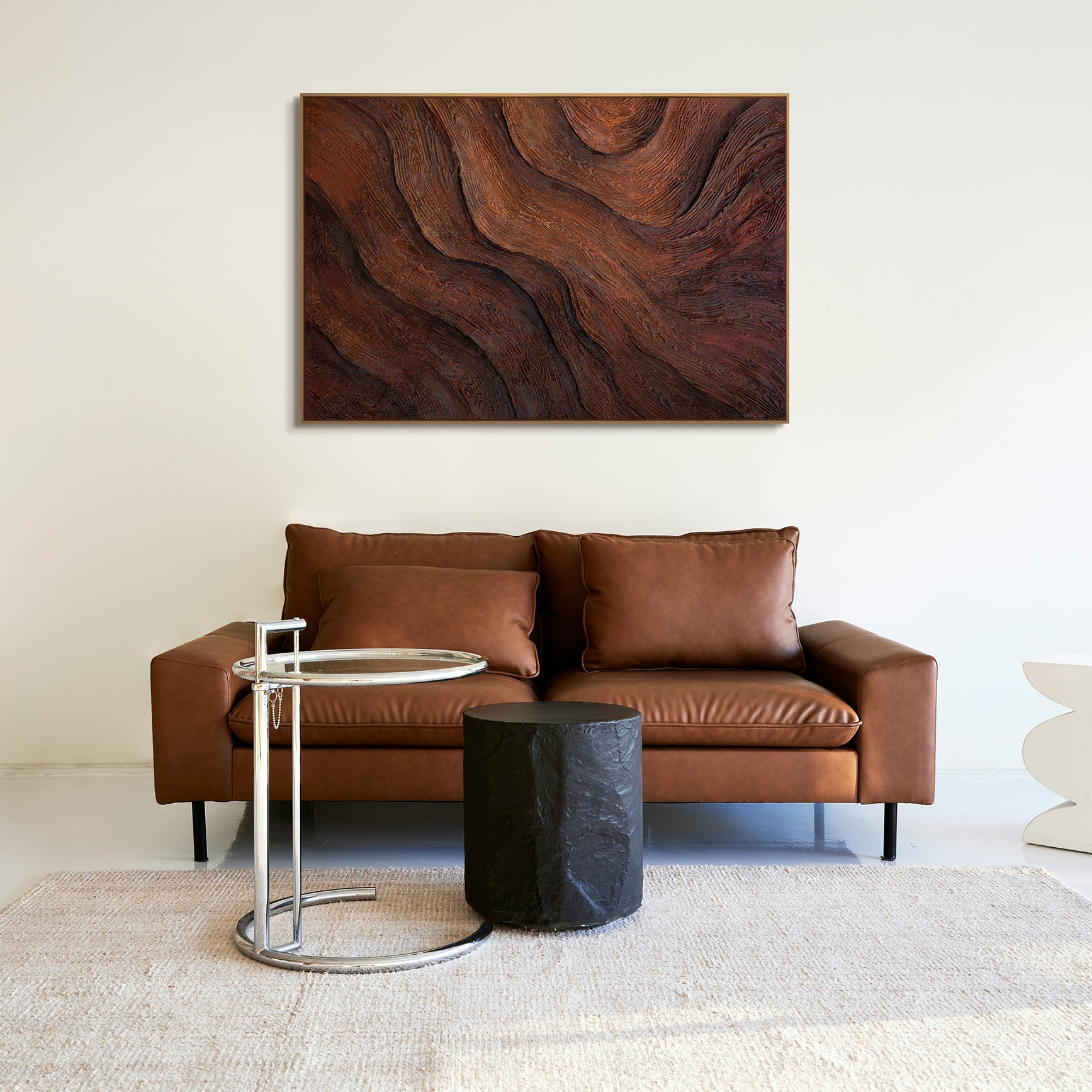 „Atem des Baumes“ ist eine strukturierte abstrakte Acrylmalerei mit ausgeprägter Holzmaserung und warmen, erdigen Farbtönen. Die reliefartige Oberfläche erinnert an natürliche Wachstumsbewegungen und verleiht dem Bild Tiefe, Ruhe und eine starke materielle Präsenz.