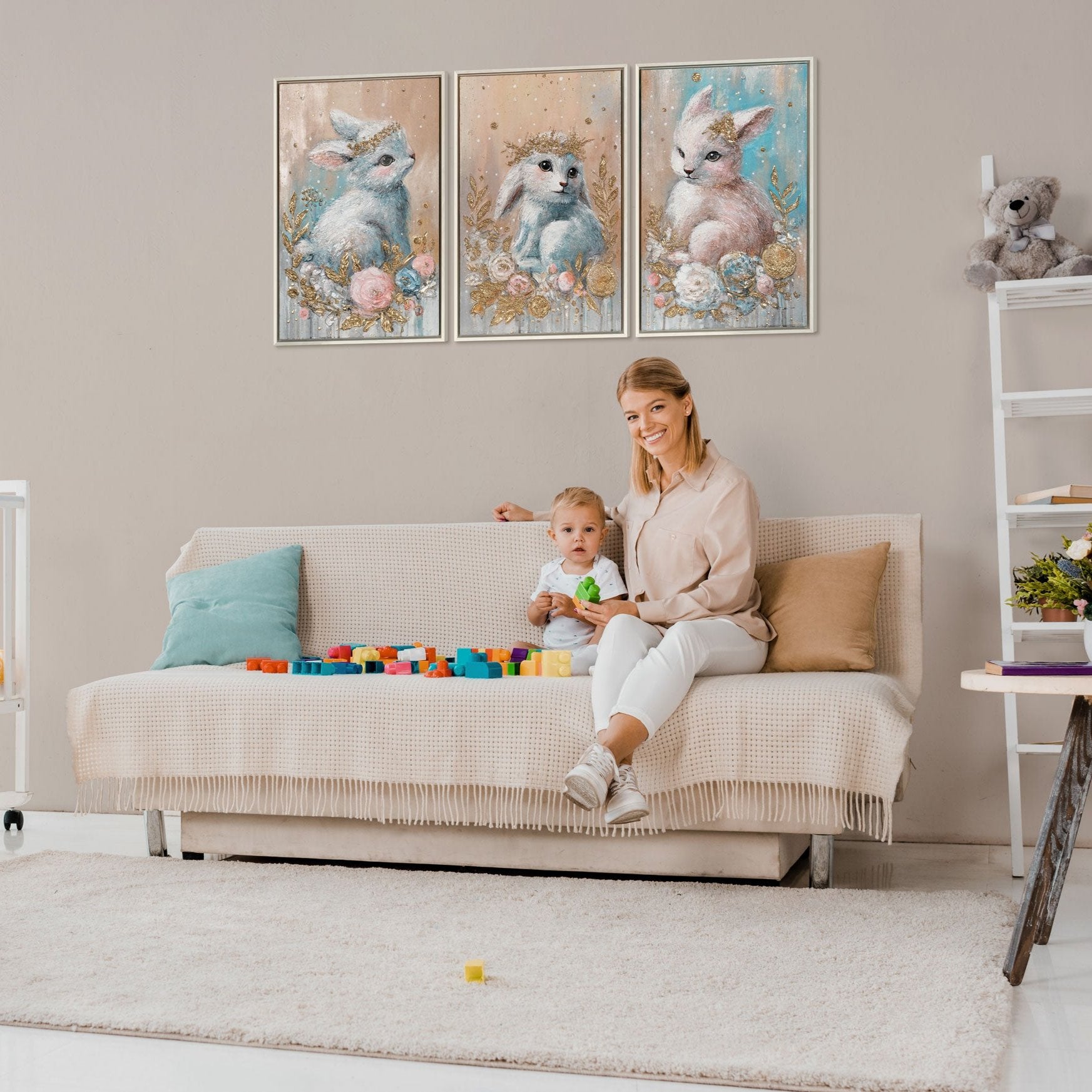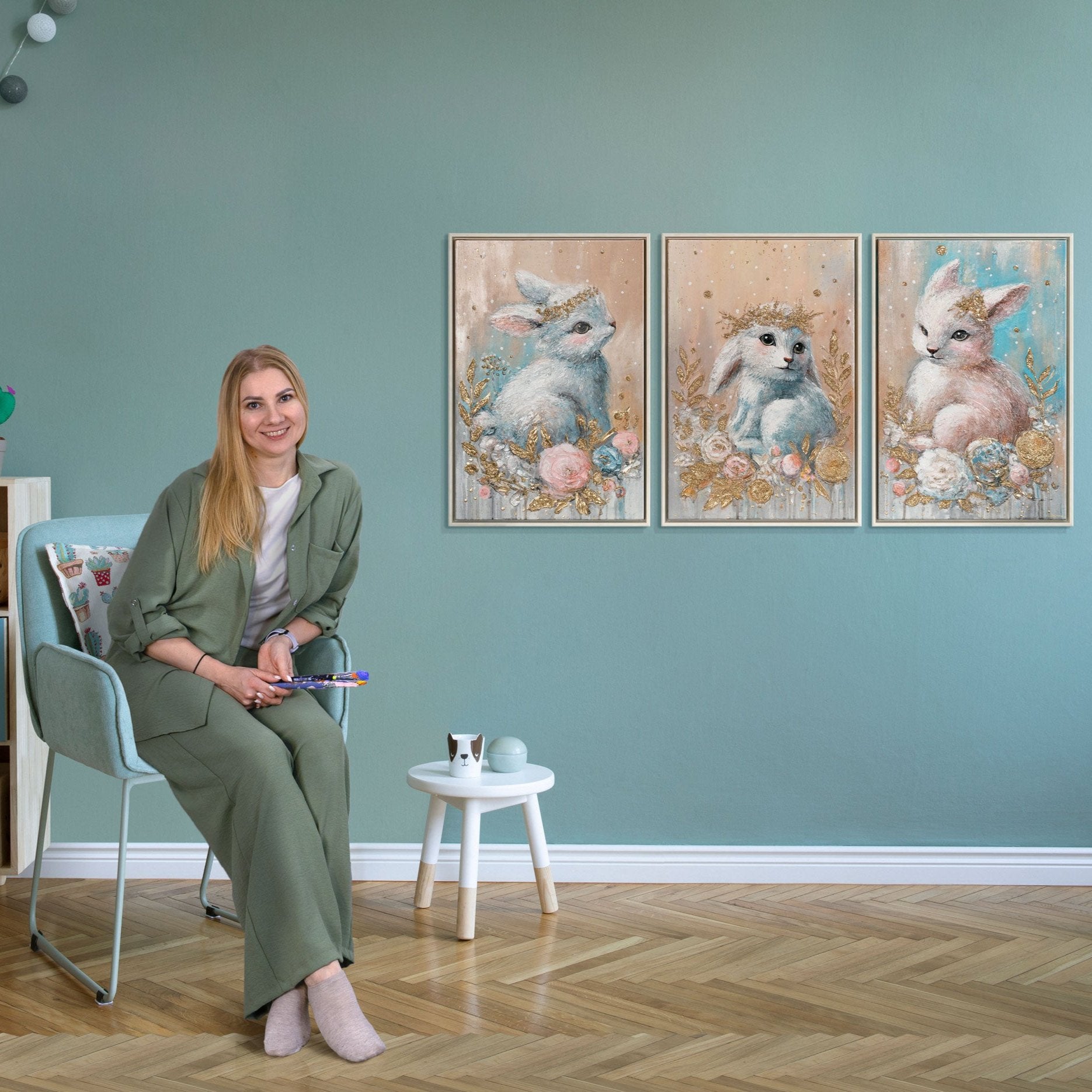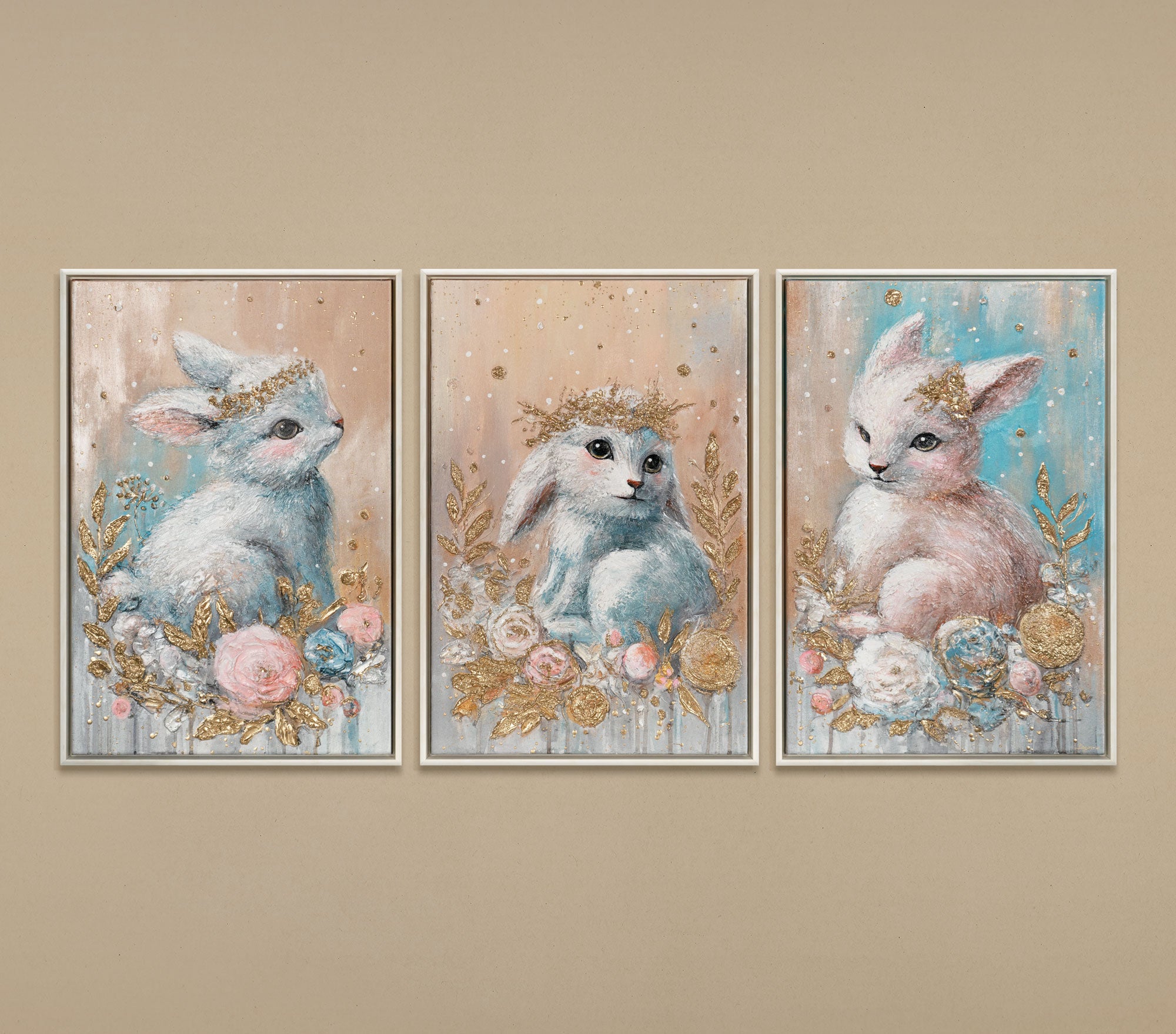 The triptych "Forest Children" is a charming hand-painted acrylic canvas featuring three lovingly crafted scenes of woodland animals in soft pastel tones. The textured surface highlights the delicate details of the forest children, creating a warm and inviting atmosphere. This original artwork brings a magical, fairy-tale charm to any nursery, children's room, or serene living space.