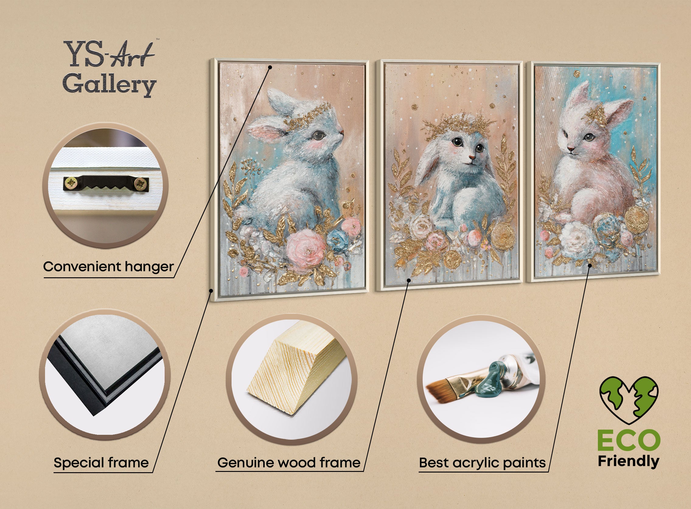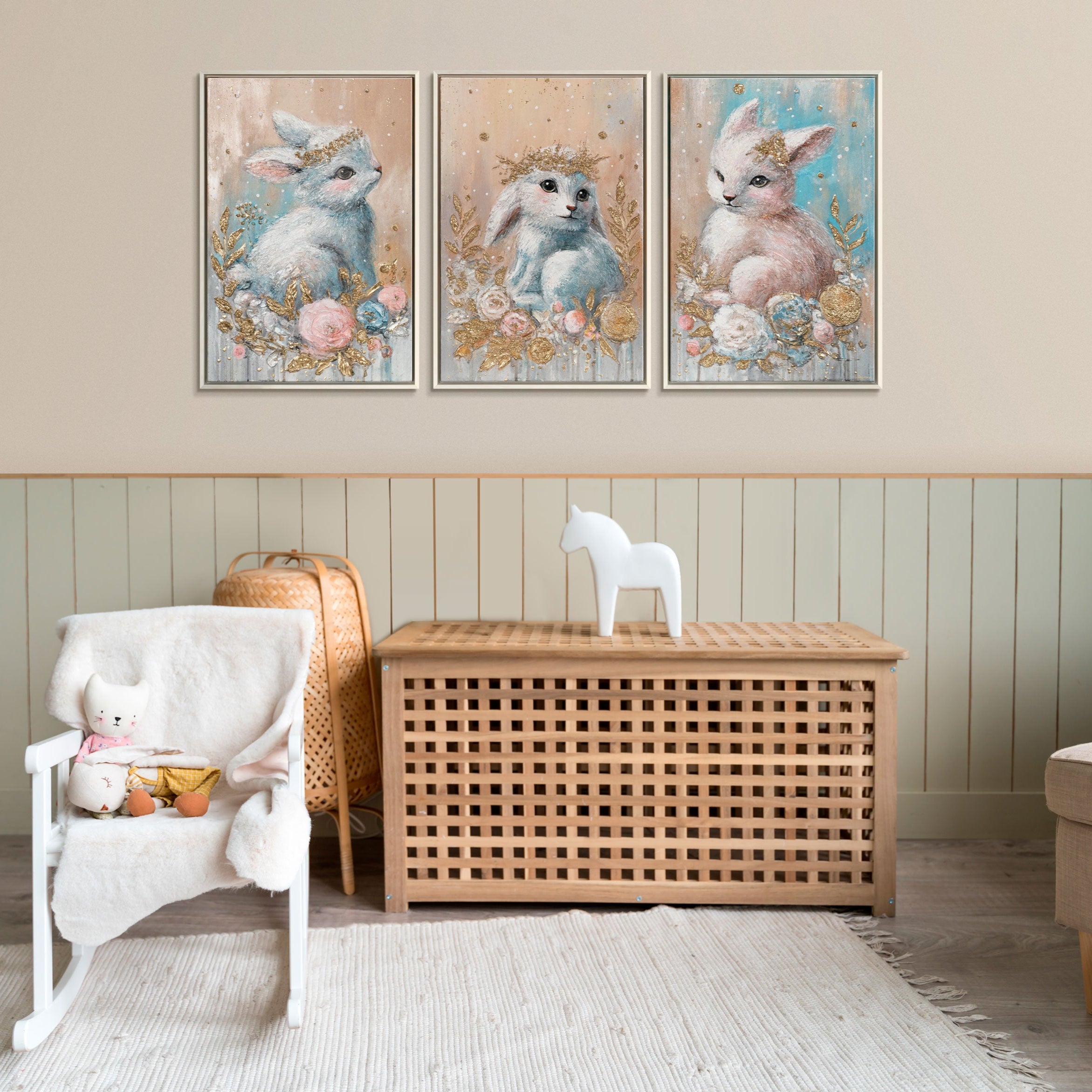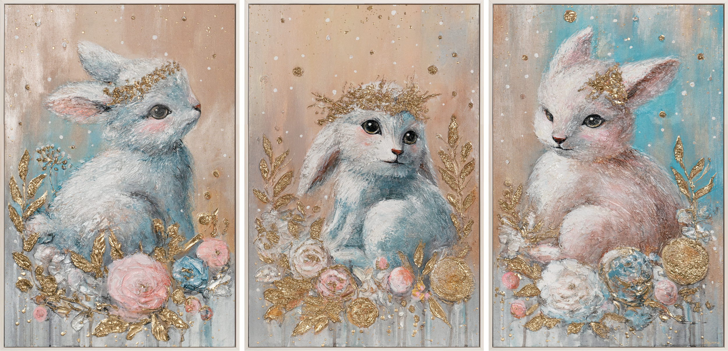 The triptych "Forest Children" is a charming hand-painted acrylic canvas featuring three lovingly crafted scenes of woodland animals in soft pastel tones. The textured surface highlights the delicate details of the forest children, creating a warm and inviting atmosphere. This original artwork brings a magical, fairy-tale charm to any nursery, children's room, or serene living space.