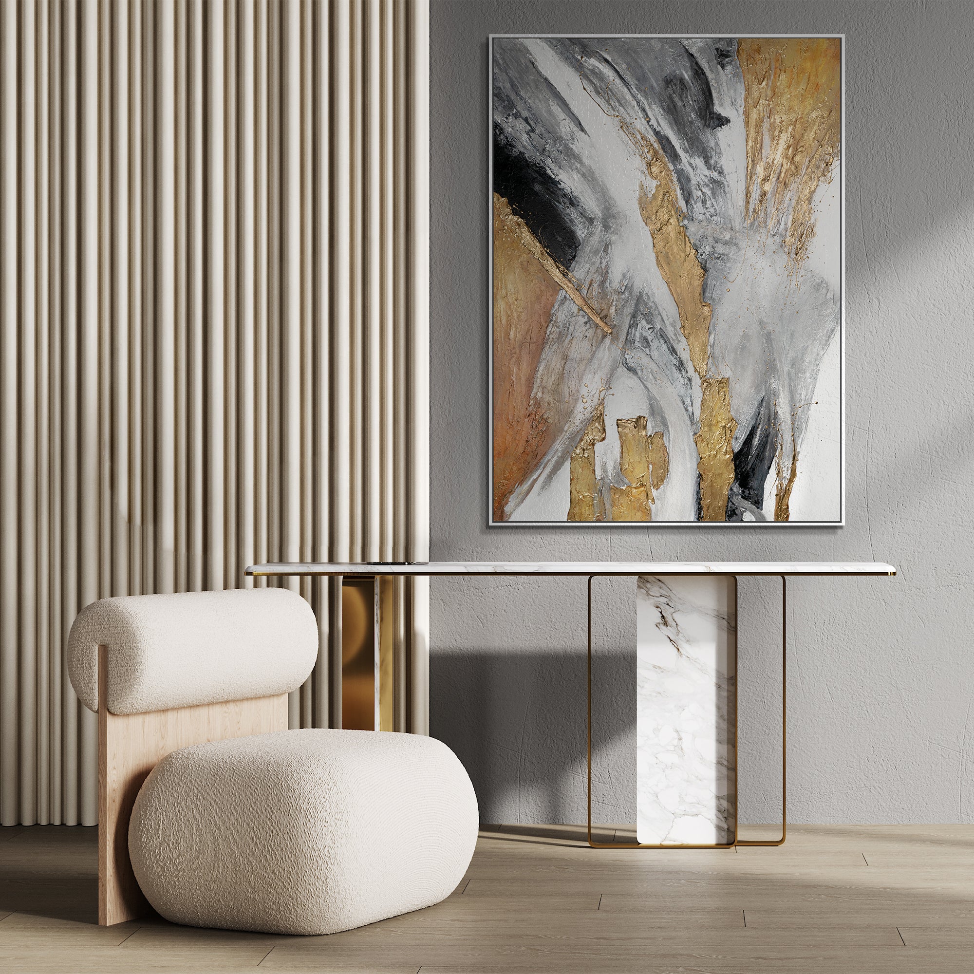 Enrich your home or office with this elegant abstract artwork, featuring a dynamic and modern composition in golden and gray tones. The image captivates with bold contrasts and expressive brushstrokes. It is 100% hand-painted and is highlighted by an elegant frame.