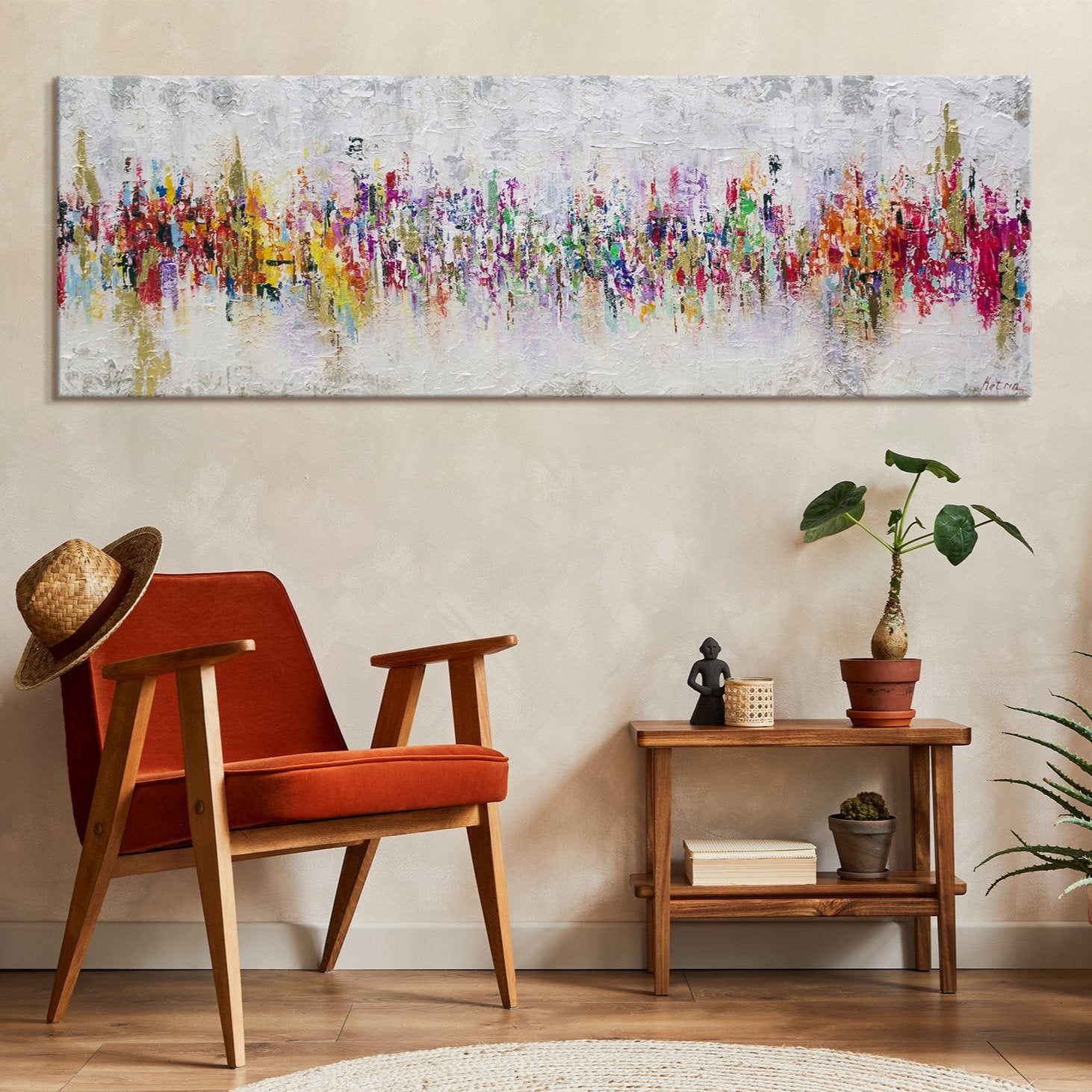 This colorful abstract canvas painting brings vibrancy and energy to any room. The dynamic brushstrokes and vibrant colors give the painting a modern aesthetic that's perfect for contemporary living spaces.
