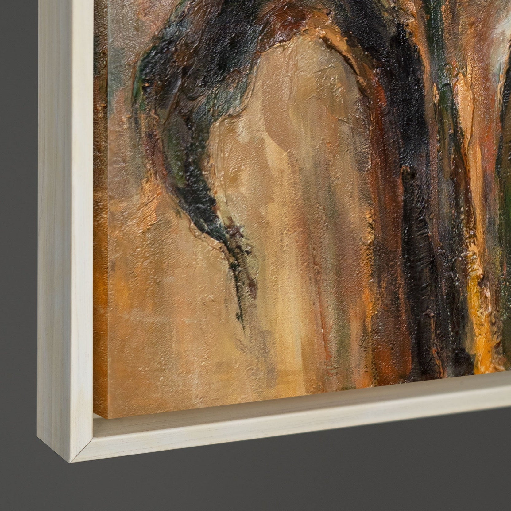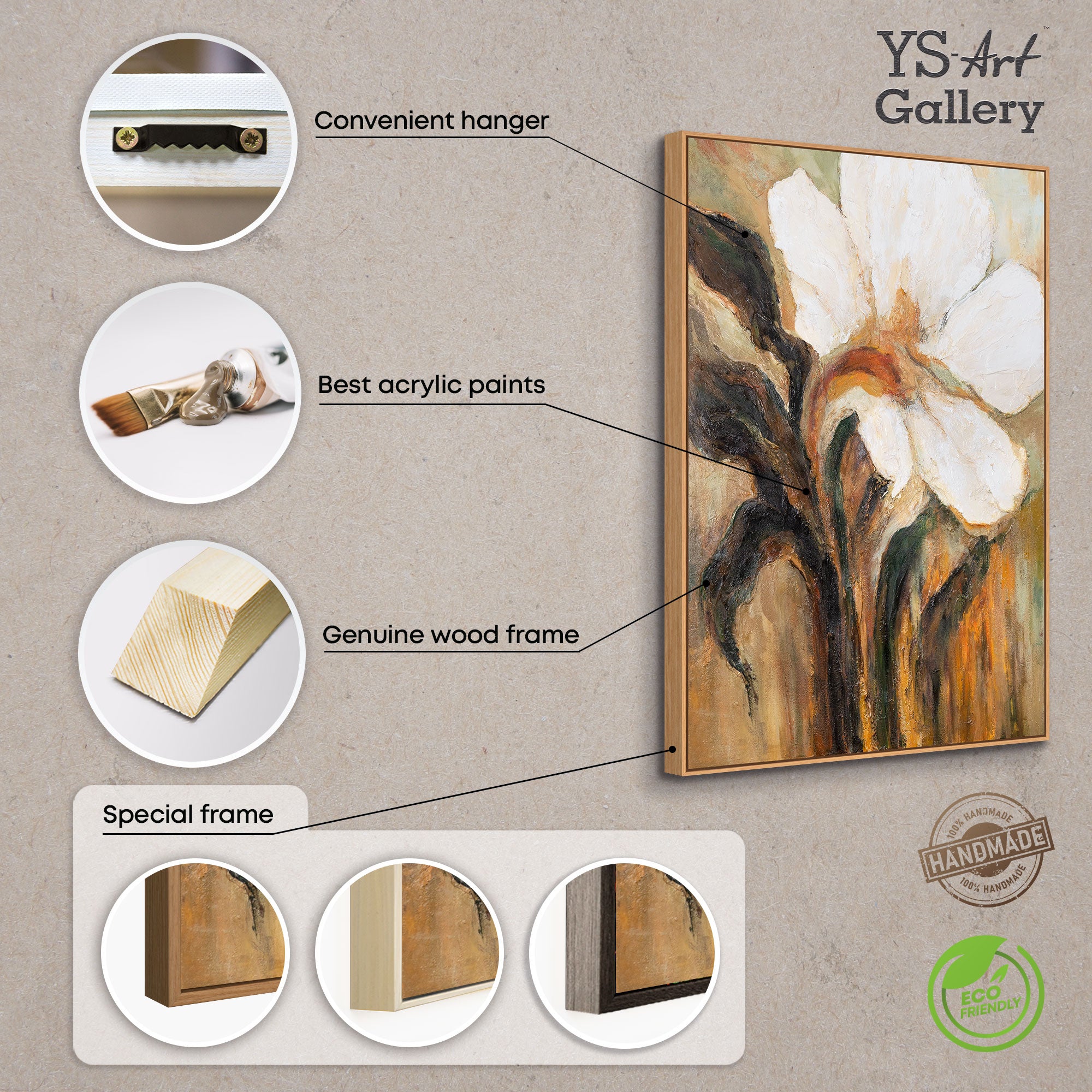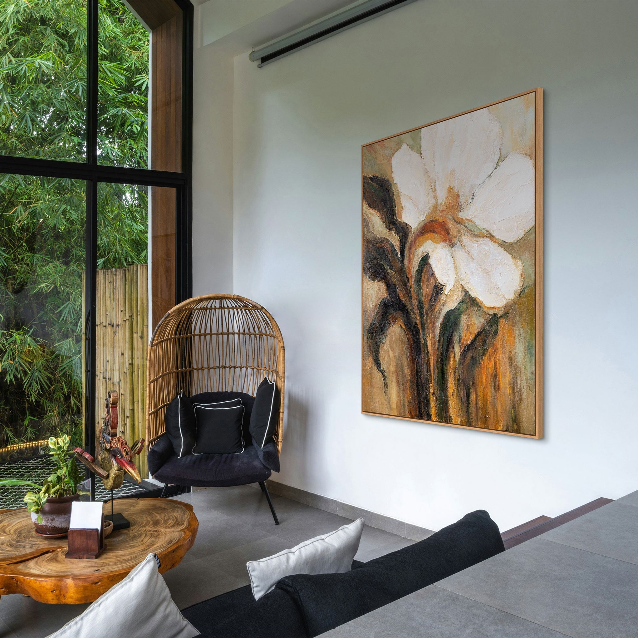 The hand-painted canvas painting "Passing of Time" features an impressive white flower, with textures and colors that create a harmonious blend of natural beauty and artistic expression. Warm Brown and Green tones, interspersed with soft Orange and Gold nuances, give the flower depth and vibrancy. The textured surface highlights the sculptural effect and makes every detail palpable.