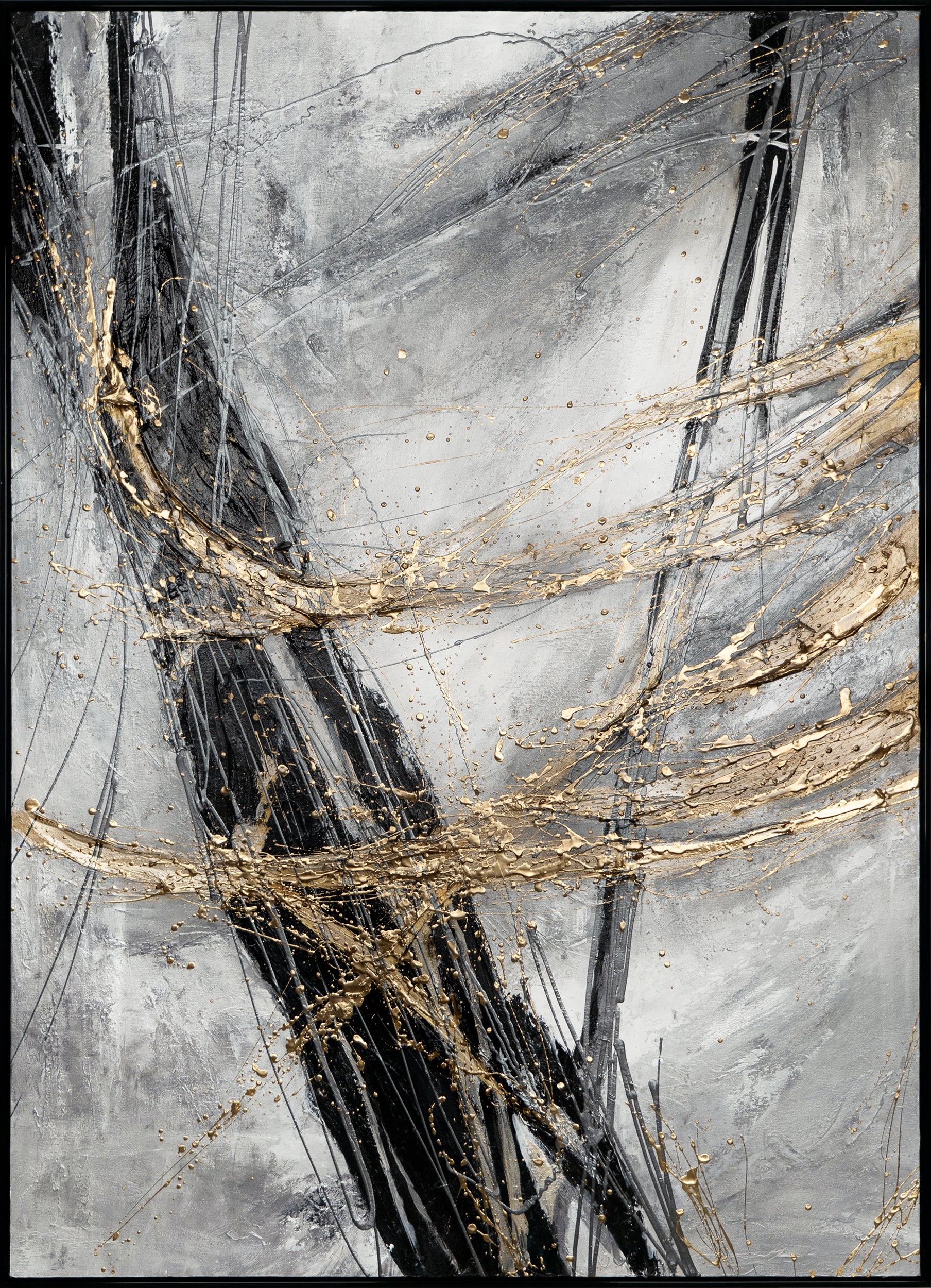 "Golden Stroke" blends bold black brushwork with delicate gold accents to create a striking piece of modern wall art. This textured acrylic painting on canvas offers a sophisticated contrast of depth and shine, making it an ideal addition to contemporary interiors. A luxurious and expressive artwork for any living space.