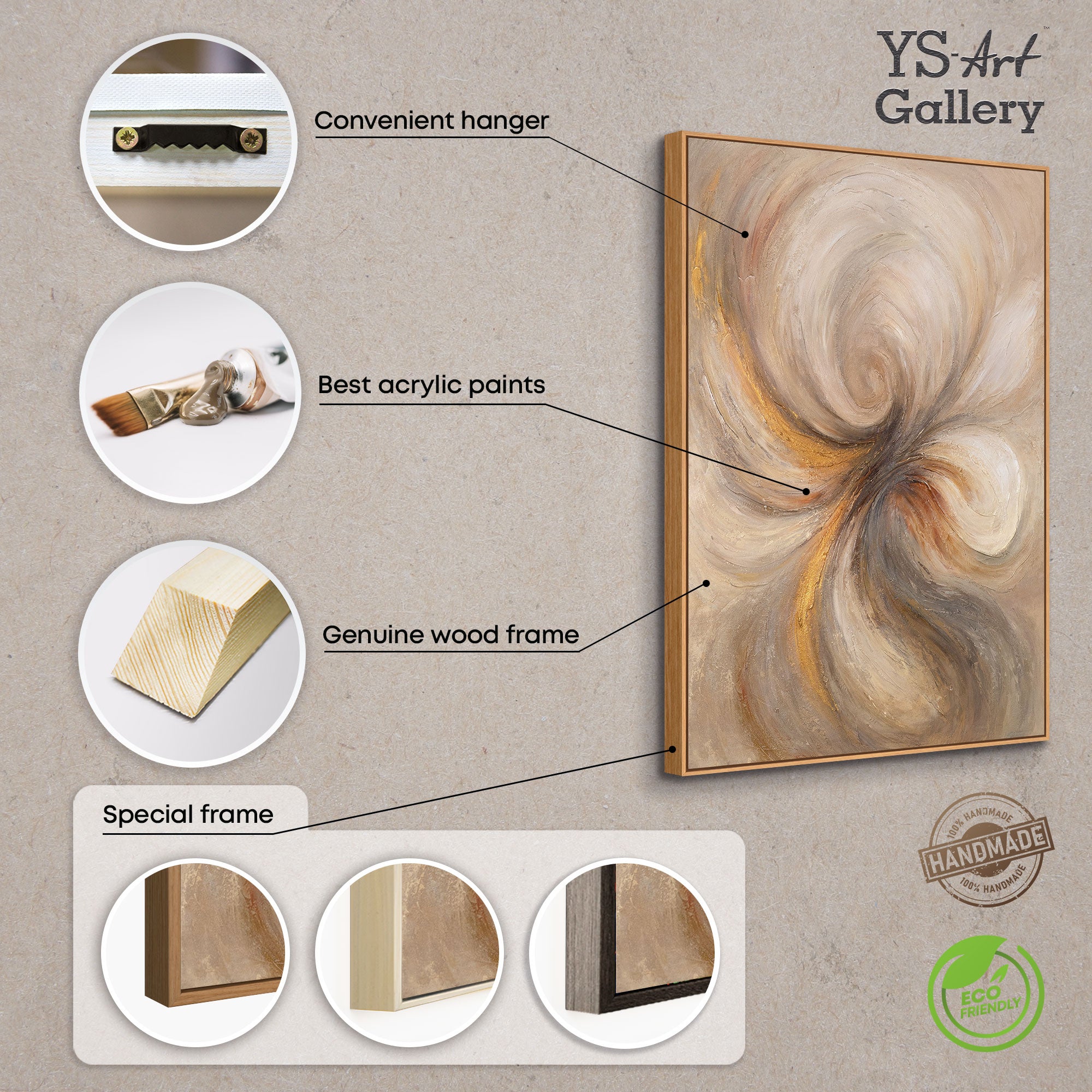 "Energy of the Flow" is an abstract, hand-painted acrylic painting that captures the power and elegance of movement with flowing swirls in Beige, Gray, and Gold tones. The composition resembles dynamic currents weaving together, creating intense visual tension. The textured surface allows the light to play gently, adding depth to the piece.