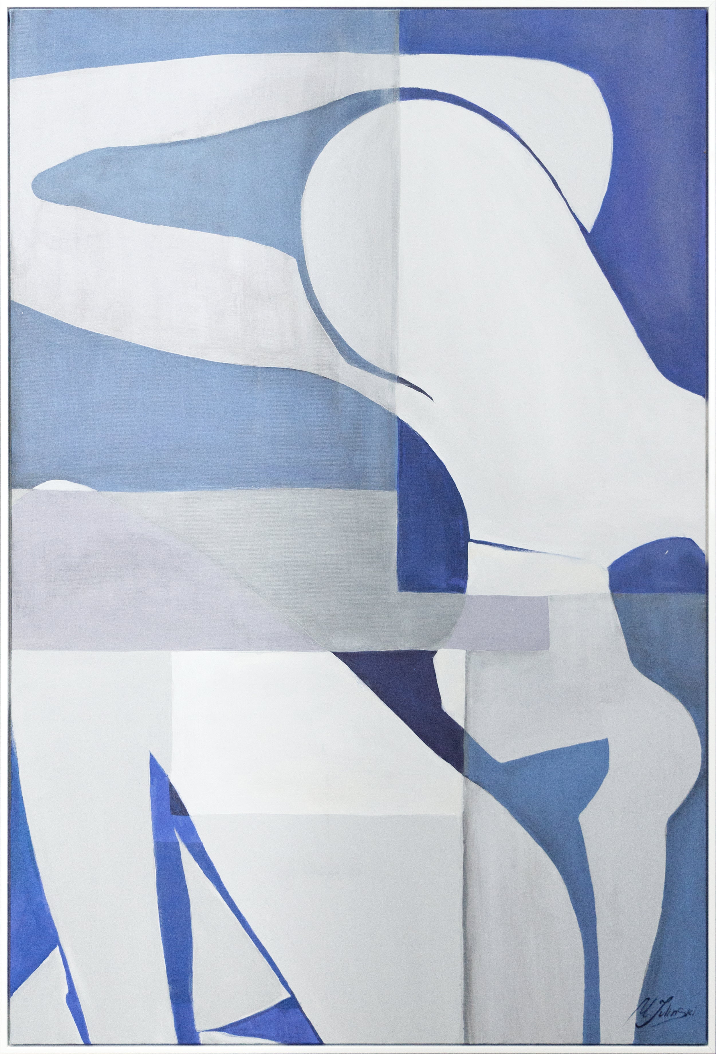 "Sandy" is a calming abstract acrylic painting defined by cool blue tones and dynamic composition. The hand-painted surface features layered brushwork and organic shapes that evoke a tranquil, modern atmosphere. Ideal for spaces seeking both sophistication and visual calm.