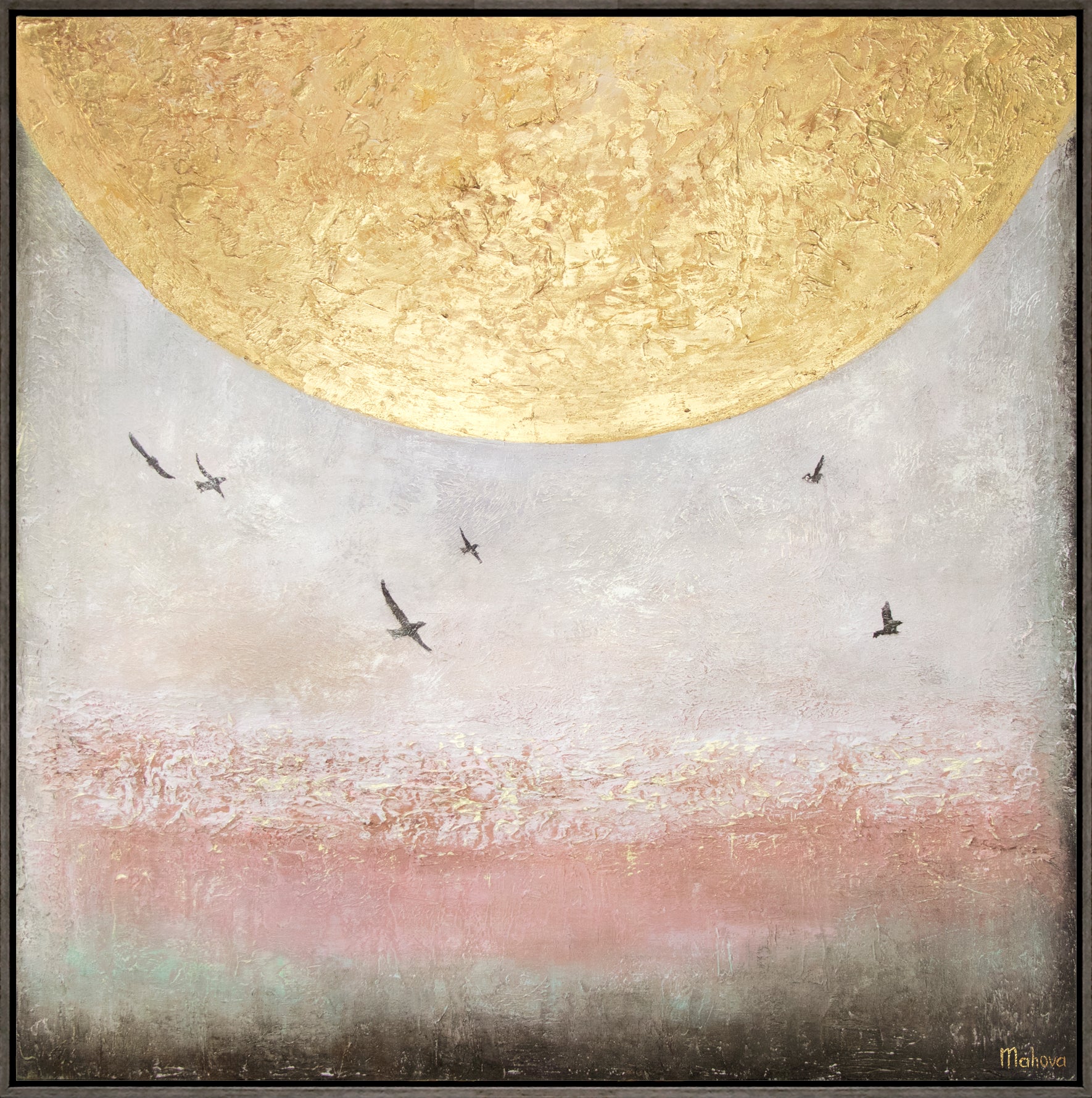 This abstract art painting on canvas impresses with its minimalist depiction of a sky with flying birds and a golden accent that perfectly rounds off the scenery. Hand-painted on high-quality canvas, this picture brings a modern yet tranquil atmosphere to any home. Ideal for the living room, bedroom, or study.