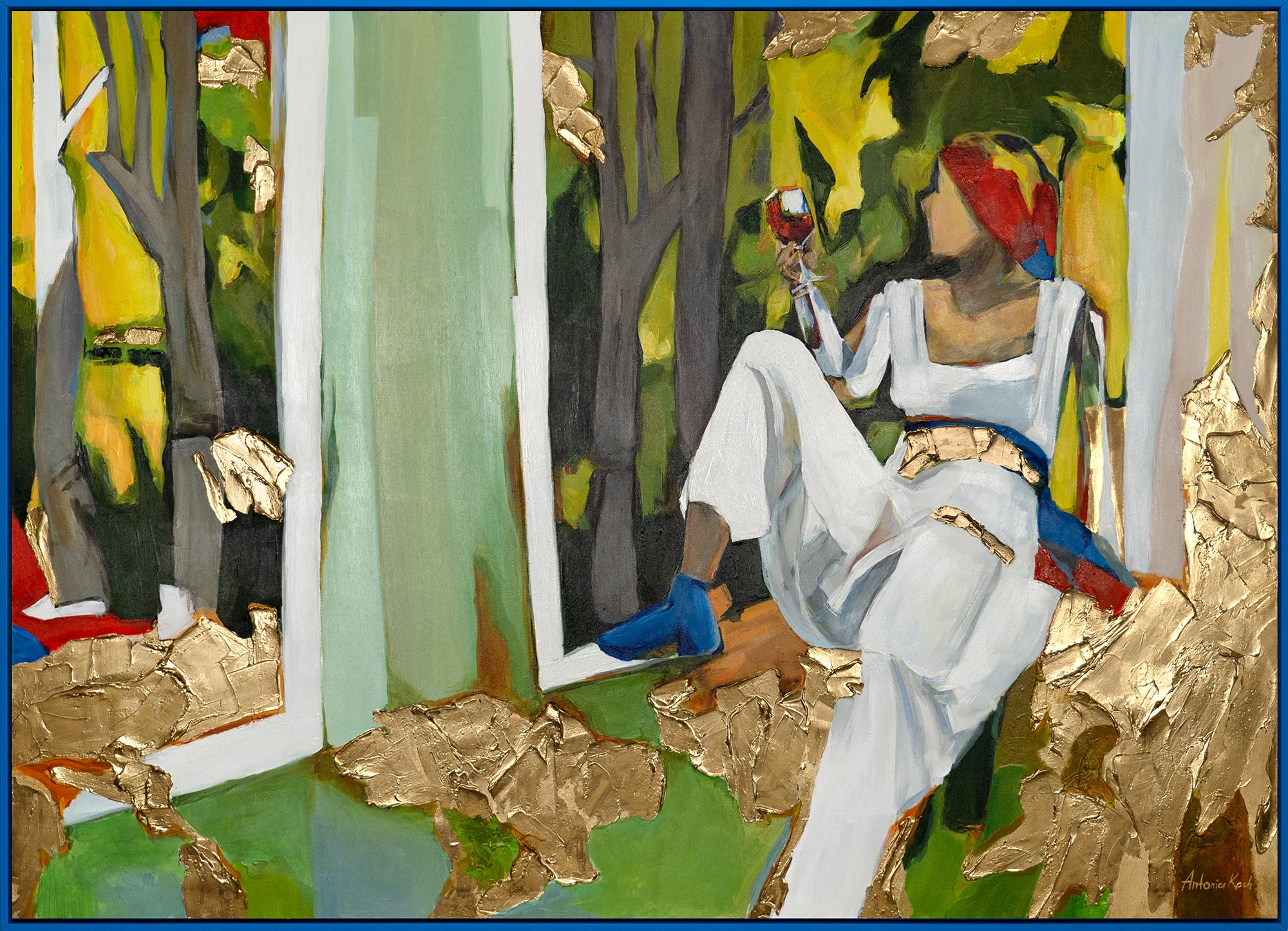 Enrich your home or office with this colorful abstract painting depicting a relaxed moment of inspiration. The artwork features bold colors and dynamic brushstrokes. It is 100% hand-painted and highlighted by an elegant blue frame.