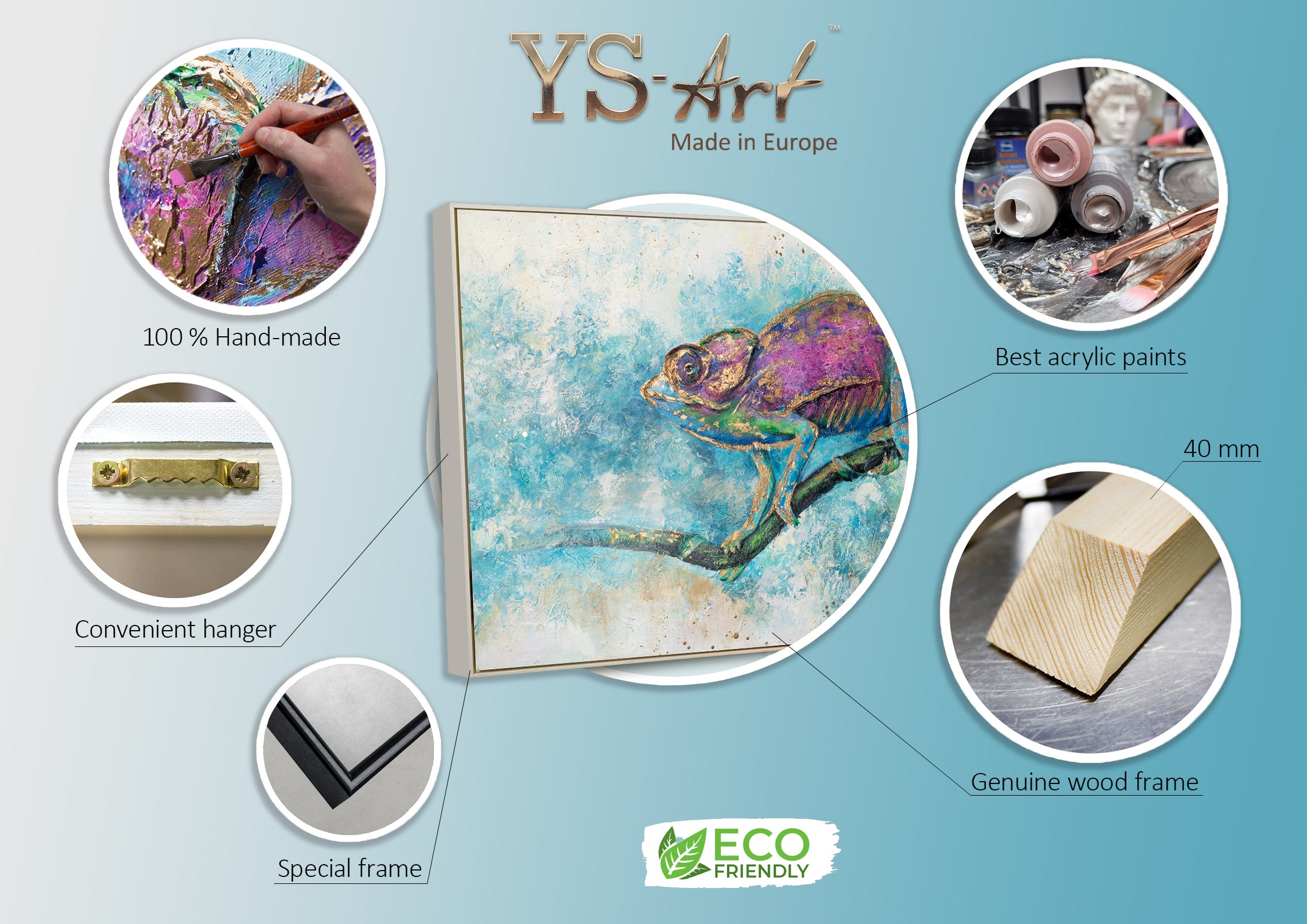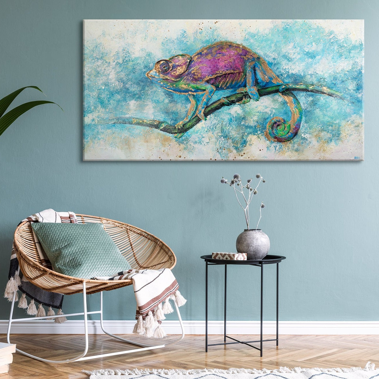 Enrich your collection with this mesmerizing, hand-painted chameleon painting. This modern artwork depicts a chameleon perched on a branch, surrounded by a background in shades of blue and green. The use of acrylic paints adds depth and texture to the image, making it a focal point in any room. It is 100% hand-painted and is highlighted by an elegant frame.