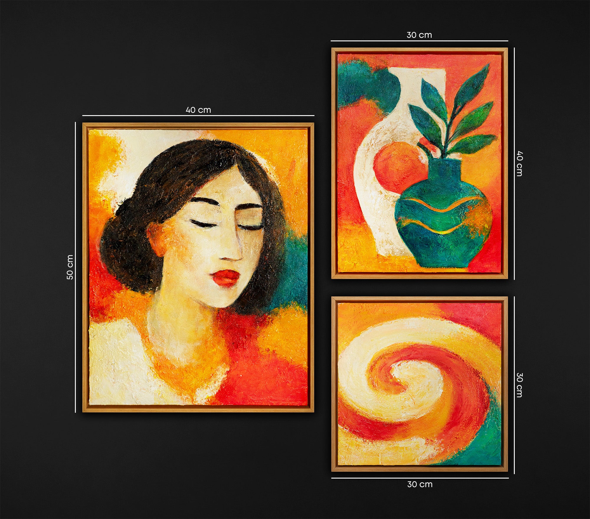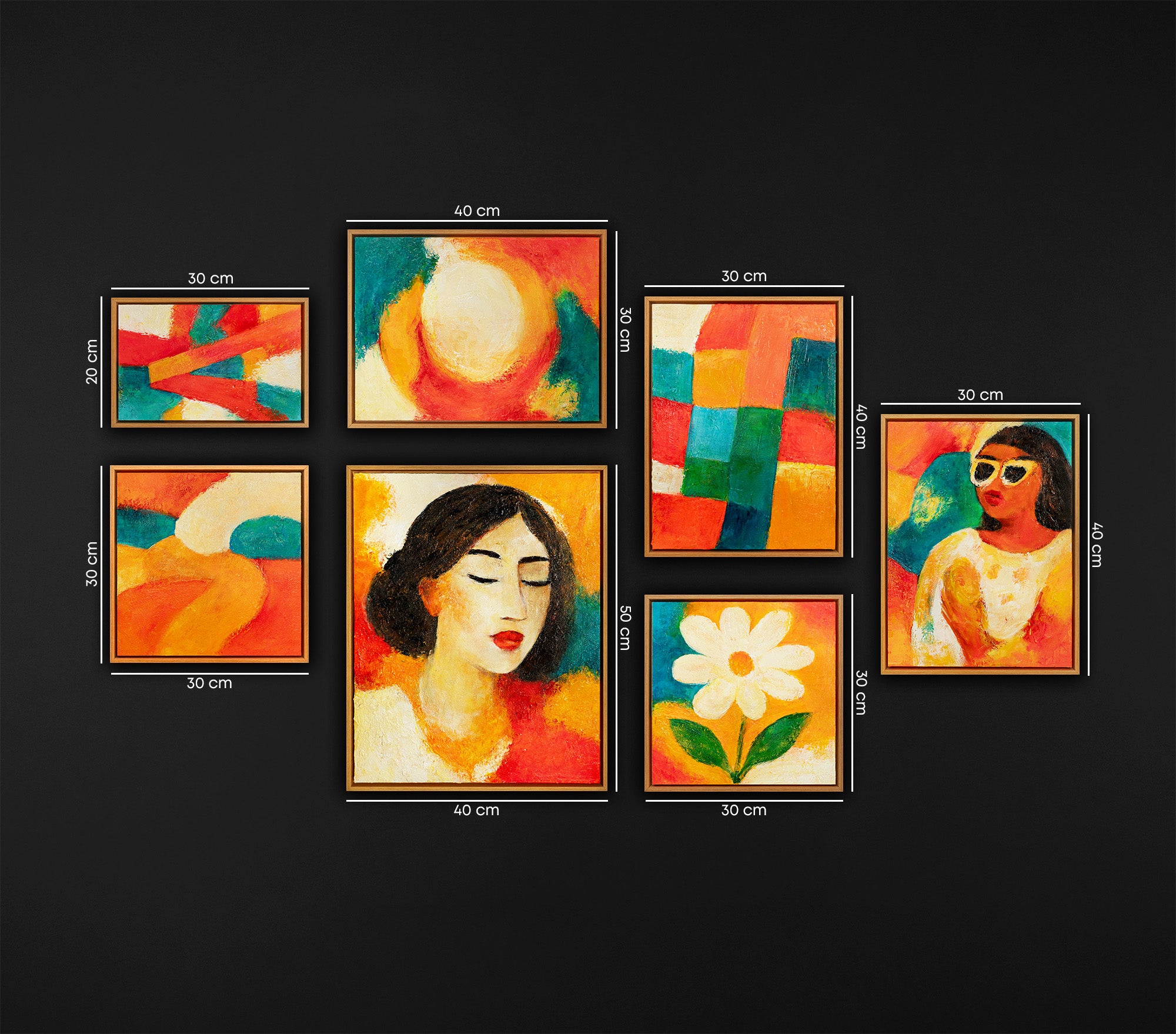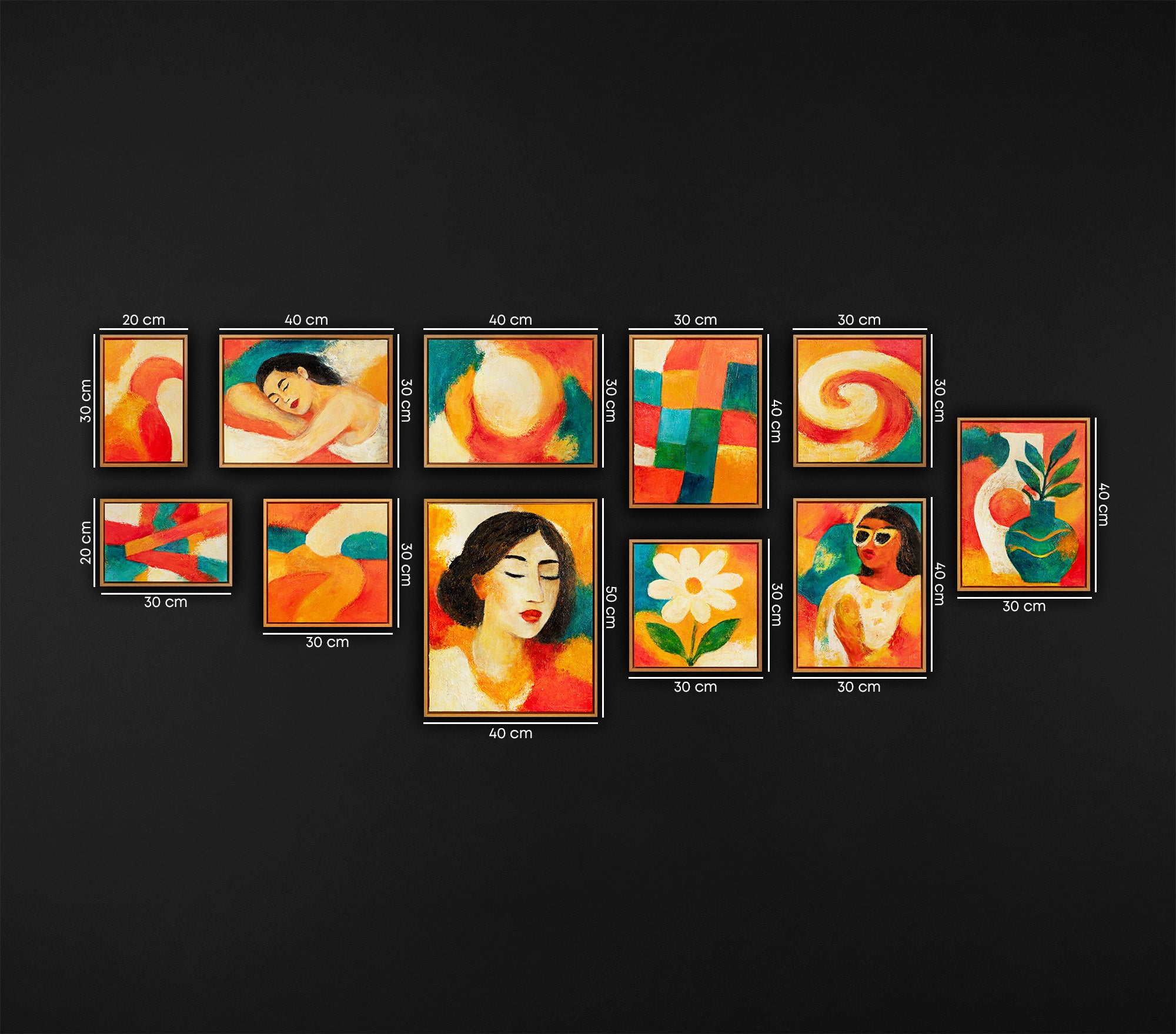 Inspirierende Ästhetik für Ihr Zuhause: Ein Fest der Farben und Formen Verwandeln Sie Ihren Wohnraum mit dem Set "Sunlit Portraits" in einen Ort voller Wärme und Ausdruckskraft. Dieses exklusive Wandbilder Set Wohnzimmer kombiniert kunstvolle Frauenporträts mit floralen Motiven und abstrakten Elementen in einer harmonischen 11-teiligen Galerie. Diese modernen Bilder für das Wohnzimmer bringen mit ihren leuchtenden Gelb-, Orange- und Rottönen pure Lebensfreude in Ihre vier Wände.