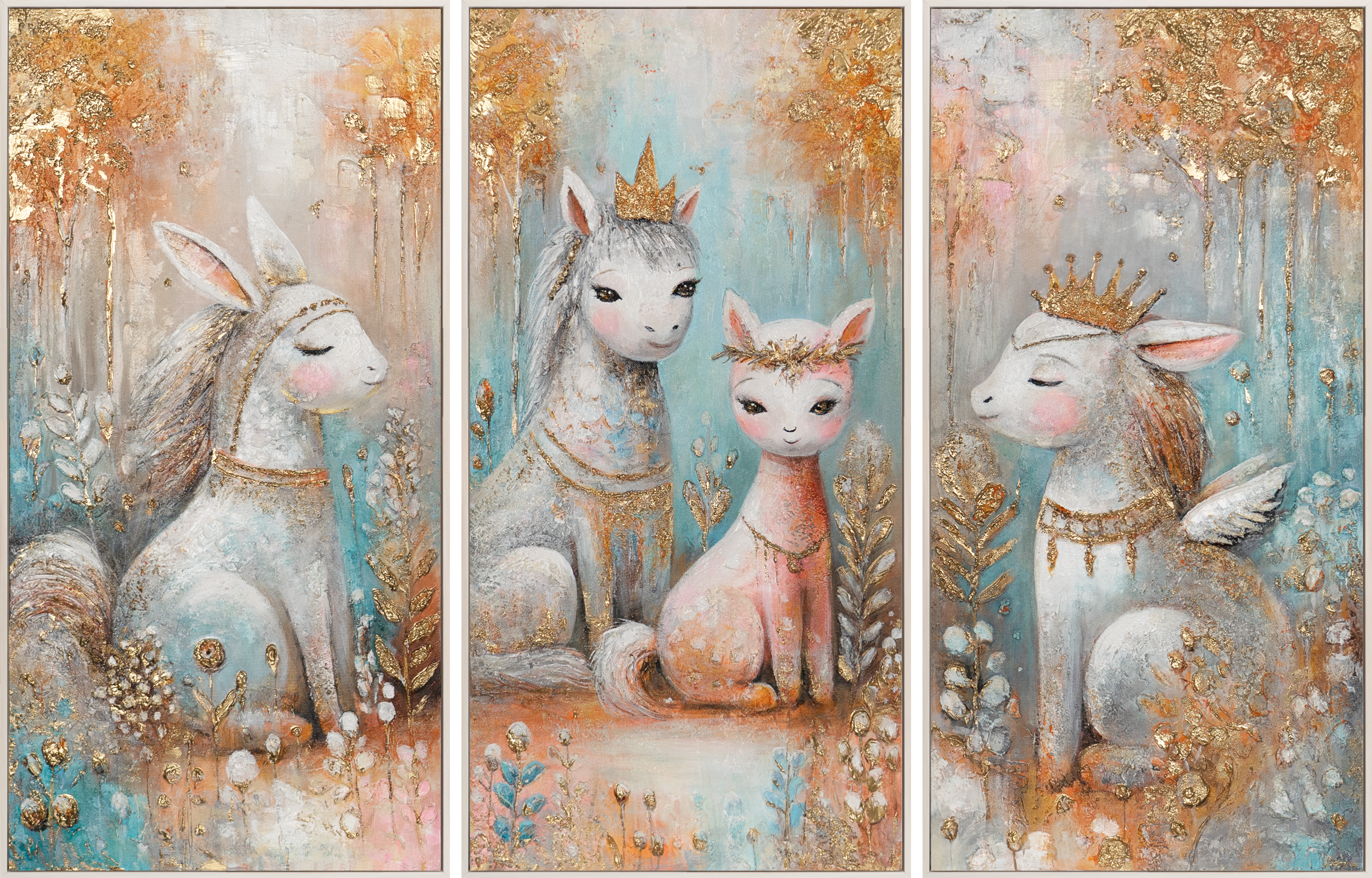 The triptych "Fairy-Tale Creatures" features a charming composition of three hand-painted canvases with whimsical, magical figures. Soft pastel tones, golden accents, and meticulously crafted details create a magical atmosphere, turning any children’s room into a dreamy world. The hand-painted texture and generous size of the three-panel canvas provide an impressive decorative statement, radiating warmth and coziness.