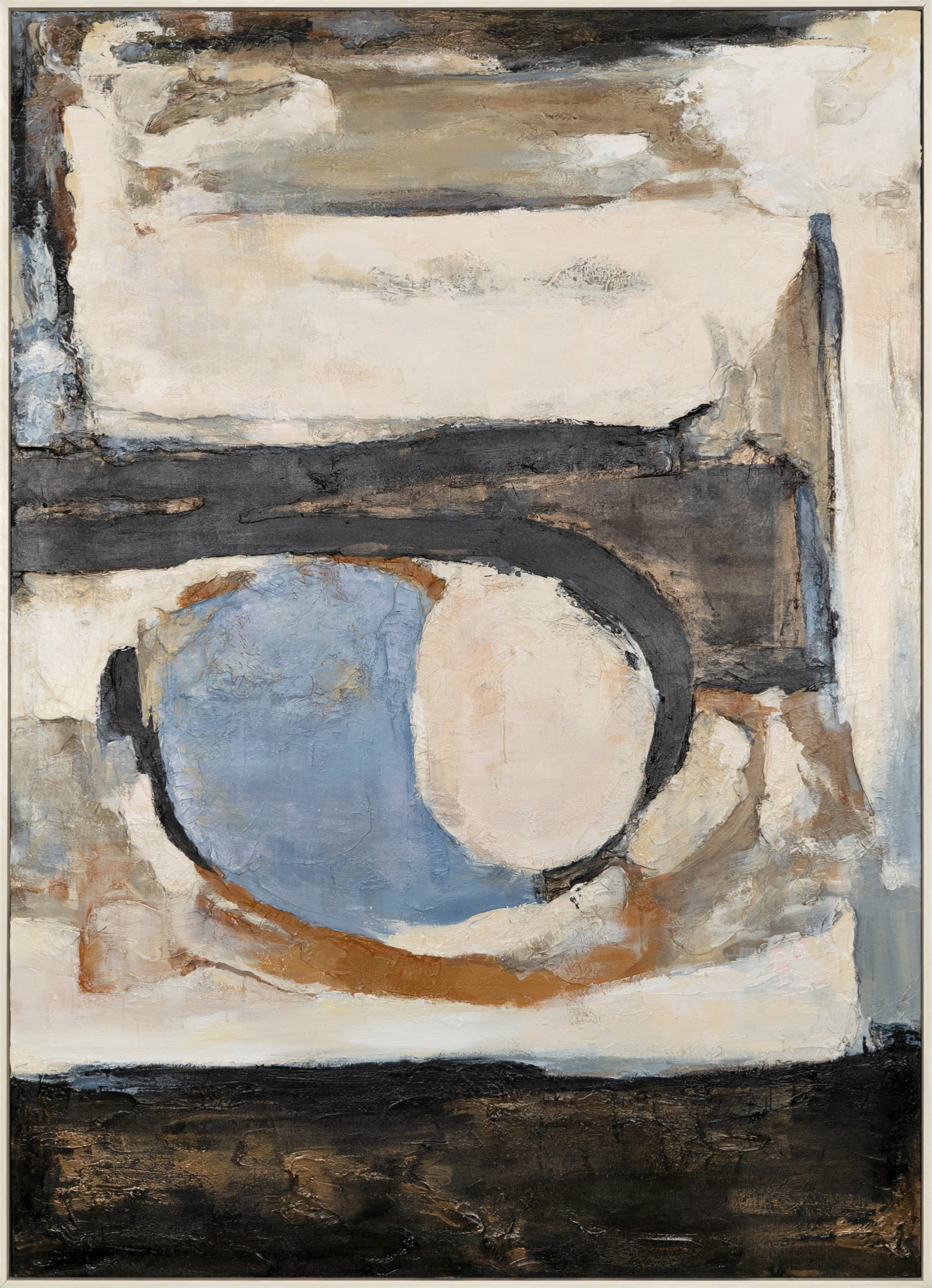 This abstract canvas artwork blends soft beige and gentle blue tones with contrasting black and rust accents. The textured paint application creates tangible depth and a sense of movement, evoking urban shapes, walls, or architectural fragments interpreted in an abstract way.