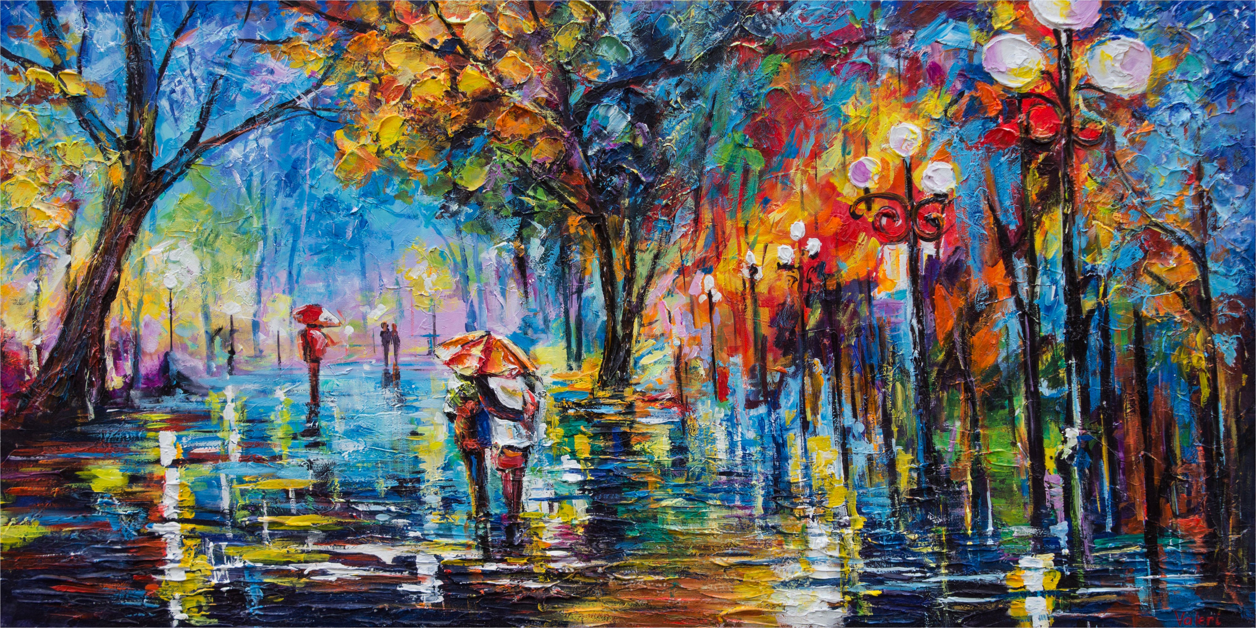 This vibrant canvas painting captures the magic of an autumn walk in bright, lively colors. In an impressionistic style, trees, lights, and figures are depicted along an autumn-colored alley – with red, yellow, blue, and purple accents reflecting the glow of wet streets under streetlights. The scene feels dynamic yet poetic, as if capturing the sound of falling leaves and the soft murmurs of footsteps on the wet ground.