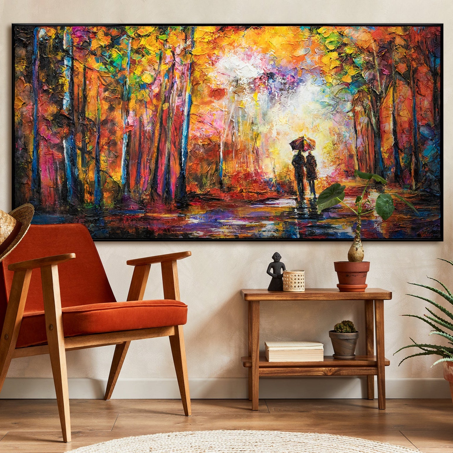 This impressive hand-painted acrylic artwork captures the beauty of an autumn stroll with vibrant colors. The perfect blend of gold, red, and orange hues creates a warm and inviting atmosphere. The textured painting technique gives the piece an intriguing depth, reflecting light in an elegant way.