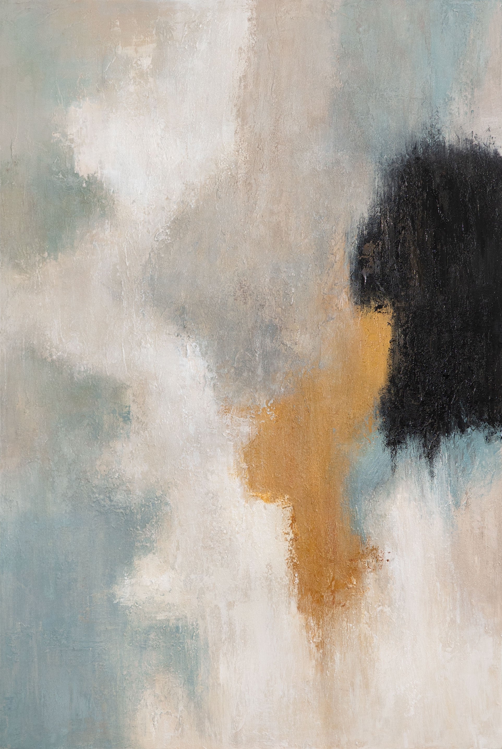 "Transitions of Light" is a modern, hand-painted acrylic painting that captivates with its harmonious blend of light beige, soft blues, and rich blacks. Warm gold accents lend the painting a special radiance, while the relief-like texture emphasizes depth and movement.