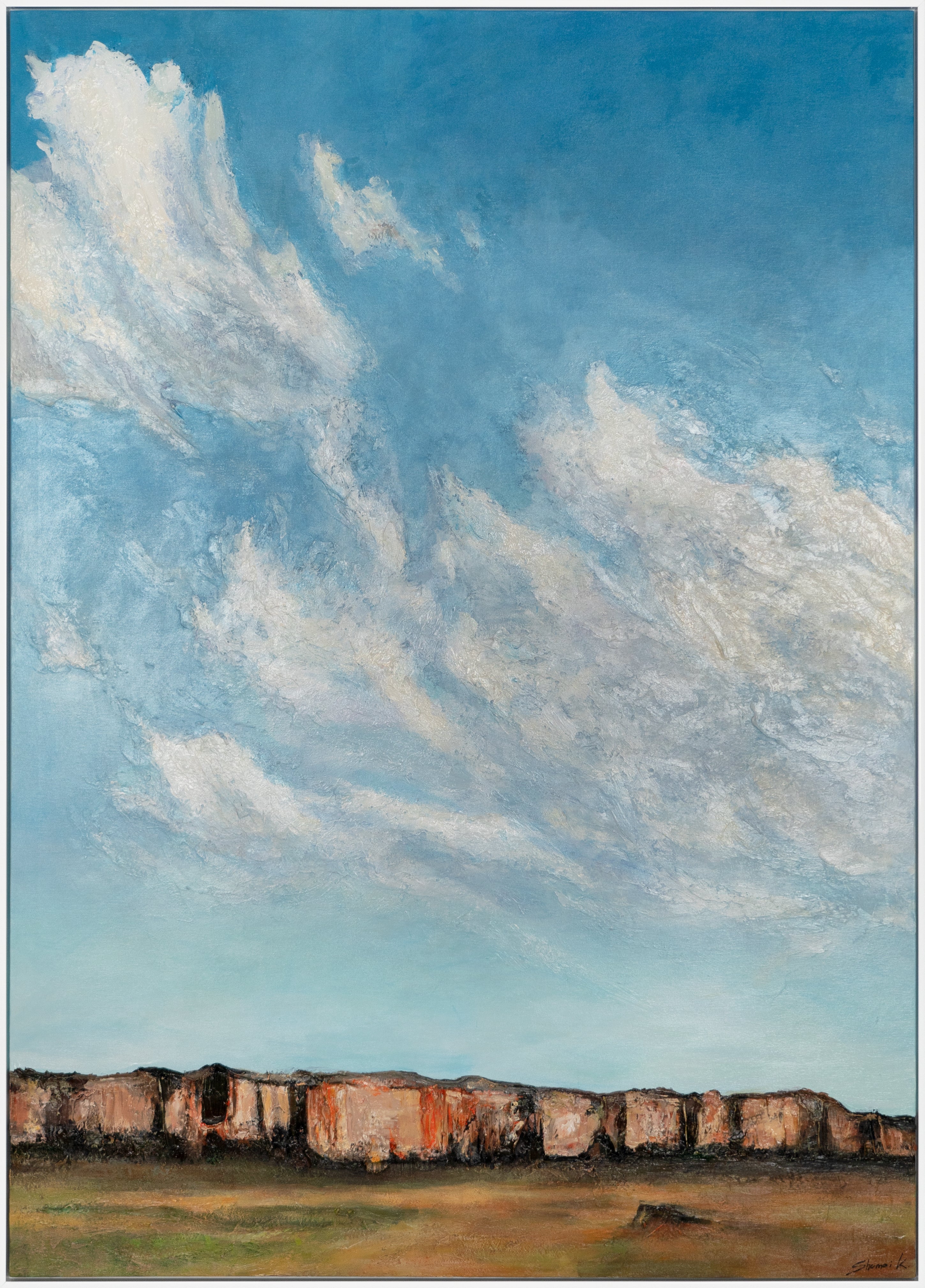 "Sky Over the Plains" is a captivating hand-painted acrylic landscape that evokes the stillness of nature and the grandeur of an open sky. With sweeping cloud formations and a soft horizon, this canvas painting adds depth, serenity, and timeless elegance to modern interiors. A perfect fit for living rooms or tranquil spaces.