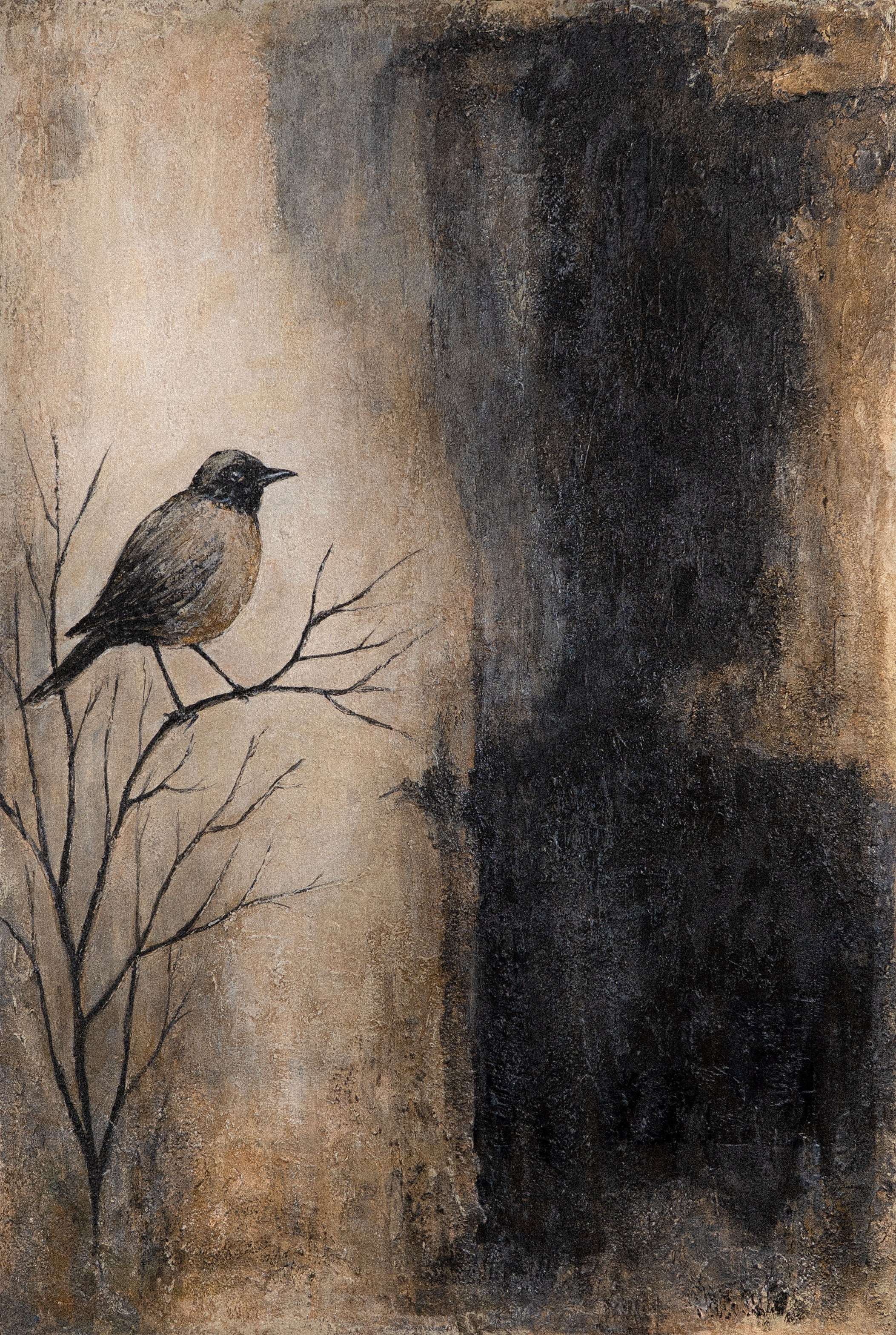 "Branch and Shadow" is a hand-painted acrylic painting that captivates with its expressive nature motif. A single bird perches on bare branches, nestled within a contrasting composition of warm beiges, earthy browns, and deep black. The textured surface lends the painting depth and a vibrant tactile quality that draws the eye.
