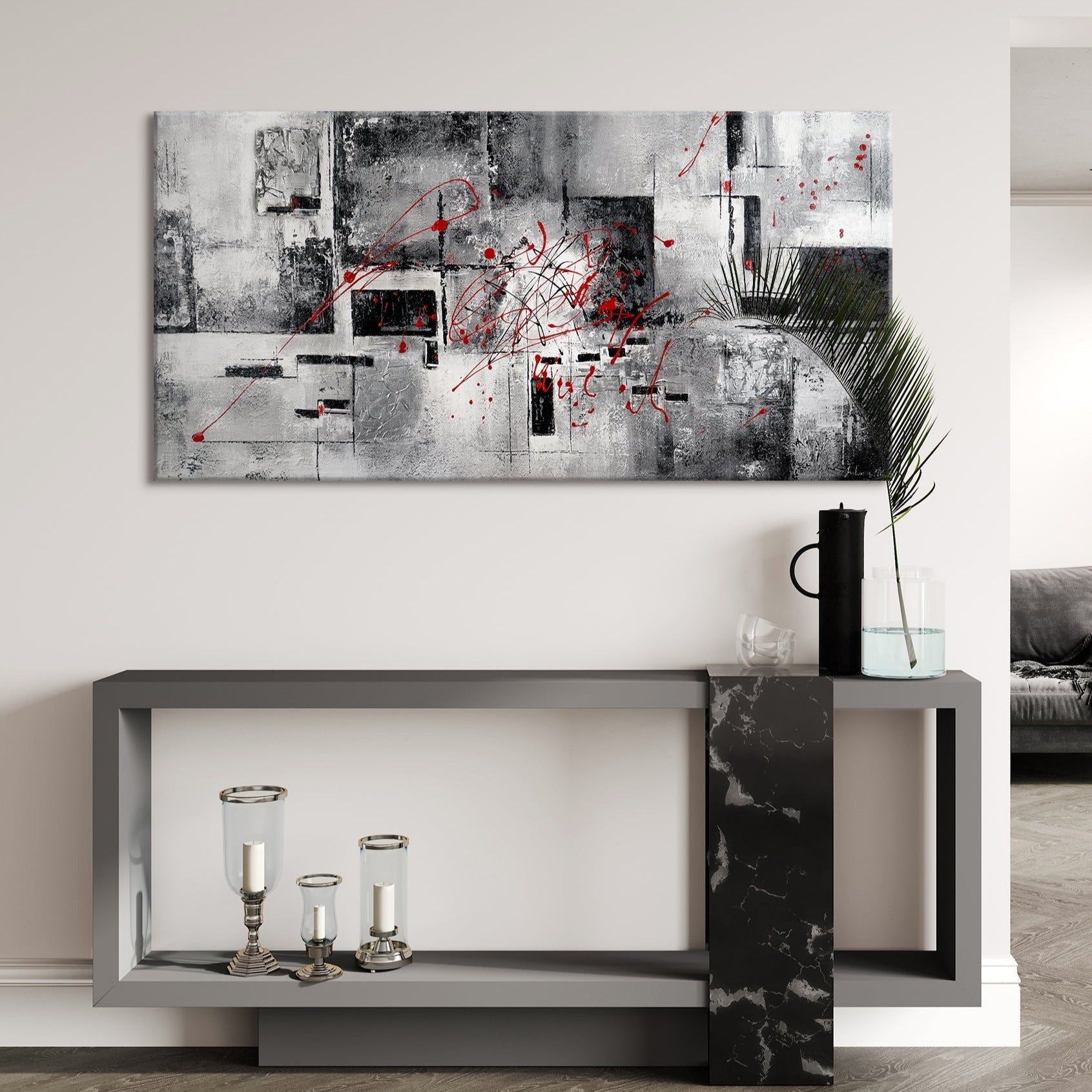 • gemälde abstrakt Wohnzimmer mit moderner Wandkunst in Grau und Rot