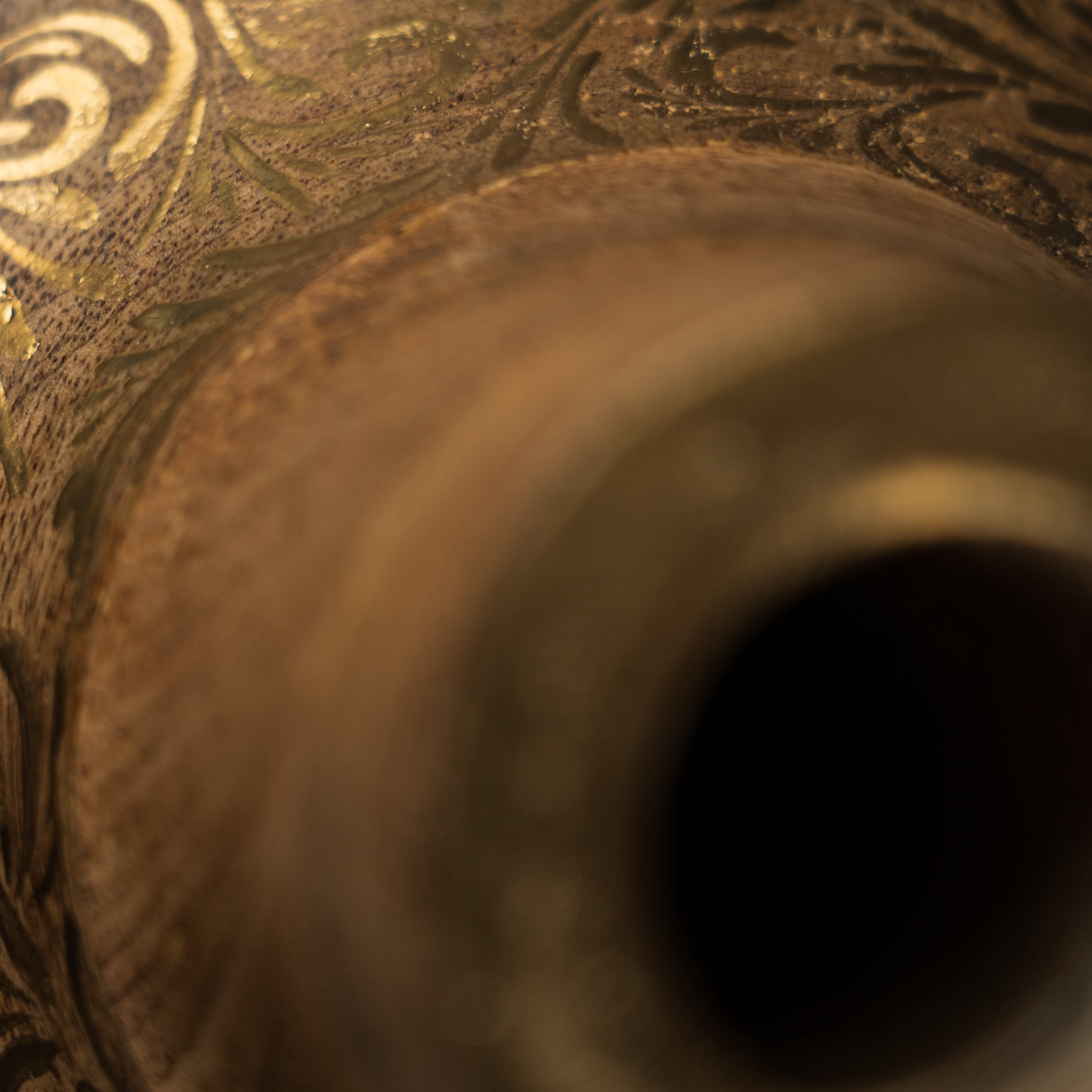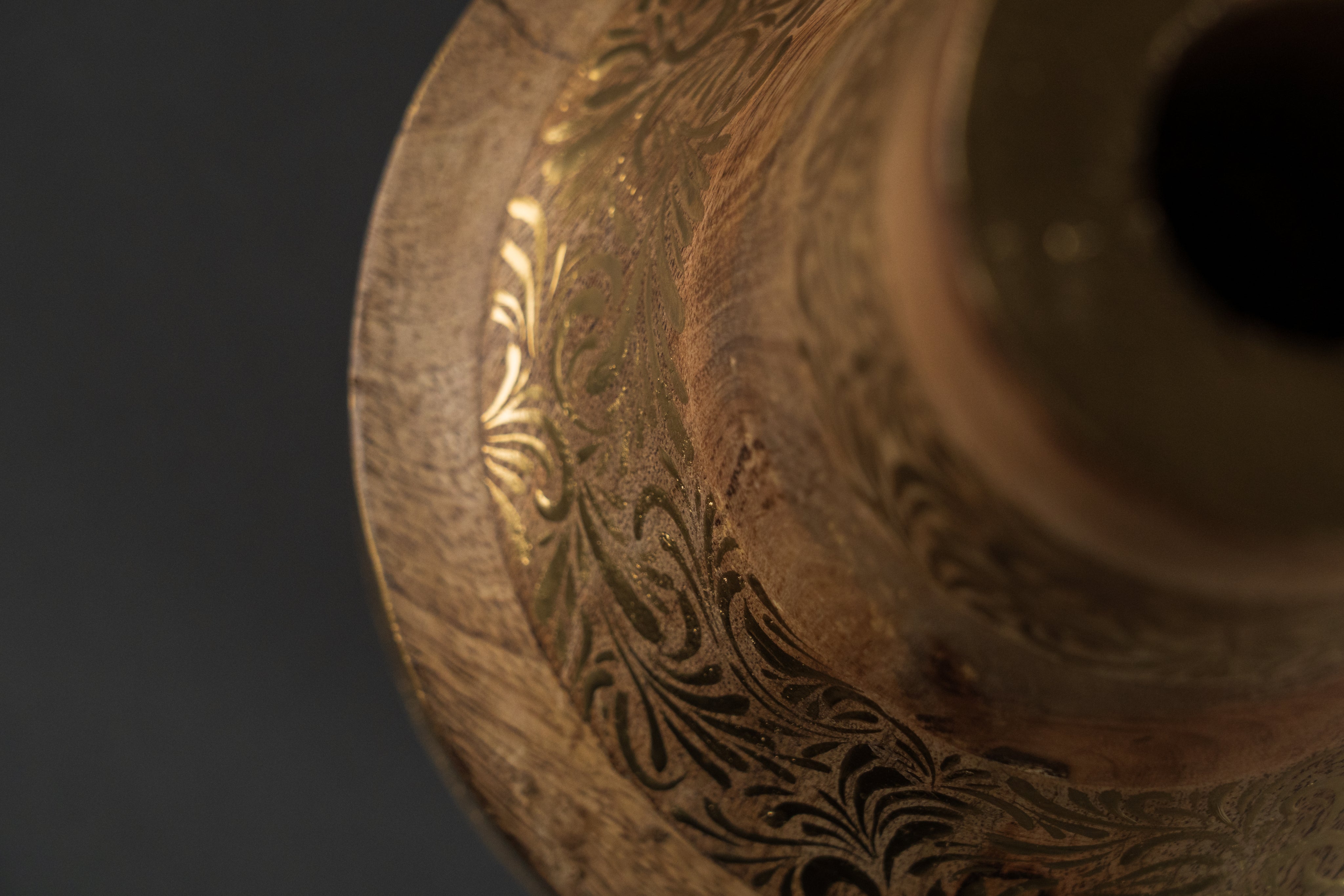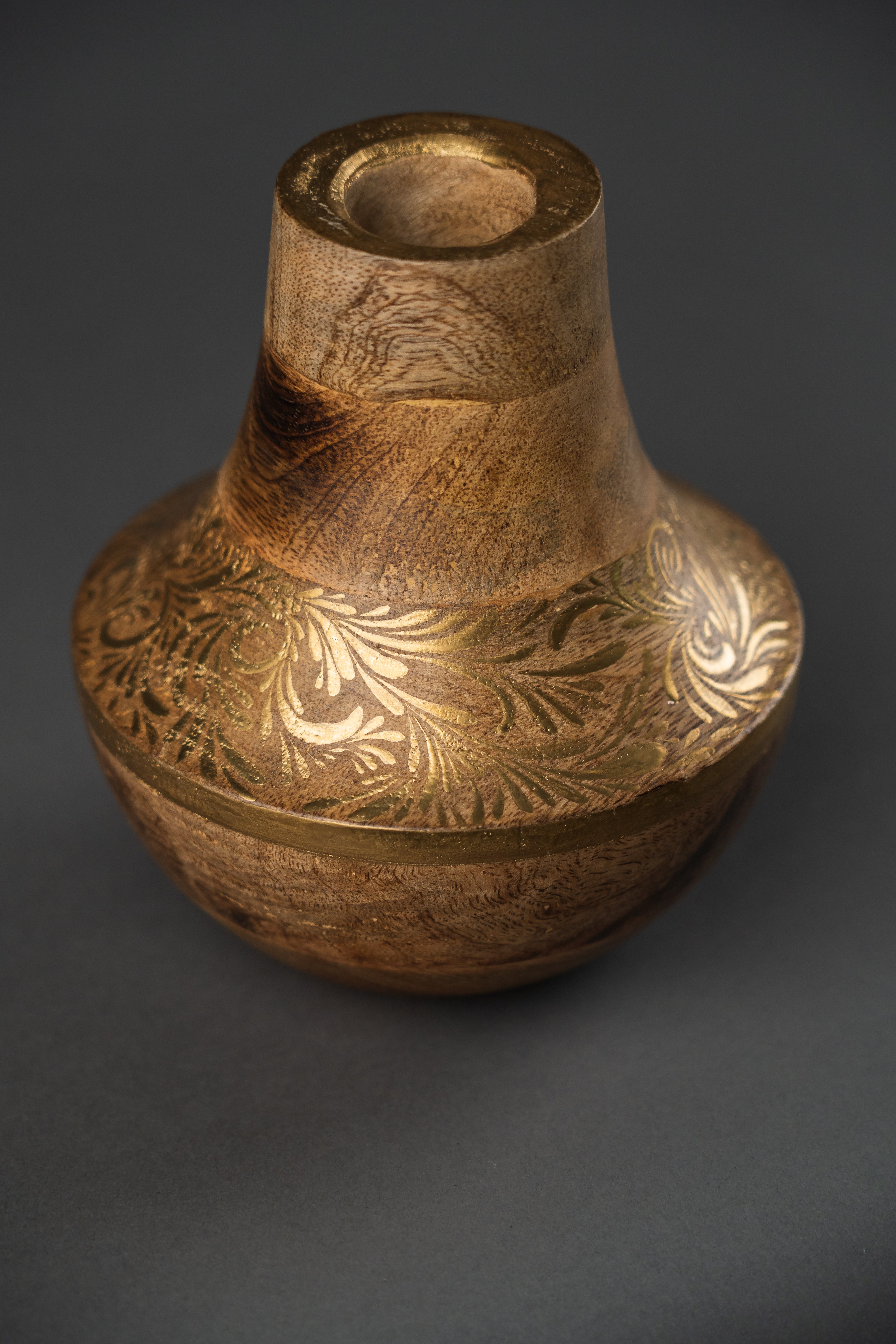 This handcrafted wooden vase combines the natural warmth of solid wood with elegant, gold-colored ornaments. Each unique piece is carefully turned and decorated by hand, making the vase an artistic focal point in your home.