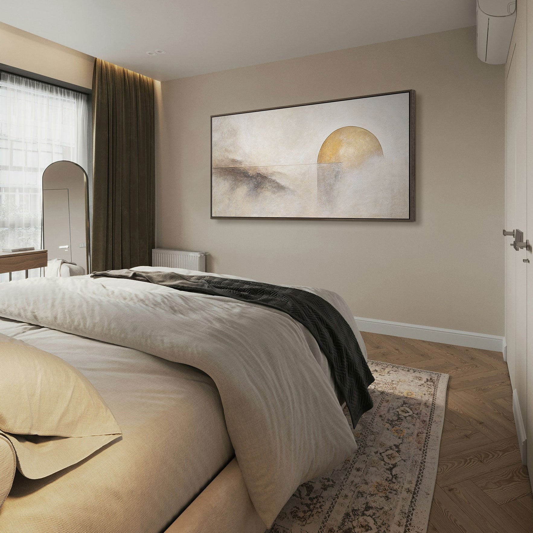 „Horizontlinie“ zeigt den Moment, in dem Licht und Erde miteinander verschmelzen. In sanften Beigetönen, gebrochenem Weiß und goldener Struktur entsteht eine ruhige, fast meditative Atmosphäre. Die Komposition erinnert an eine aufgehende Sonne über dem Meer, wo klare Linien und zarte Texturen in Balance stehen – dezent, modern und beruhigend zugleich.