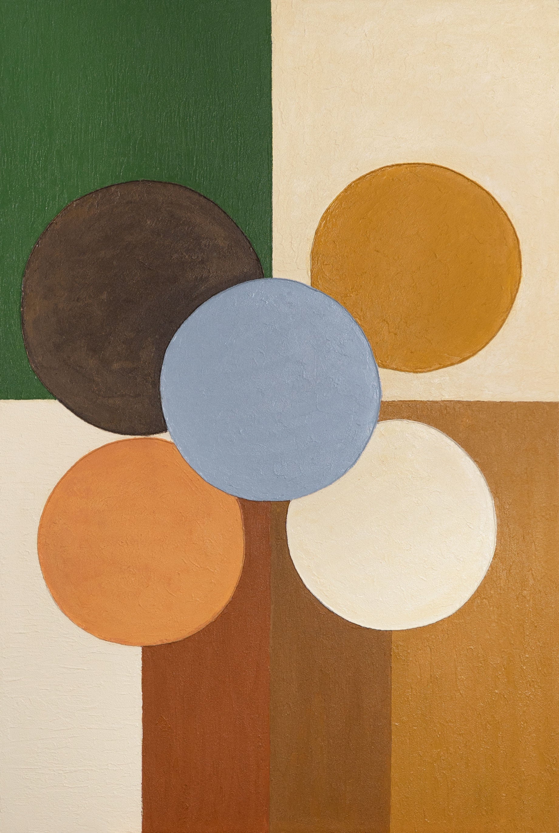 „Sphäre der Balance“ ist ein modernes, handgemaltes Acrylgemälde auf Leinwand, das mit seinen klaren geometrischen Formen und harmonischen Farbflächen fasziniert. Erdige Braun- und Beigetöne vereinen sich mit sanftem Grün, leuchtendem Orange und kühlem Blau zu einer Komposition, die Ruhe und Ausgeglichenheit ausstrahlt. Die strukturierte Oberfläche verleiht dem Werk Tiefe und ein einzigartiges haptisches Erlebnis.