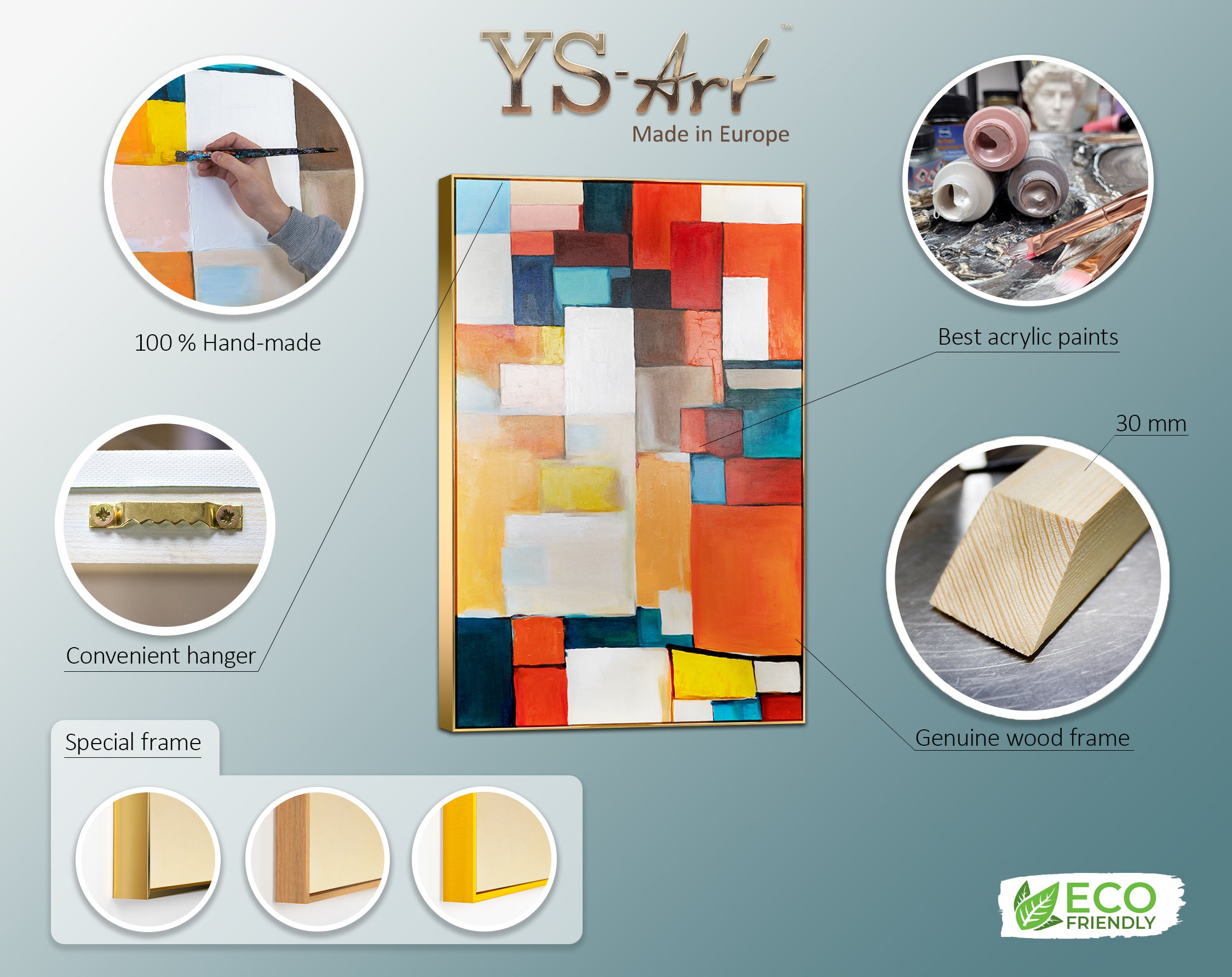 This modern living room mural is characterized by its vibrant colors and smooth texture, achieved through the use of high-quality acrylic paints. The included frame protects the artwork and makes it easy to hang. To keep your painting in the best condition, avoid direct sunlight and clean the surface gently with a dry, soft cloth.