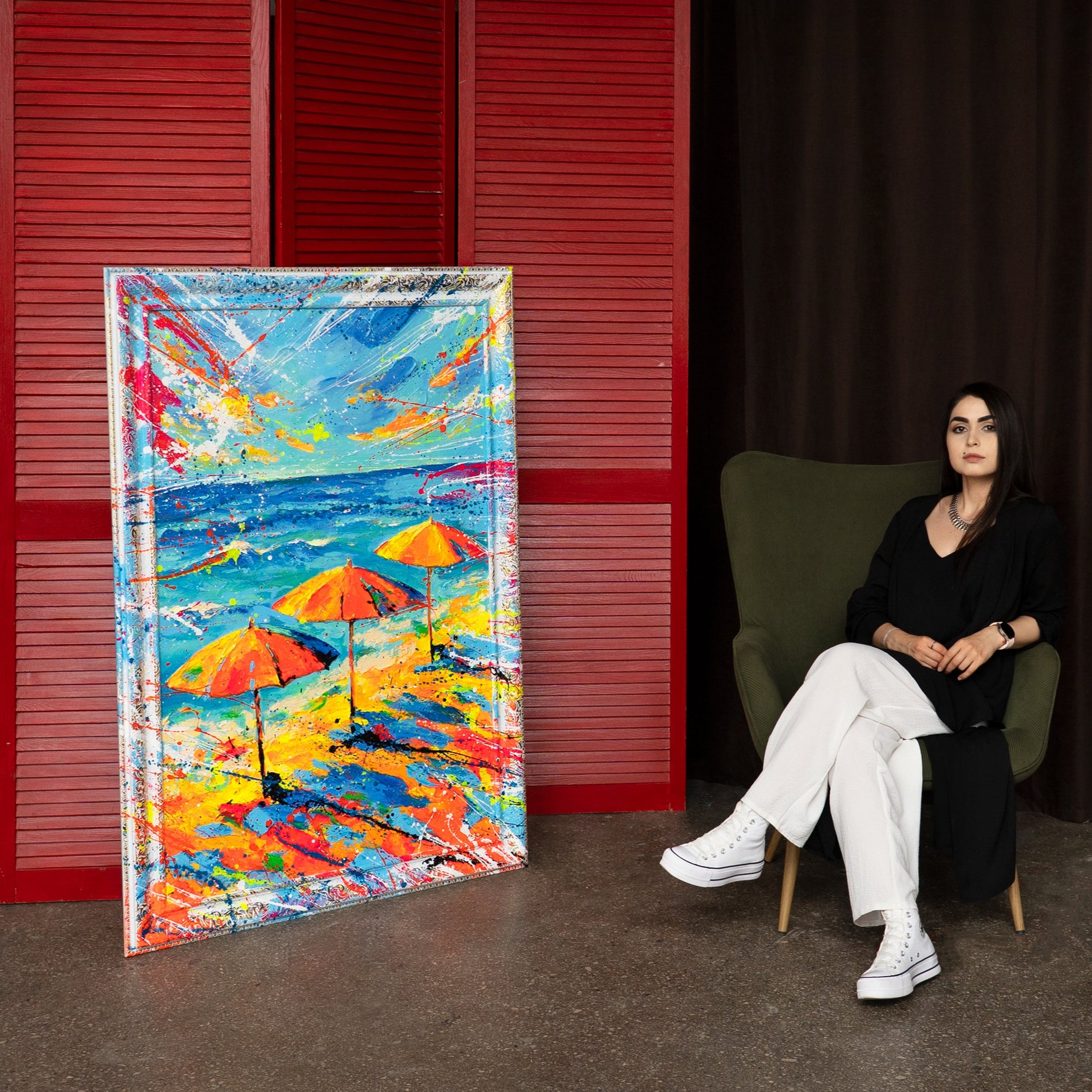 „In the Footsteps of the Sun“ depicts a radiant beach scene with three orange umbrellas blending rhythmically into the seaside landscape. The sky and waves are full of movement, while bold color explosions in red, blue, yellow, and green sweep across the entire canvas. This artwork radiates summer, freedom, and Mediterranean lightness.