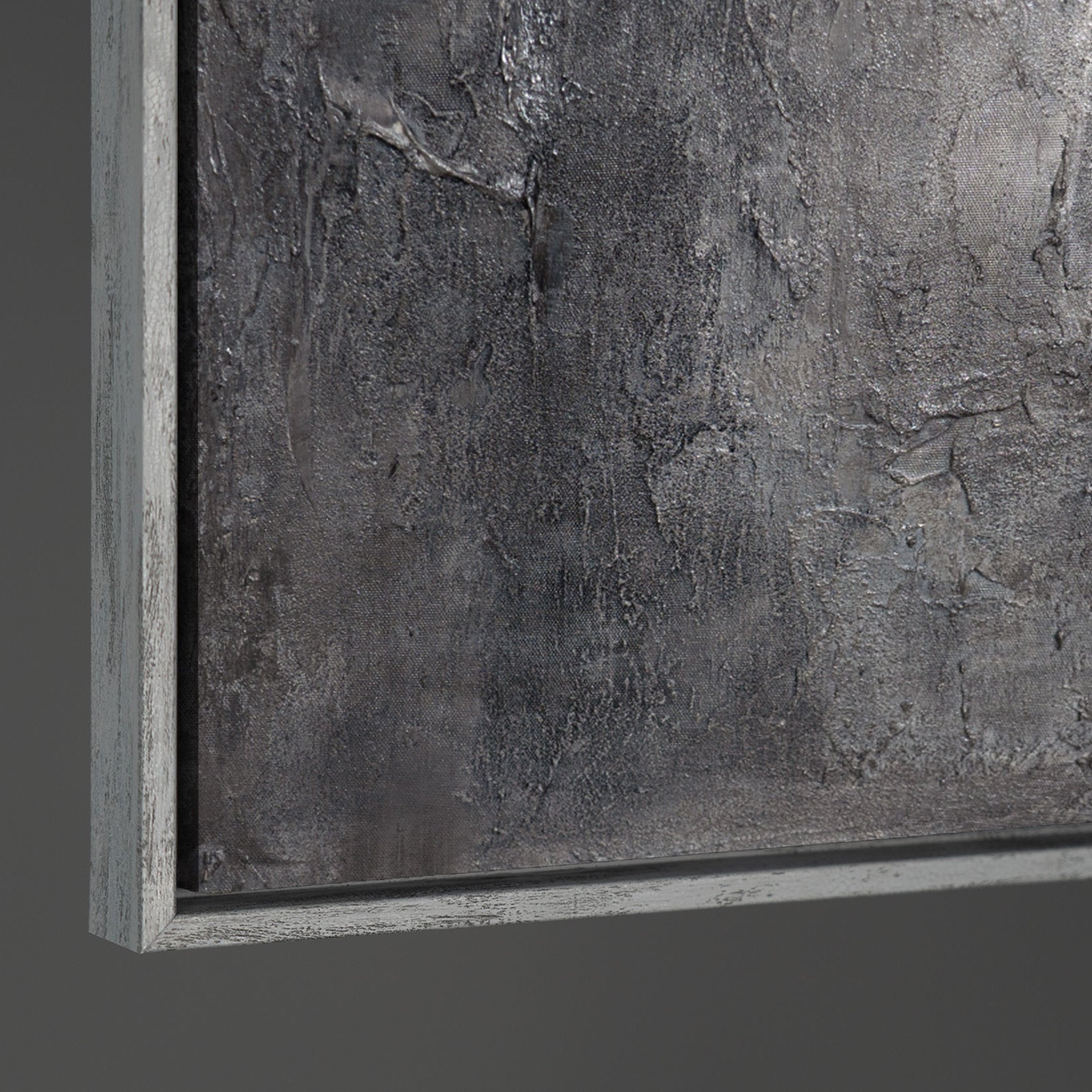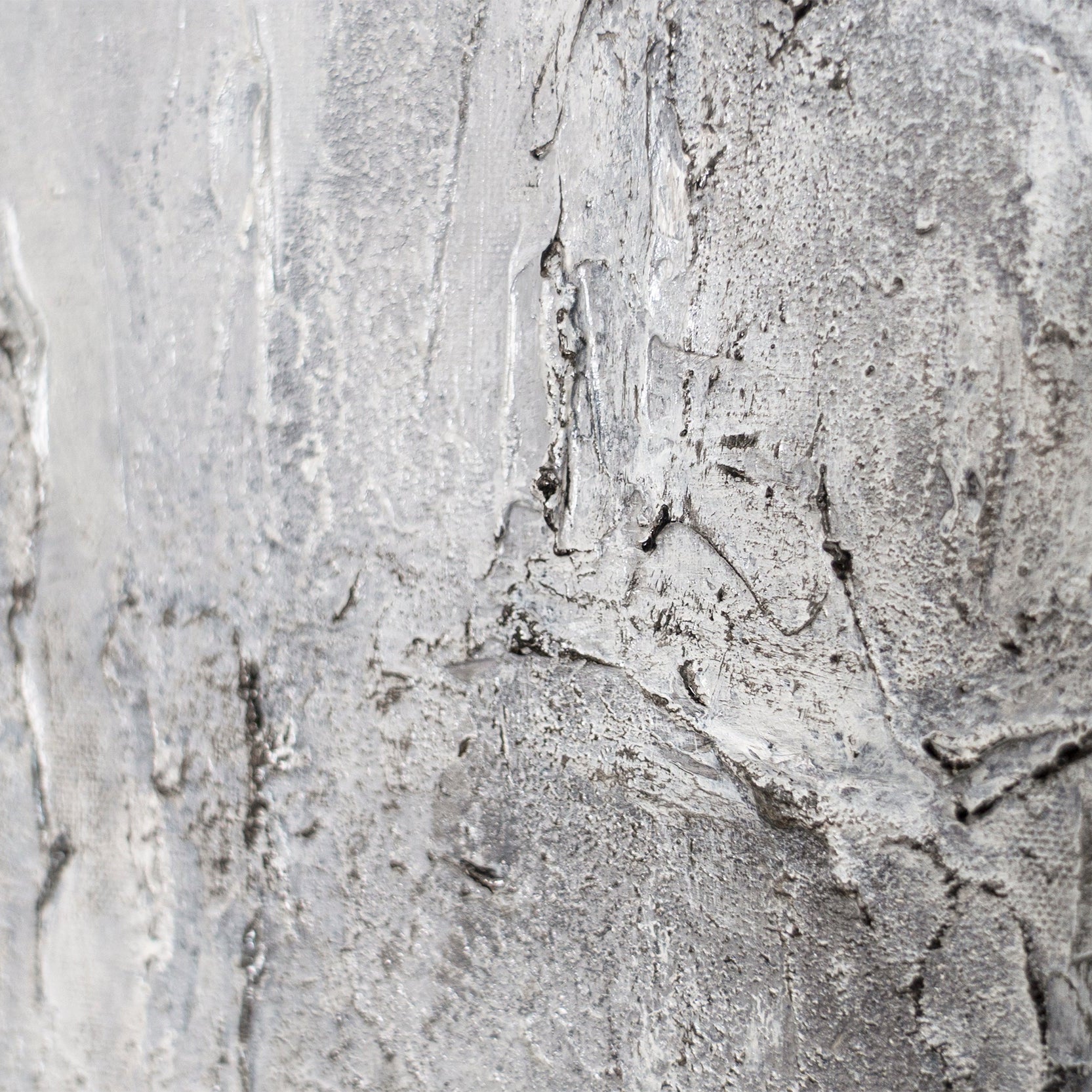 This abstract painting utilizes a multi-layered gray palette and a pronounced, stone-like texture. Irregular surfaces, subtle transitions, and deliberately visible structures create depth and a calm, material effect. The surface is reminiscent of natural rock formations, lending the work a restrained, timeless presence.