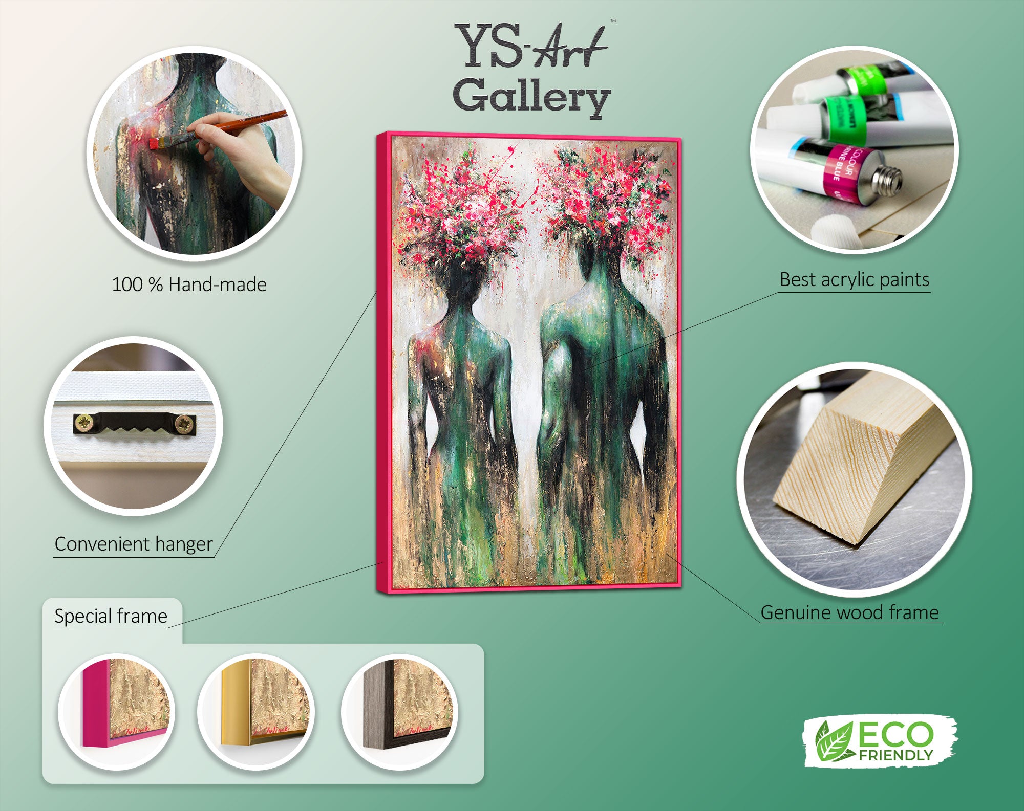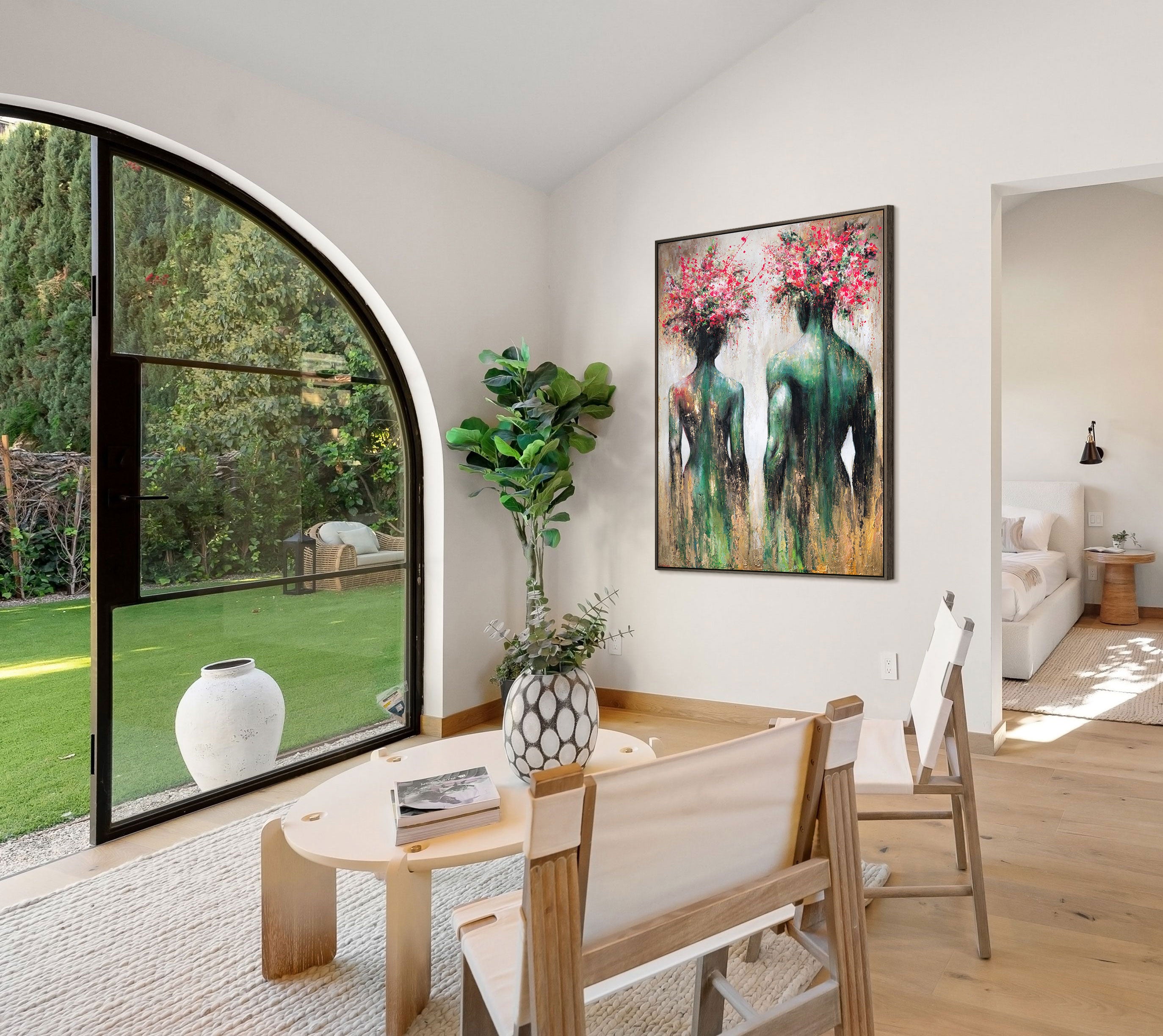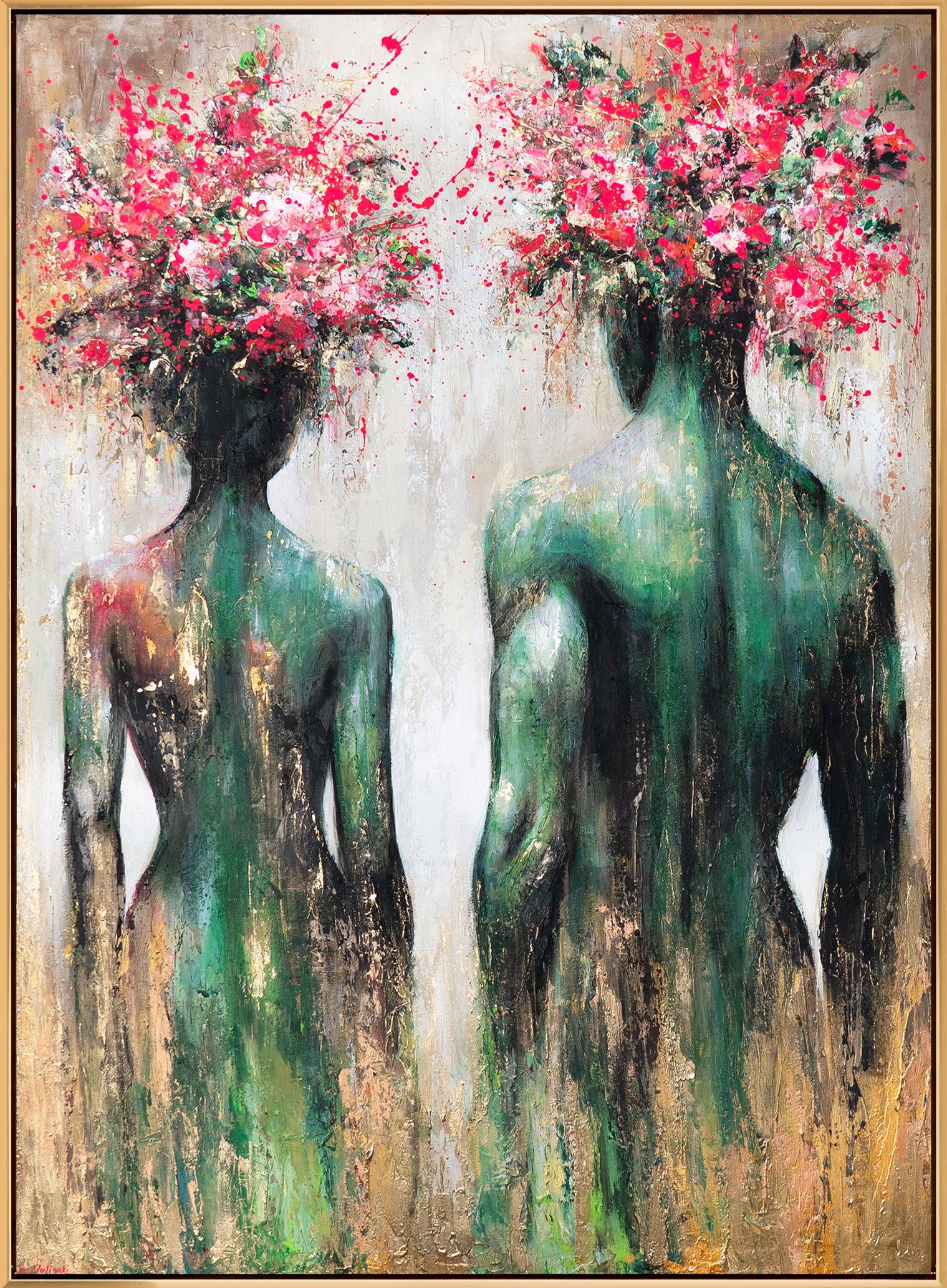 A piece of art that immediately catches the eye: Two elegant, abstract silhouettes, their heads transitioning into a fireworks display of vibrant red and pink flowers. The harmonious blend of rich greens, golden accents, and lively color splashes gives this canvas painting a special depth and energy.